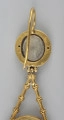 Consisting of two round parts connected by a double chain, the earring has decorations made using the micromosaic technique in round plaques. We can be astonished at the craftsmanship of these dainty pictures presenting a walking man holding an unidentified item, presumably used for farming purposes (the larger part) and the portrait of a woman in profile (the smaller part). The earring is part of a pair (cf. note Wil.5683/1); both form a set with a brooch (cf. note Wil.5682). Similar sets of jewellery decorated with pictures in the micromosaic technique were produced on an increased scale in the 19th century. When browsing catalogues of auction house websites, we can notice quite many examples of jewellery with micromosaic that present images of people dressed in traditional clothes. As Małgorzata Zając writes (M. Zając, A set of jewellery with micromosaic, in: The Wilanów collection. Continuation, 1993-2011, Warszawa 2011): ‘Mosaicists creating works with such motifs often drew inspiration from the output of Bartolomeo Pinelli (1771–1835) – a Roman engraver and illustrator who issued a few groups of engravings presenting scenes from rural life and traditional Italian outfits in the years 1809–1823.’