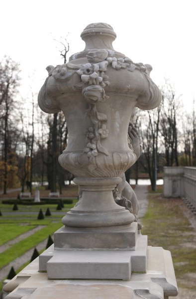 The sculptures decorating the balustrade of the retaining wall and the stairs connecting the upper and lower terraces of the Baroque Garden are the most historically and artistically valuable sculptural elements of the Wilanów gardens. Their authorship is associated with one of the most outstanding representatives of the Warsaw Rococo sculpture, sculptor Johann Chrisostom Redler, and his workshop. They include the allegories of the Four Seasons, which can also be interpreted as the four stages of human life, made in Kunów sandstone, as well as four pairs of putti, symbolizing the Stages of Love, a pair of putti with sphinxes and flower baskets and vases. These themes which stem from the ancient era were one of the favourite themes in the late Baroque era. The number four, which characterizes both cycles, was considered the symbol of durability and universality of the material world. Therefore, it was used to recreate the spatial and temporal aspects of the universe. Hence the four directions of the world, four elements, four wind directions and four seasons. Both the four stages of love: Courtship, Kiss, Fear, and Quarrel, as shown in the form of pairs of putti remaining in mutual, dynamic, expressive relationships, as well as the personifications of the Four Seasons, are subject to the relentless course of time, passing and changes, just like the surrounding garden. They are the reflection of the cyclically repeated periods both in nature and human life – from flowering to vegetation, from birth to death.