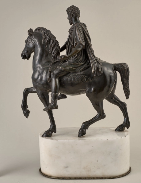 The statue is a reduced copy of the ancient Roman statue of Emperor Marcus Aurelius on horseback (height 424 cm) made in gilded bronze between 166 and 180, held in the Musei Capitolini. The emperor is depicted in the convention of an official representative portrait. He is seated on a palfrey horse, wearing a tunic and a cloak (paludamentum). His right hand is stretched forward, a gesture signifying the emperor's solemn address to the troops. Marcus Aurelius's head is in the type of his imperial portraits, which show him with a long, thoughtful face, surrounded by a beard of winding tendrils, with a characteristic hairstyle of a mass of curls falling on his forehead and temples. It is believed that the statue stood in the 10th century in the Lateran Square in Rome. In 1538, on the initiative of Pope Paul III, it was moved to the Capitoline Square and placed on a pedestal designed by Michelangelo. In 1981, it was moved to the Musei Capitolini, and a contemporary copy was placed in its place. It is the only wholly preserved antique equestrian statue. Interest in this work was evident throughout the modern era. Small copies made in bronze, plaster and gemstones were popular. The statue was an inspiration for many equestrian monuments, including the statue of Prince Józef Poniatowski made by Bertel Thorvaldsen in Warsaw. The creator of the Łańcut statue is Giuseppe Boschi, born in Rome around 1760, who died after 1821. He is known for his bronze statuettes famous in the 18th century, mainly copies of ancient sculptures. The statue comes from the Tarnowski family's art collection in the Castle in Dzików, from where it was taken over by the Museum in Łańcut in 1950. It is exhibited in the staircase leading to the second floor of the castle. Barbara Trojnar