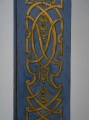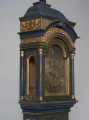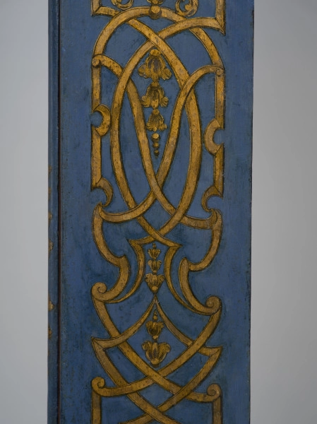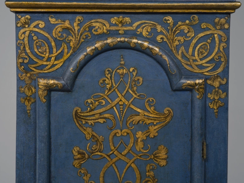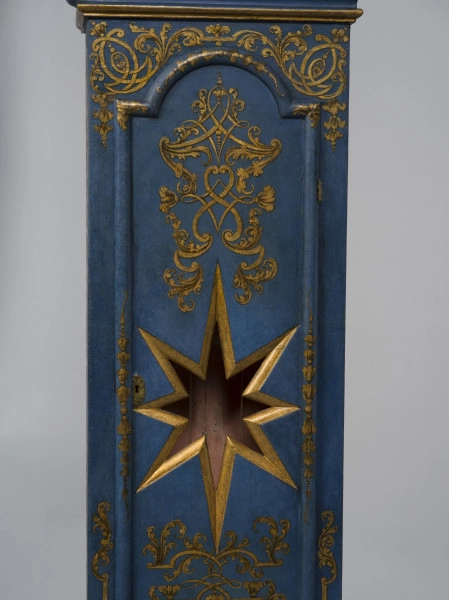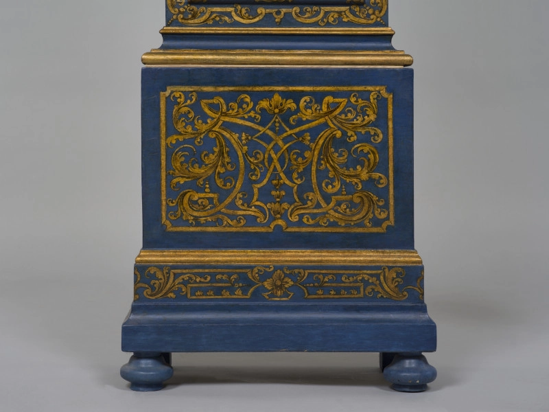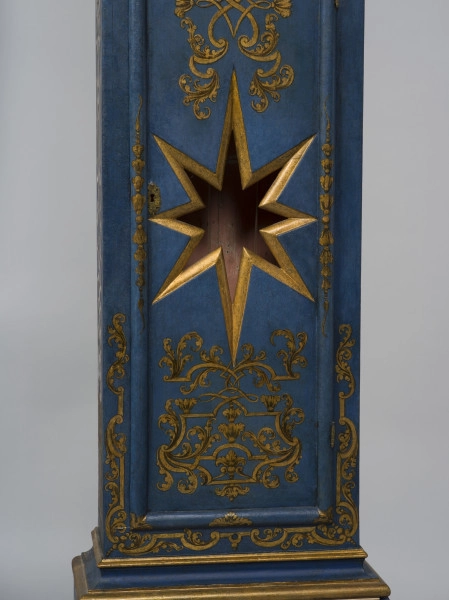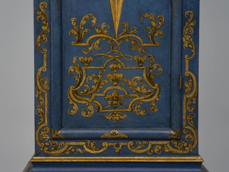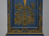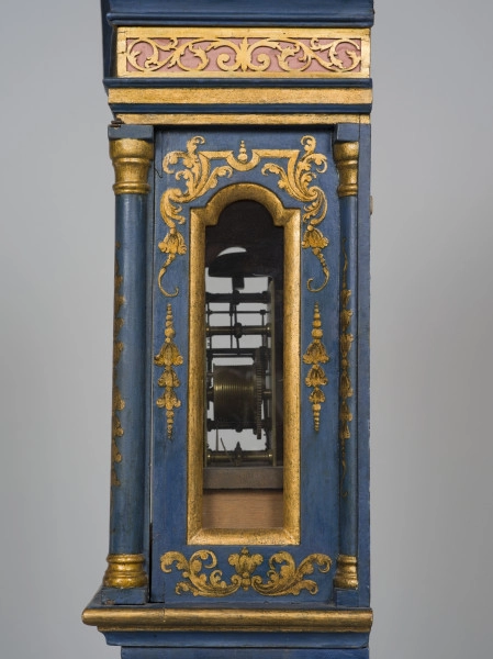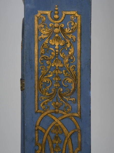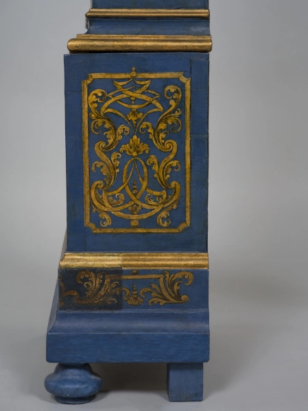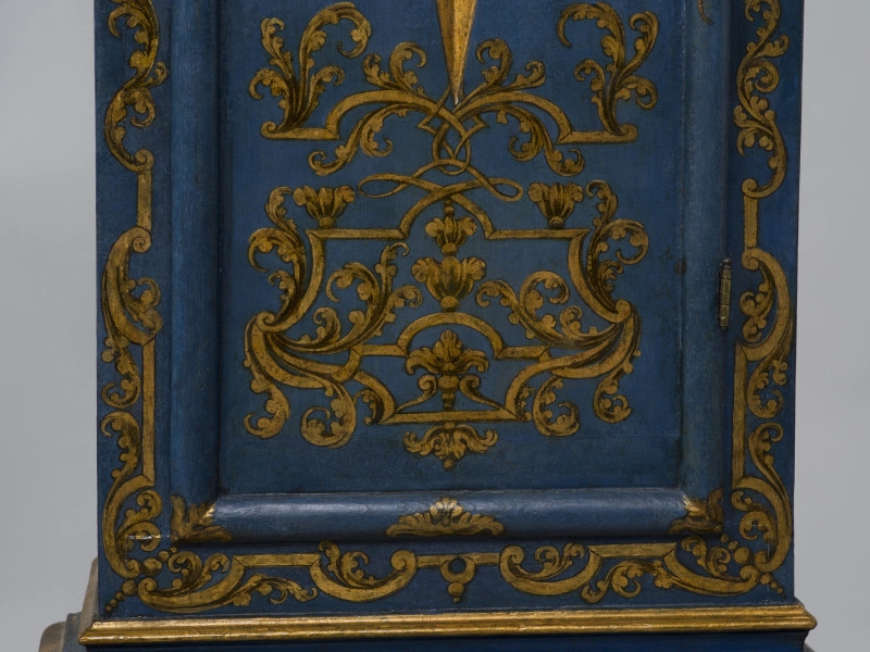 The overlapping hood topped with a semi-circle, with a half-dome decorated with a pinnacle, with a glazed door and two side peep-holes houses the mechanism with the dial. The slender cabinet shaft, also with a door and a high pedestal on four legs, is the place for the long pendulum and weights. The outer surfaces of the cabinet, painted navy blue, are decorated with a rich gilded ribbon and band ornament, with acanthus elements imitating marquetry compositions.