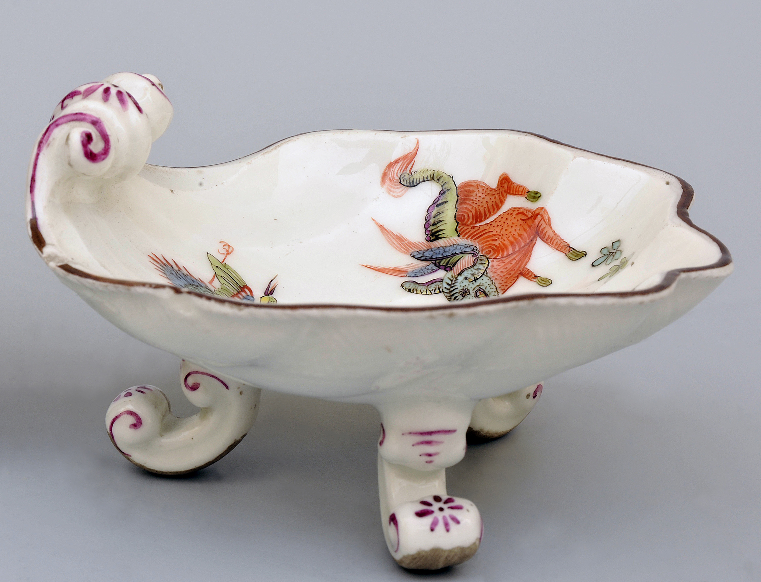 Niewielka porcelanowa miseczka - solniczka o kształcie przypominającym muszlę, wsparta na trzech wygiętych nóżkach. Wnętrze muszli zostało podzielone na dziewięć pasów wypukłych od spodu, a wklęsłych w środku konchy. Zewnętrzną ściankę zdobi reliefowa plecionka mającą przypominać ściankę kosza. Motyw ten został zaprojektowany w manufakturze miśnieńskiej w latach 1735-1737, na potrzeby wielkiego serwisu obiadowego znanego dziś pod nazwą Serwisu Sułkowskiego. Później zyskał dużą popularność i stosowano go także w kolejnych projektach, obecnie znany jest pod nazwą reliefu Sułkowski-Ozier.