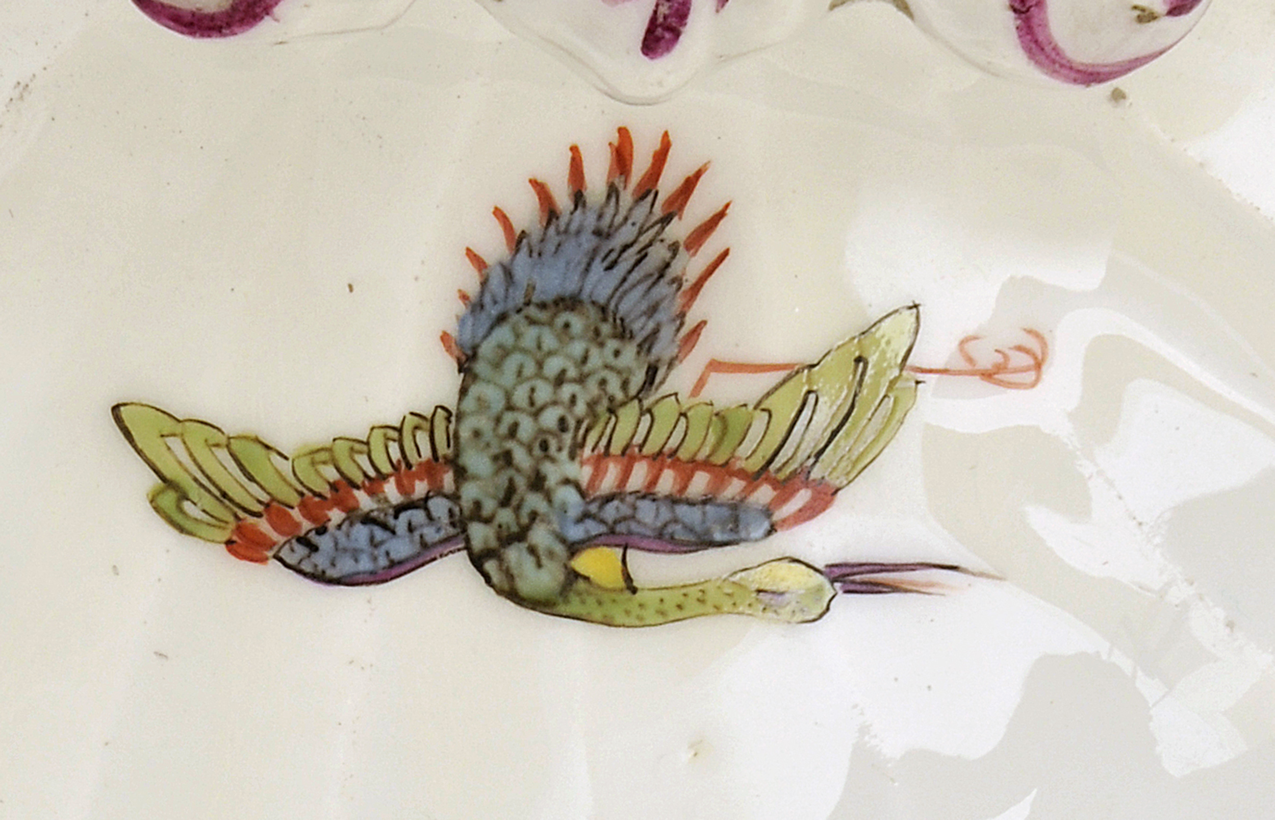 Zdobienie reliefowe solniczki jest jednak głównie tłem dla wspaniałej dekoracji malarskiej. Tradycyjnie wzór ten, inspirowany wyrobami dalekowschodnimi nazywany jest „ze skrzydlatym smokiem”. Na chińskich naczyniach często pojawiał się mityczny smok qilin, któremu zwykle towarzyszył feniks. Motyw ten został przeniesiony na naczynia miśnieńskie, jednak ze znacznymi zmianami. Barwny feniks zamienił się w swojską czaplę, zmianom uległ także wygląd samego smoka. Równowagi kompozycji nadaje umieszczony po lewej stronie krzew z wielobarwnymi kwiatami i owadem pod nim. Nie jest pewne, kiedy i na czyje zamówienie chińskie quiliny pojawiły się po raz pierwszy na miśnieńskich wyrobach, pojawiają się jednak na nich dość często od lat 30. XVIII wieku.