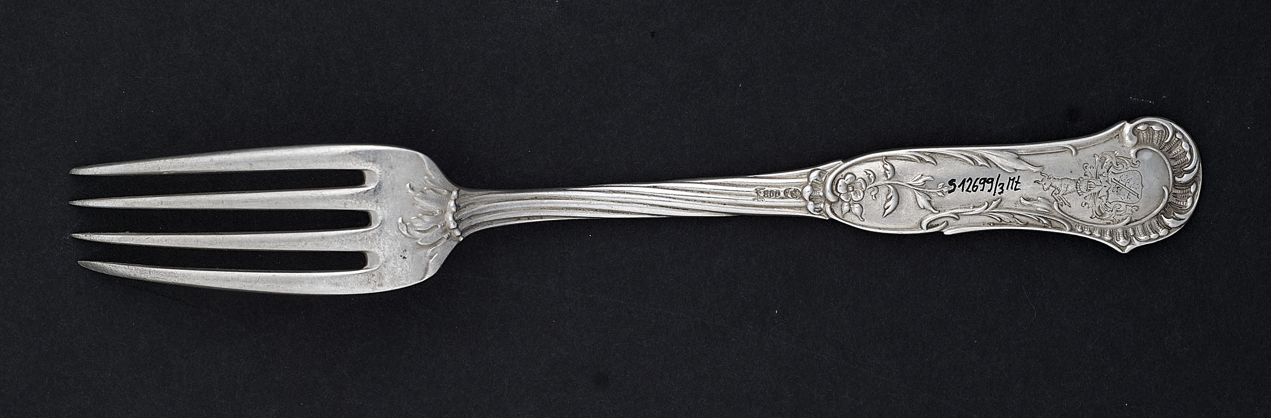 Widelec pochodzi z kompletu na sześć osób liczącego łącznie 36 elementów. W jego skład poza sześcioma widelcami stołowymi wchodzi: