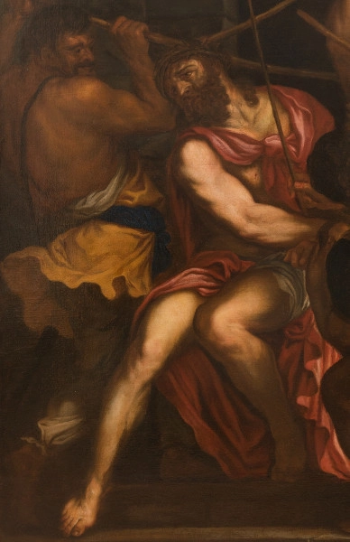Oryginał Tycjana zachwyca doskonałością zestawień kolorystycznych, których nie oddaje kopia (powstałą przypuszczalnie na podstawie grafiki). Zachowuje jednak ciekawy zamysł kompozycyjny, w którym zwielokrotniony motyw laski przecina gmatwaninę postaci niczym uderzenia noża, tworząc trójkąt trynitarny na prawo od głowy Chrystusa. Niepozorny rekwizyt, porzucona na pierwszym planie na stopniach nieużywana laska - nieruchoma, pozbawiona cienia i zabójcza jak wąż – przyciąga uwagę, świadczy o niesamowitym talencie artysty do nawiązania interakcji z widzem, stawiając go w obliczu egzystencjalnego dylematu poprzez pozostawienie mu decyzji o powiększeniu grona oprawców.