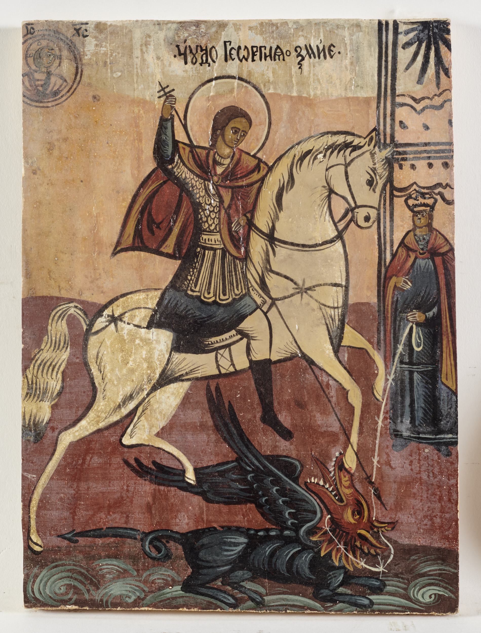 Święty Jerzy należy do grona Wojowników Męczenników, powszechnie czczonych na całej Rusi. Pochodził z Kapadocji, był dowódcą woskowym i chrześcijaninem. Poddany torturom w czasach cesarza Dioklecjana nie wyrzekł się wiary i został ścięty mieczem w 303 r. Jego ciało pochowano w Liddzie Palestyńskiej, a głowę złożono w Rzymie. Rozwijający się we wschodnim i łacińskim chrześcijaństwie kult Świętego przyczynił się do powstawania licznych obrazów. Początkowo ukazywany jako męczennik, a od czasu popularyzacji legendy o poskromieniu smoka, obrazowany od XI w. w rzymskim stroju żołnierskim, z włócznią i tarczą, niekiedy z mieczem jako zwycięzca nad upostaciowionym złem. Według legendy, niedaleko miejsca spoczynku Męczennika, zamieszkał pożerający ludzi gad. Nie mającym znikąd ratunku mieszkańcom królestwa przybył na pomoc konno, uzbrojony we włócznię z krzyżem Święty Jerzy i poskromił potwora. W ten sposób uratował od śmierci królewnę, która uwiązała bestie na pasku od sukni i zaprowadziła do miasta, gdzie na oczach króla Święty przebił go mieczem. Często, w górnym rogu ikony obrazującej św. Jerzego ukazuje się Prawica Boża (na prezentowanej ikonie Chrystus Emanuel) i anioł trzymający męczeńską koronę.