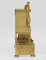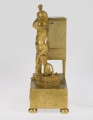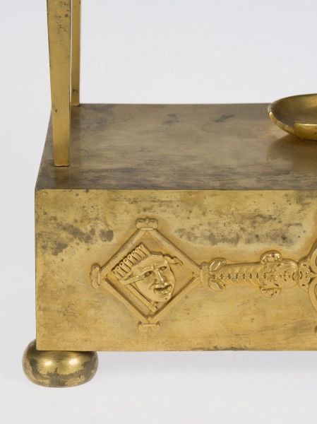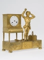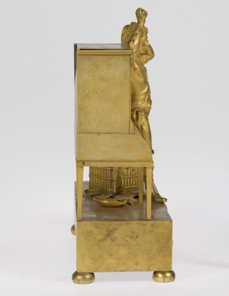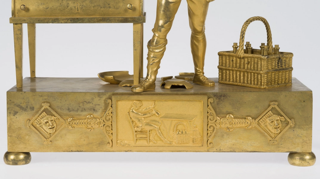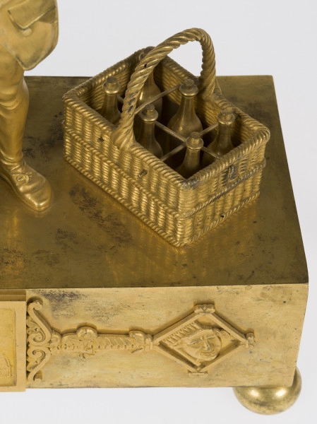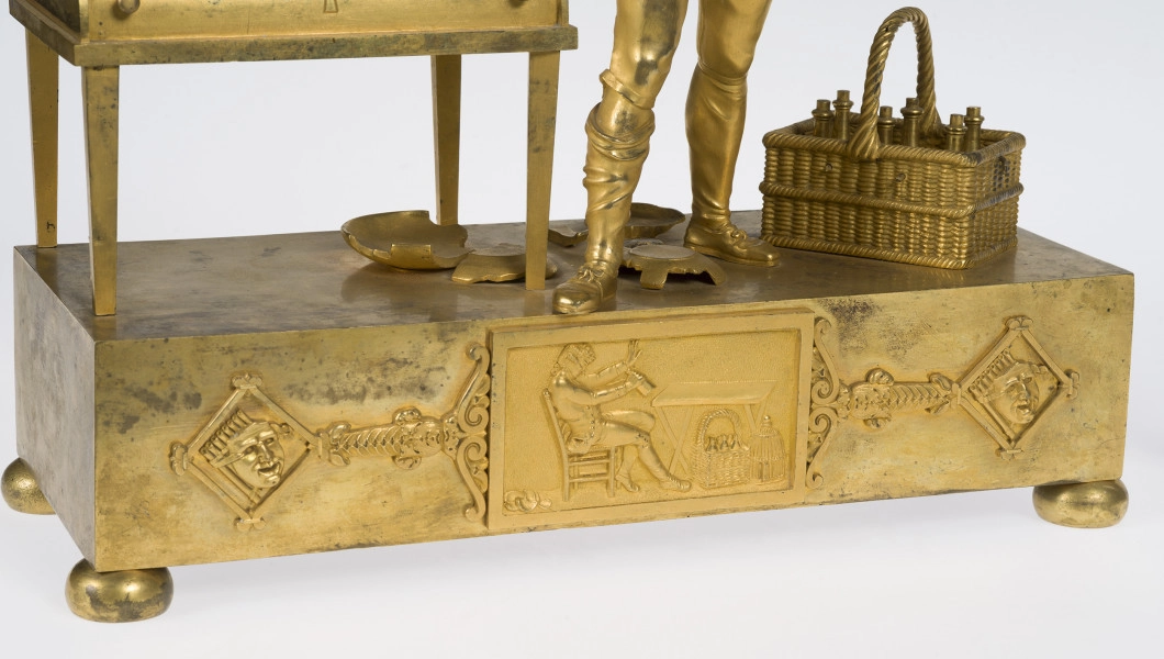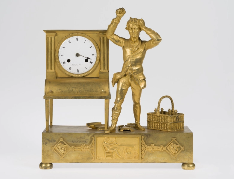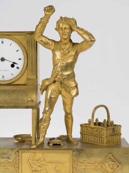 Na dekorowanym ornamentem empirowym cokole wspartym na czterech spłaszczonych kulach ustawiony jest sekretarzyk, w którego przednią ściankę wmontowano okrągłą tarczę zegarową. Obok mebla stoi młody mężczyzna gwałtownie gestykulujący w rozpaczy. U jego stóp z jednej strony stoi kosz z butelkami, z drugiej strony leżą potłuczone talerze.
