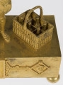 Prostokątna plakietka z reliefową scenką rodzajową, umieszczona na przedniej ściance cokołu uzupełnia, przedstawiając mężczyznę siedzącego przy pustym stole z koszem butelek i antałkiem. Całość przedstawienia zawiera przestrogę - czas pijackiej libacji jest czasem straconym, niesie tylko zniszczenia. Nie zachował się mechanizm zegara. Pozostała z niego jedynie okrągła tarcza wmontowana w szafkę sekretarzyka, z oznakowaniem minut, godzin i sygnaturą zegarmistrza. W wewnętrznym kręgu tarczy widnieją dwa otwory naciągowe.
