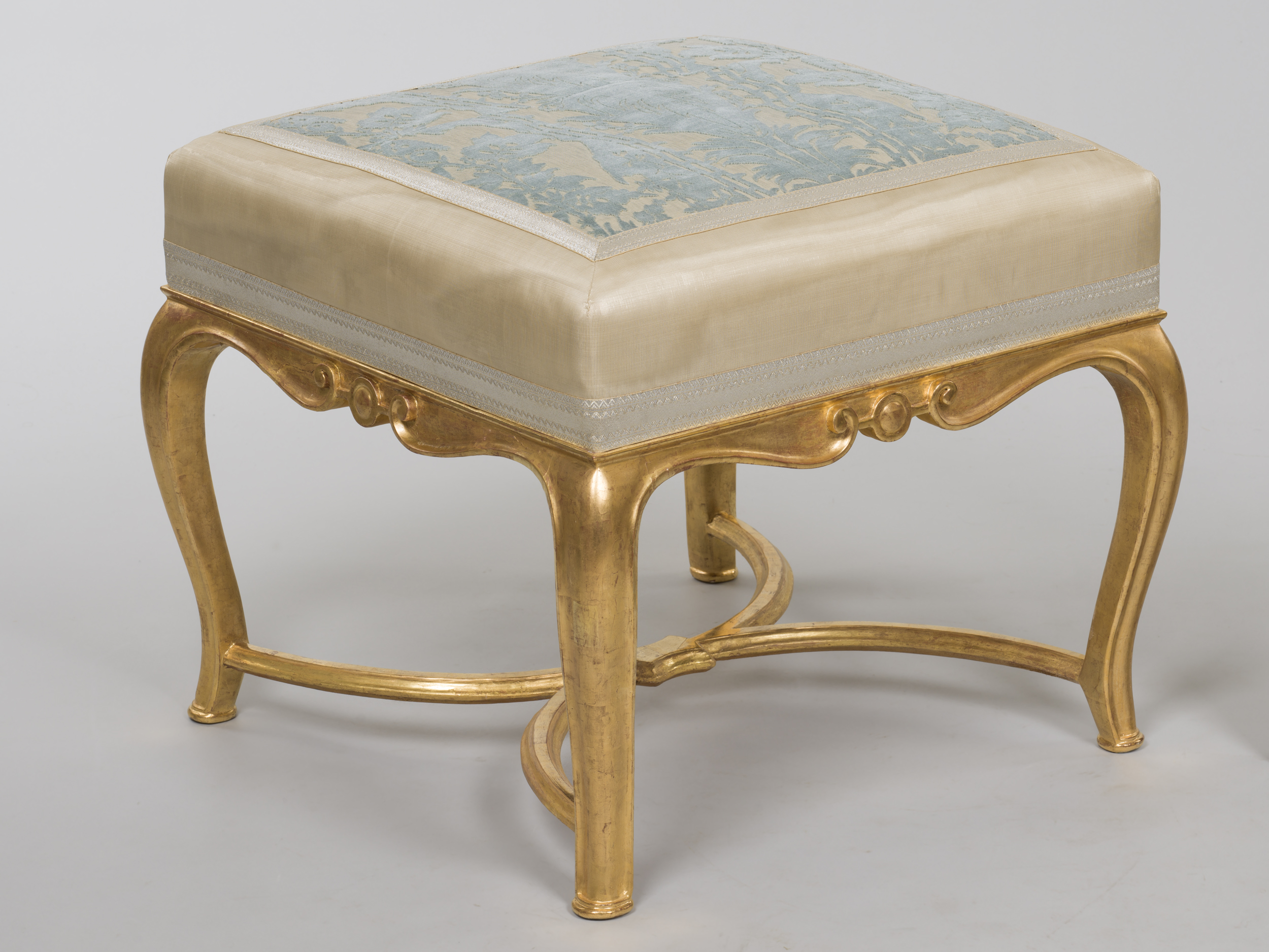 Taboret o kwadratowym siedzisku na czterech wygiętych esowato nogach „cabriole” z płaskimi stopkami, połączonych u dołu wiązaniem w kształcie antytetycznie połączonych liter Ɔ C przywodzących skojarzenie z monogramem rodziny Czartoryskich właścicieli Wilanowa w latach 1729-1750. Analogiczny monogram umieszczony jest na osiemnastowiecznej lektyce Czartoryskich zachowanej w zbiorach wilanowskich. Gładkie, złocone powierzchnie konstrukcji taboretu obwiedzione są na krawędziach nóg delikatnym półwałkiem płynnie przechodzącym w lekko sfalowaną krawędź kargi zdobioną na osi boków okrągłymi medalionami. Siedzisko z wysoką płaską poduszką pokryte jest tkaniną obszytą galonem.