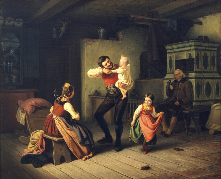 Rodzina tyrolska. Ojciec tańczący z małym dzieckiem na ramieniu