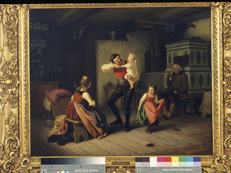 Przedstawiając szczegółowo umeblowanie i wyposażenie chłopskiej izby Most odwołuje się do tradycji holenderskiego malarstwa XVII wieku, jednocześnie dokumentując współczesne mu obyczaje i modę panującą w bawarskich czy też tyrolskich wsiach i małych miasteczkach. W źródłach archiwalnych obraz został odnotowany jako Rodzina tyrolska. Ojciec tańczący z małym dzieckiem na ramieniu, wraz z informacją, że wkrótce po powstaniu (ok. 1846) został sprzedany do Hamburga. Do zbiorów szczecińskich trafił ponad 150 lat później – w 2008 roku został zakupiony w Monachium za pośrednictwem Domu Aukcyjnego Ruef.