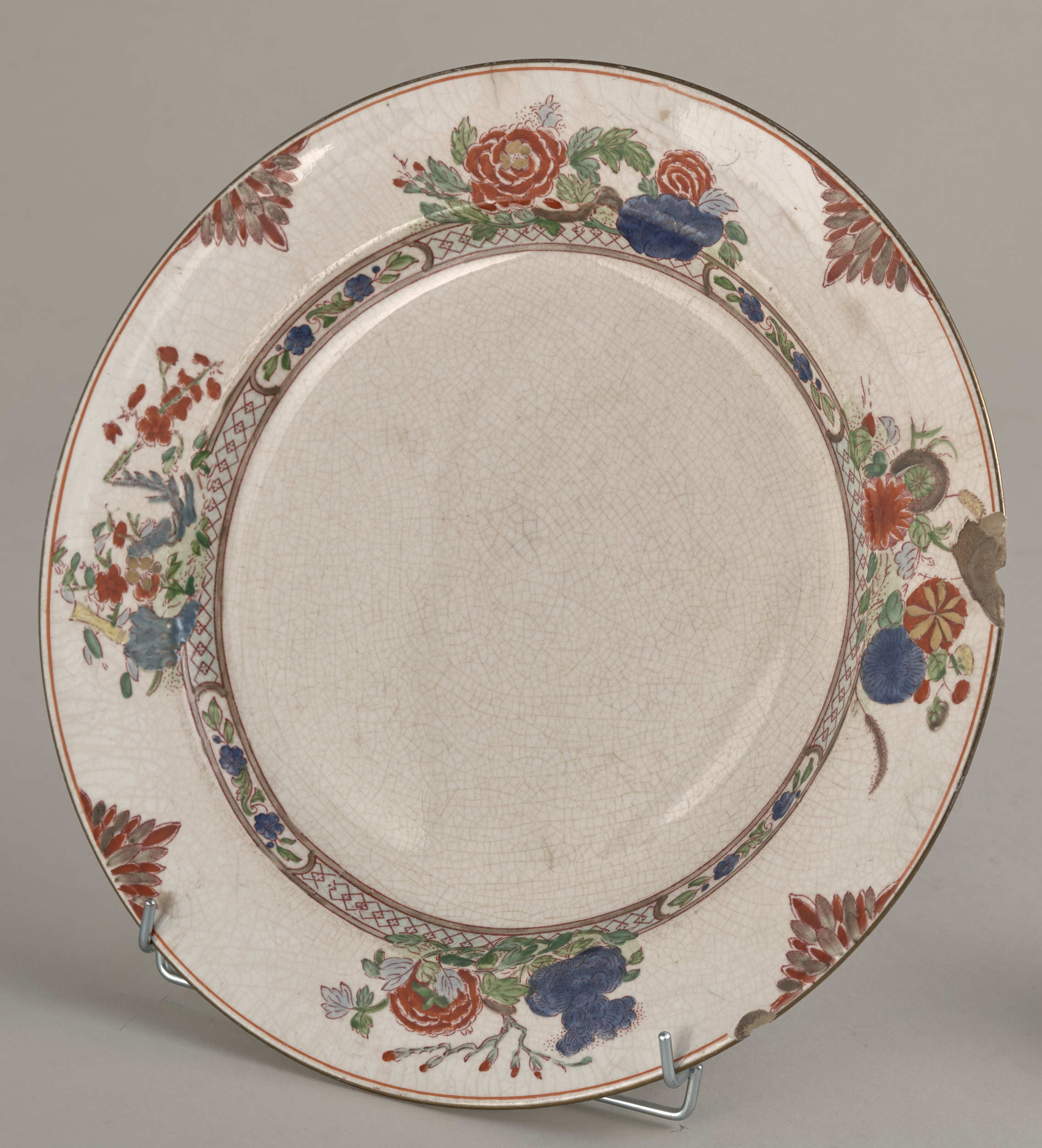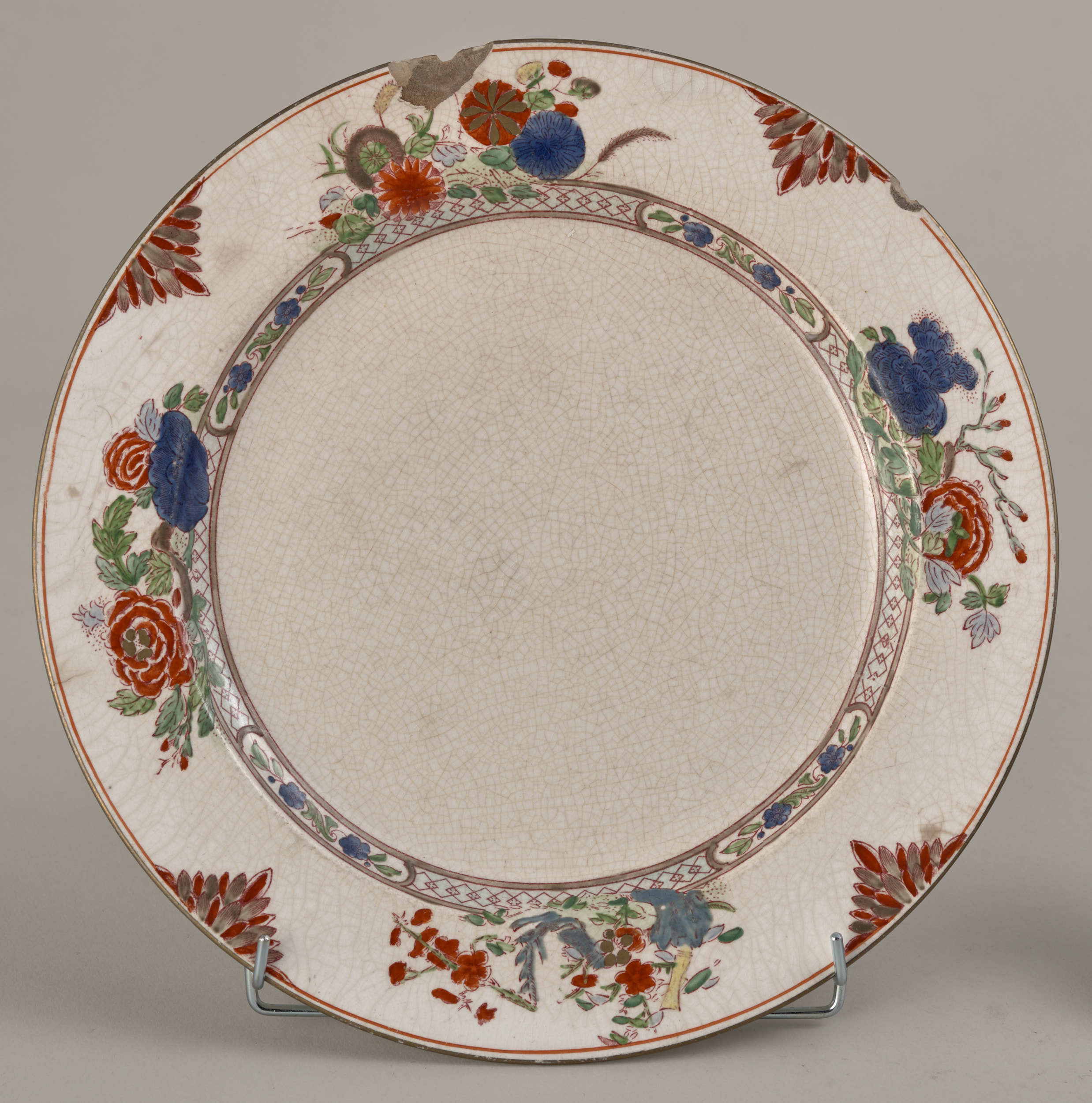 Talerz płytki z dekoracją chinizującą Talerz płytki, fajansowy o lekko kremowym odcieniu, pokryty siatką ozdobnych spękań szkliwa, zdobiony dekoracją malarską w typie dalekowschodnim o motywach roślinno – geometrycznych, a skoncentrowaną w partii kołnierza. Szczegółowy rysunek wzoru dekoracji naniesiony drukiem w kolorze purpurowym, następnie już na szkliwie- ręcznie podmalowany farbami w kilku kolorach: rdzawa czerwień, ciemnoniebieski, zielony, piaskowo-beżowy. Natomiast w mniejszości użyto farb w kolorach: jasnoniebieskim, stalowozielonym, seledynowym i żółtym. Na dekorację tę składa się pas ornamentu geometrycznego z motywem rombów, biegnący tuż pod krawędzią wrębu, następnie cztery duże kompozycje kwiatowo-roślinne, a jedno z nich z motywem połamanego krzewu, rozmieszczone na kołnierzu, blisko pasa ornamentu. Kompozycje te rozdzielone są liściastymi półrozetami. Złoto znajduje się jedynie w pasku lamującym brzeg kołnierza i drobnych elementach trzech kwiatów w dużych kompozycjach. Odwrocie talerza pokryte jest pod szkliwem szarymi plamkami. Widoczne oznakowania: w centralnym punkcie litera „B”, sygnatura fabryki „BOOTHS” – obydwa znaki stemplowane w masie i duża pieczęć drukowana podszkliwnie w kolorze bordowym: „MANUFACTURED FOR:/A.LA.PAIX,/34.AVENUE DE L’OPERA, /PARIS./IMPORTE D’ANGLETERRE”. Pod nią napis z aktualnym nr inwen. Anglia, Hanley, XIX w.