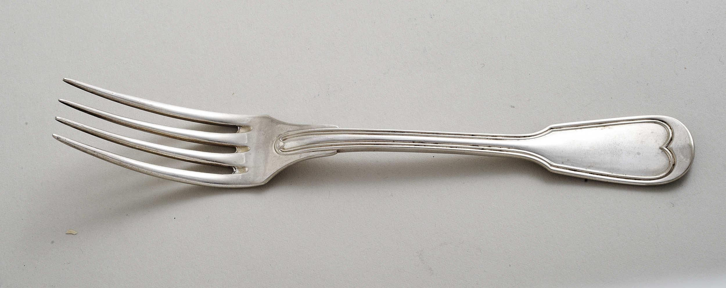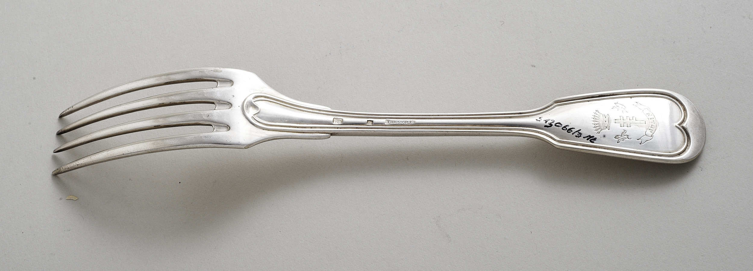 Czterozębny widelec stołowy posiada płaski trzonek z rozszerzonym zakończeniem ozdobiony podwójnym profilowaniem. Na rewersie w dolnej części trzonka widoczna jest korona hrabiowska a pod nią herb Potockich - Pilawa. Po bokach symetrycznie rozmieszczone litery R i P a pod herbem widoczna szarfa z napisem „Julin”. Ponadto na przewężeniu trzonka, od spodu wybito punce i stempel producenta „Christofle”.