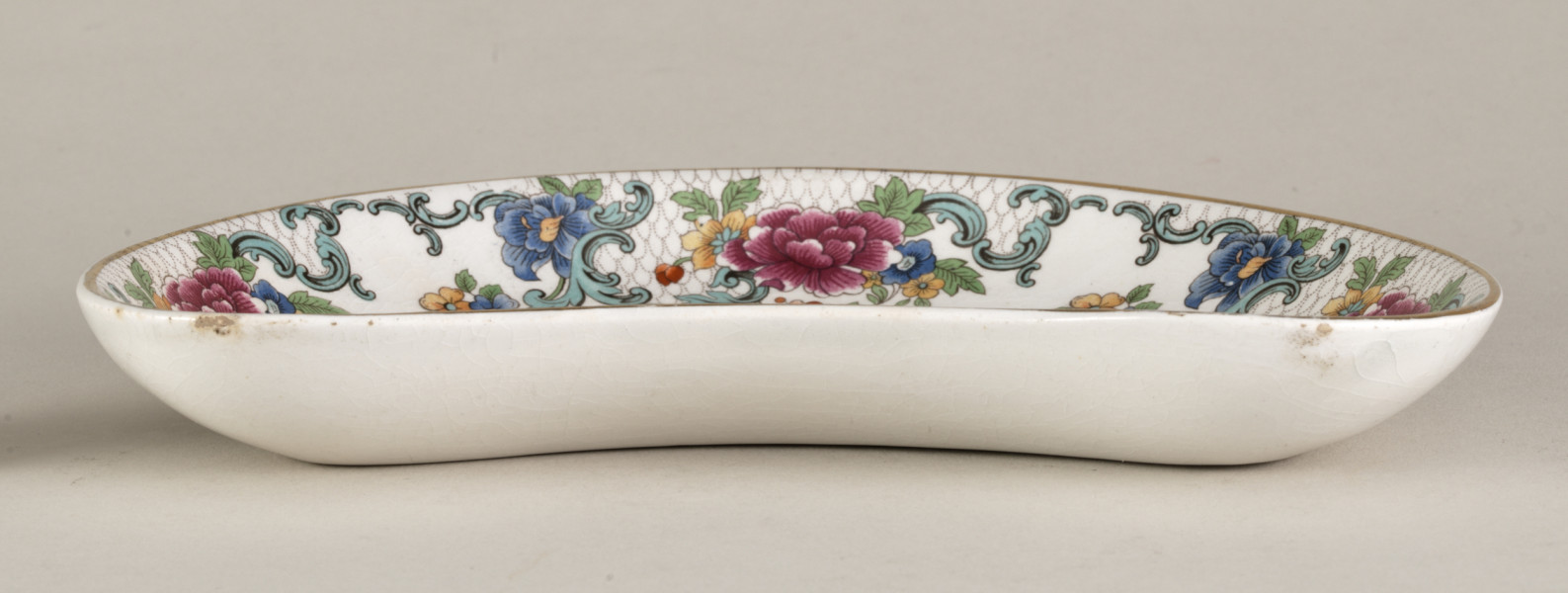 Płytki talerzyk o małych rozmiarach, wykonany z białego fajansu, służący do podawania przystawek obiadowych. Kształt naczynia nawiązuje do rynienki w formie nerki lub półksiężyca. Obiekt zdobiony wielobarwną kalkomanią, złożoną z czterech jednakowych, asymetrycznych kompozycji roślinnych, odpowiednich sztuce rokoko lub dalekowschodniej. Elementy te łączą się ze sobą, złożone są detali w kolorze morskiej zieleni, pośród której wplatają się dwie duże piwonie koloru różowego. Dookoła żółte i niebieskie kwiaty z liśćmi w kolorze jasnej zieleni. Pomiędzy nimi, a brzegiem talerzyka delikatny wzór siatki z wydłużonymi oczkami, zaznaczonymi drobnymi brązowymi punktami. Brzeg talerzyka obwiedziony złotą lamówką.