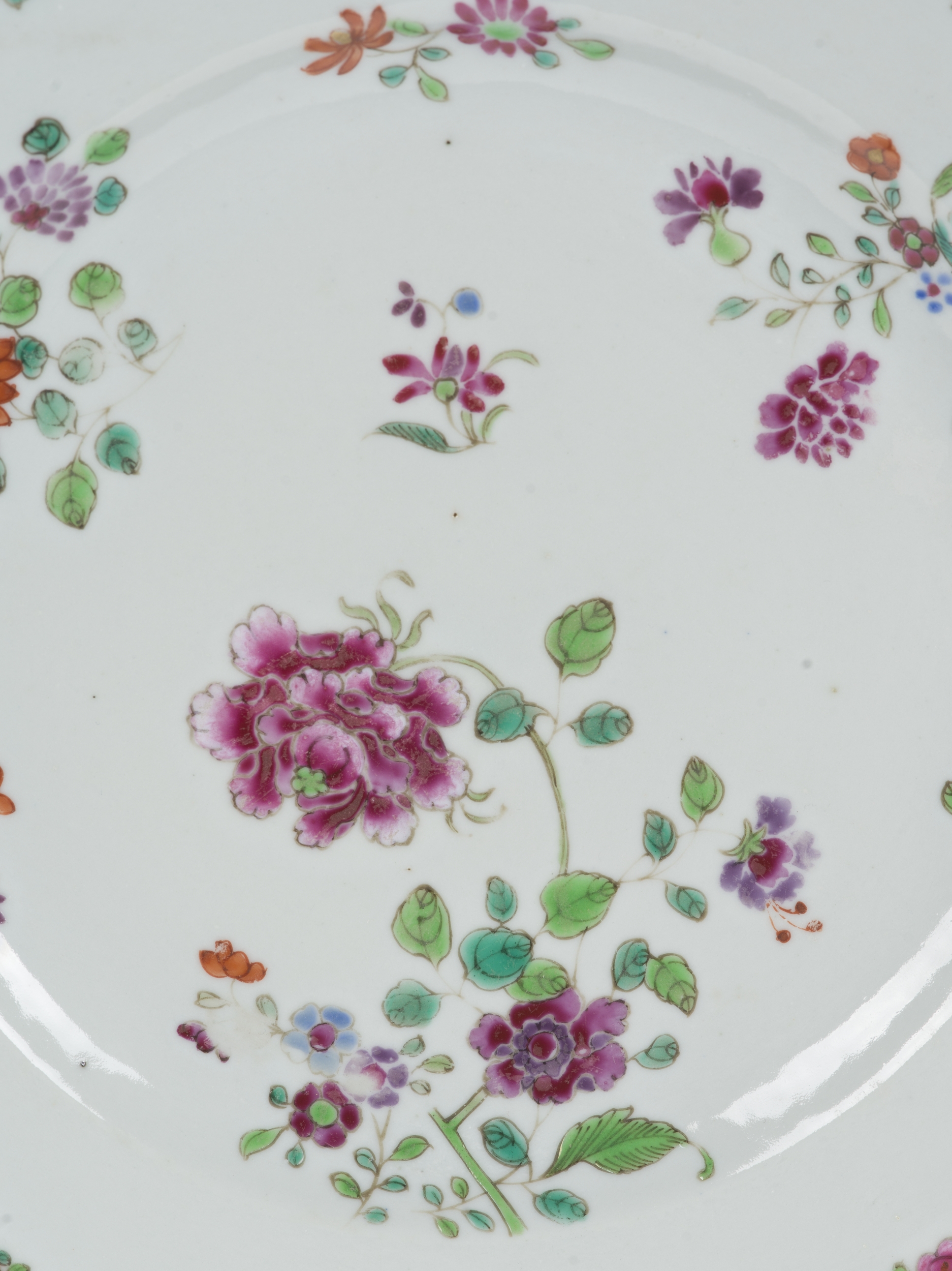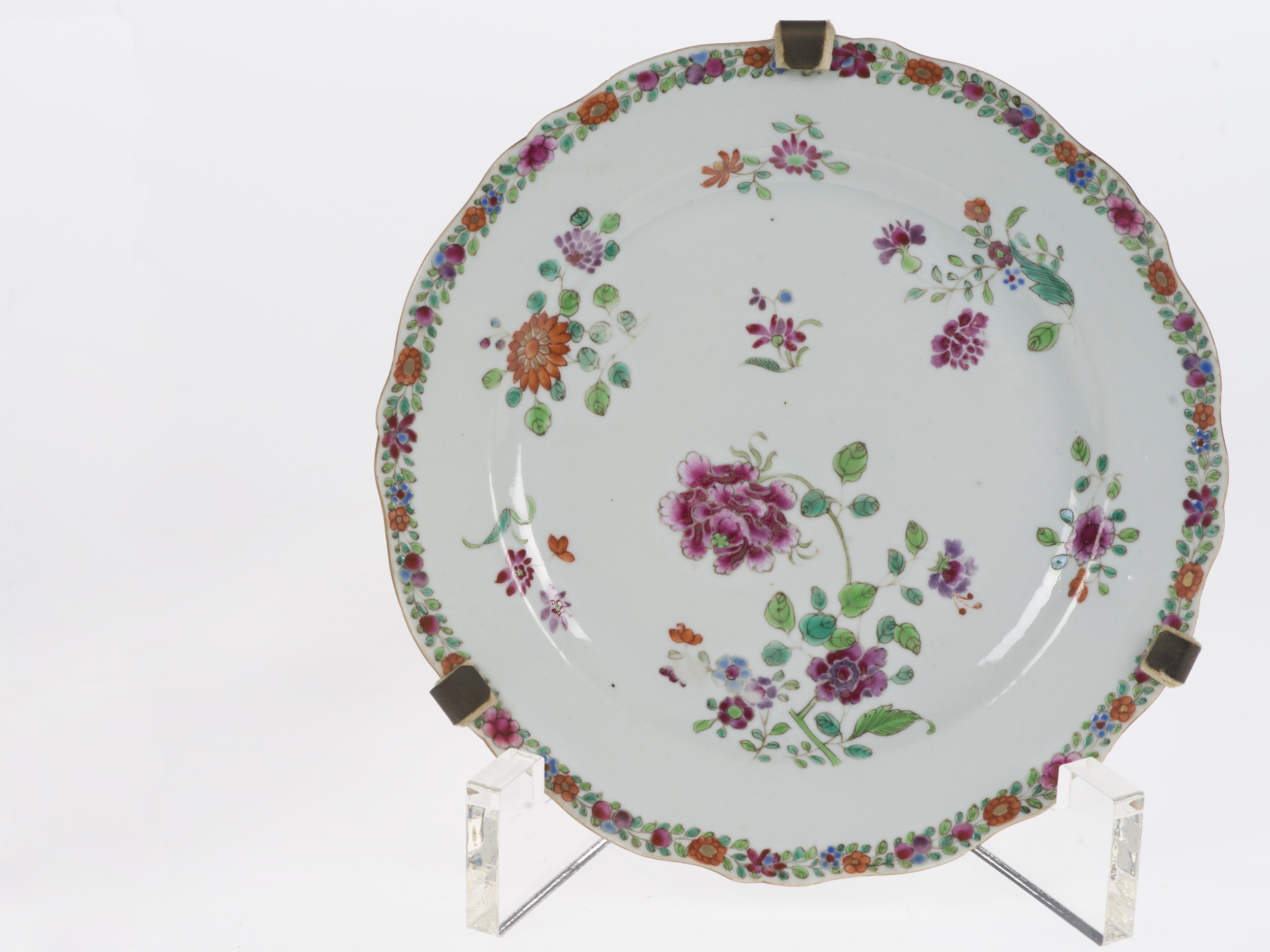 Okrągły porcelanowy talerz o falistej krawędzi zdobiony w typie famille rose. Famille rose to francuski termin oznaczający przynależność do określonej grupy porcelany chińskiej. W tym przypadku jest to tzw. rodzina różowych, czyli wyroby dekorowane naszkliwnymi farbami z przewagą odcieni różu i purpury. Chińczycy określali je jako yangcai - „obce kolory”. Zaczęły być używane w chińskich manufakturach do zdobienia porcelany na przełomie lat 20. i 30. XVIII wieku. Najwyższy poziom artystyczny wyrobów w typie famille rose osiągnięto w wytwórniach Jingdezhen w okresie Yongzheng (1722-1735).