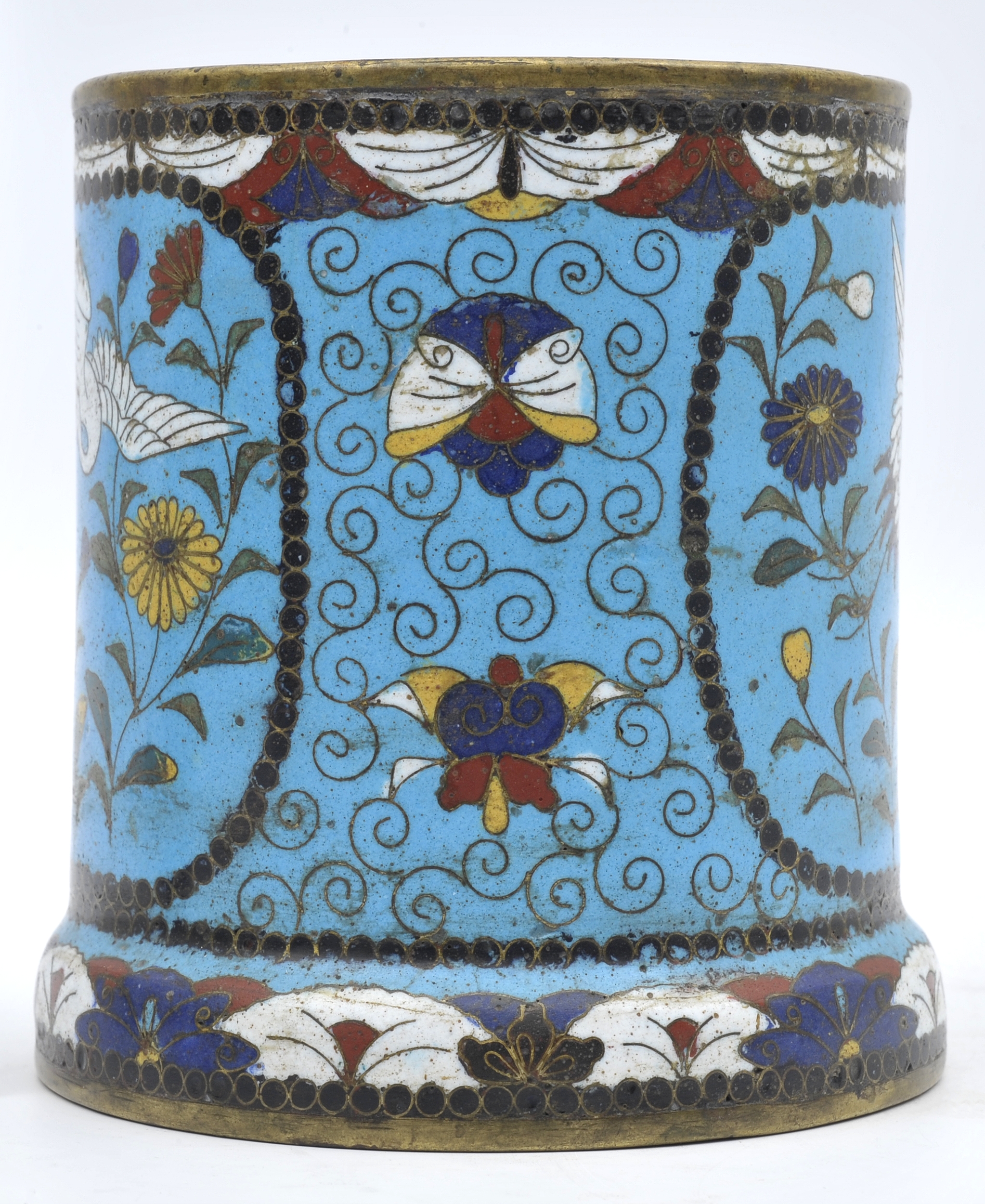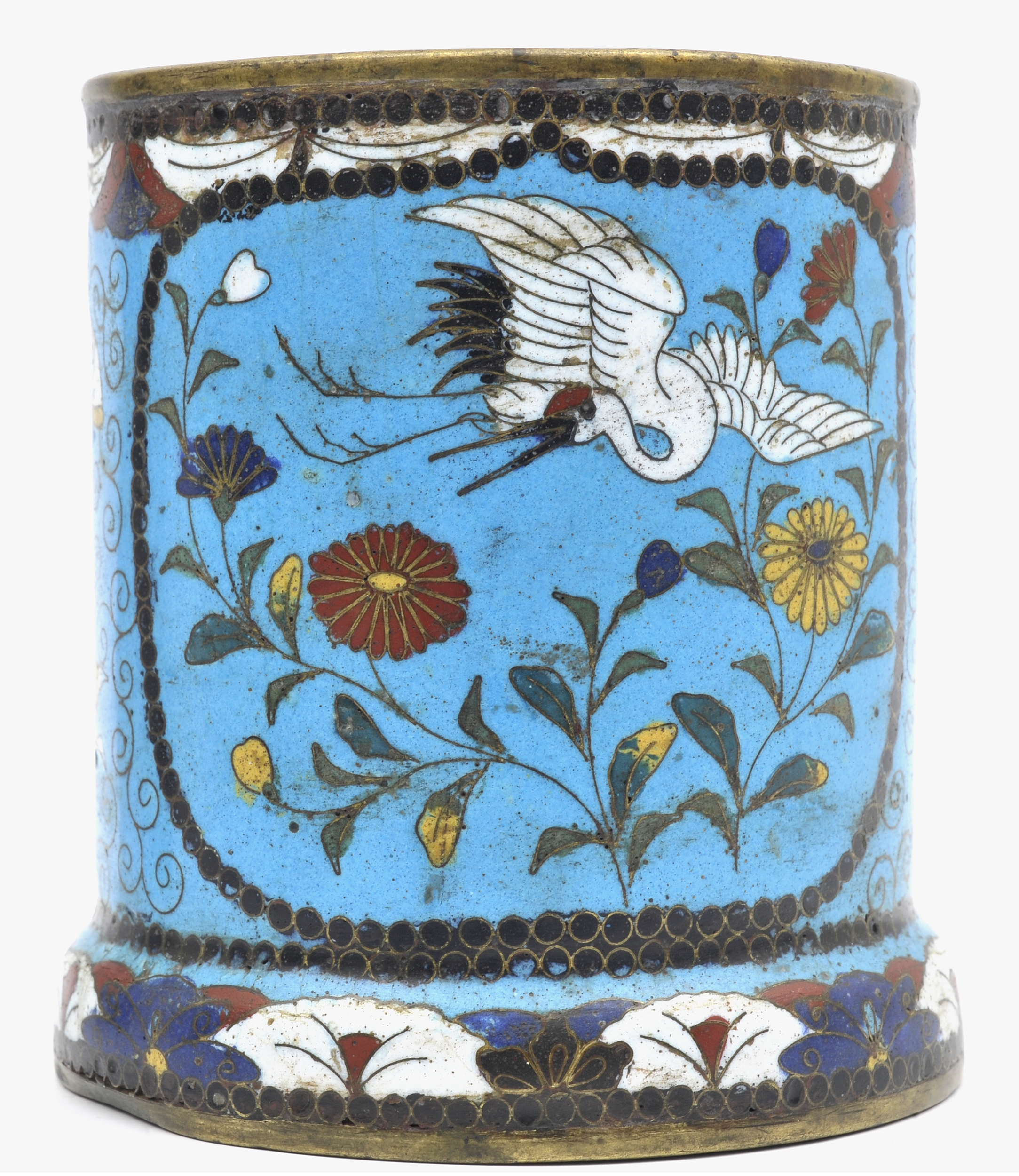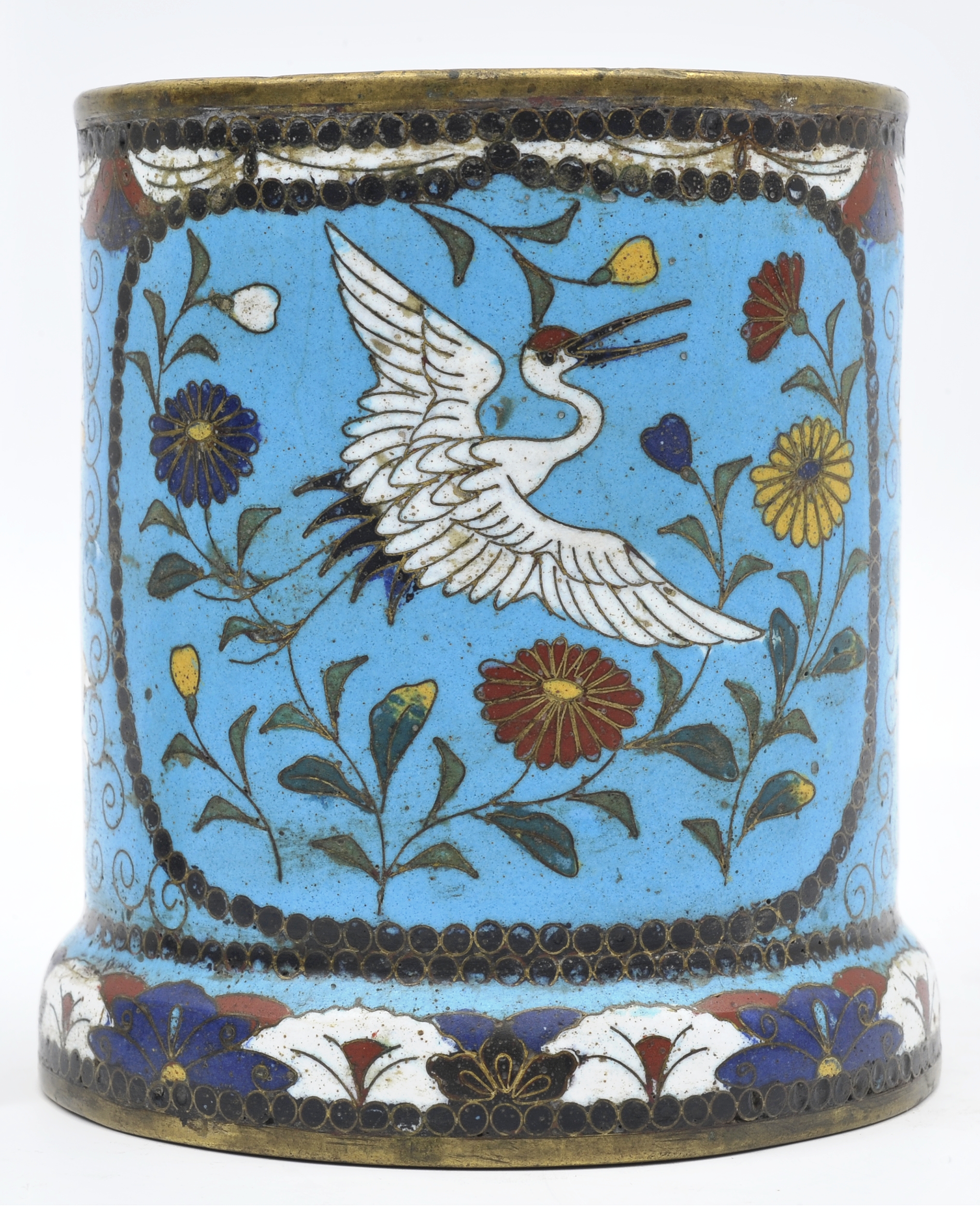 Cylindryczny kubek dekorowany emalią komórkową, rozszerzający się ku podstawie. Jasno turkusowe ścianki naczynia zdobią dwie rezerwy, czyli pola wyodrębnione krawędzią, wypełnione dekoracją. Ich kształt nawiązuje do kwadratu, dekoracja przedstawia żurawia w otoczeniu stylizowanych, barwnych chryzantem. Przestrzeń między rezerwami, podstawa i górna krawędź naczynia zostały ozdobione mocno stylizowanymi ornamentami z motywami roślin i owadów.