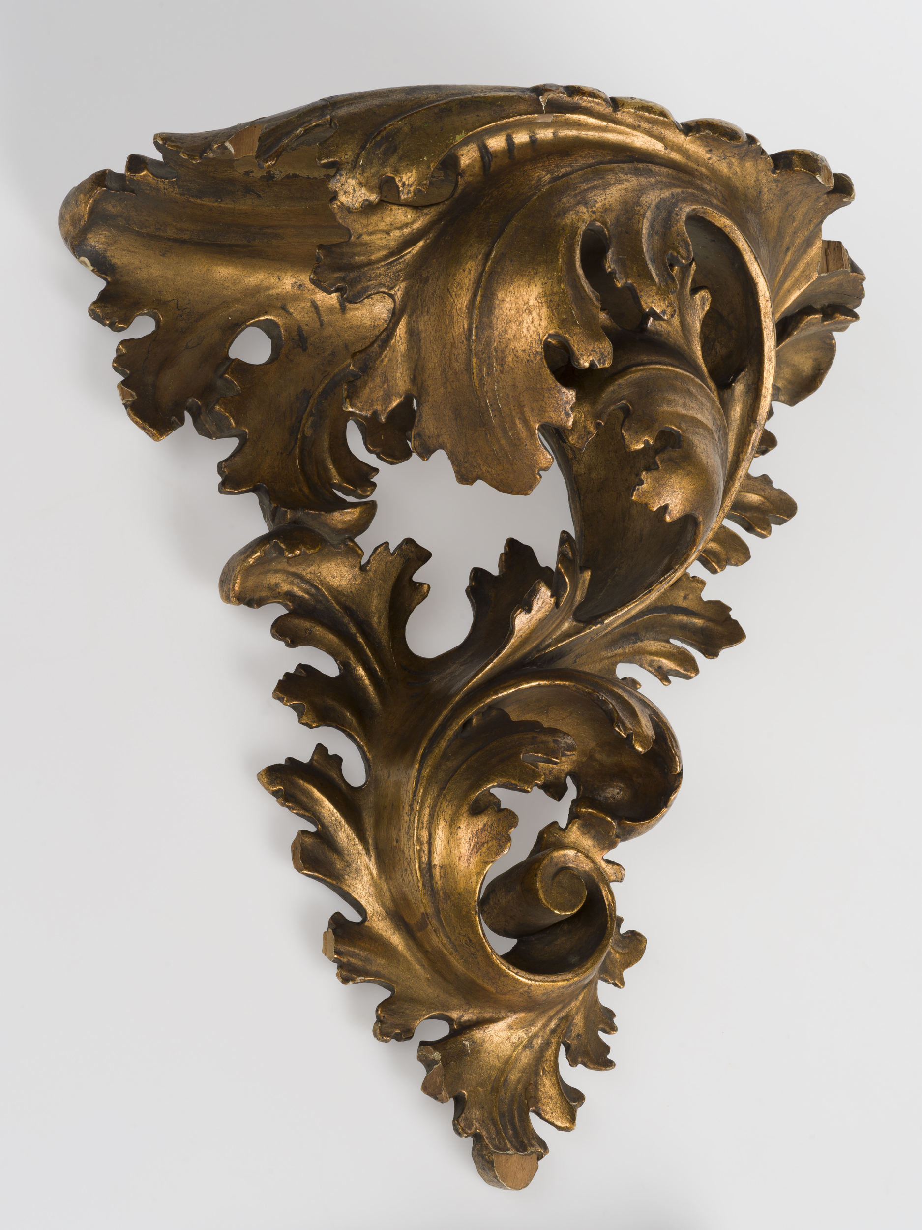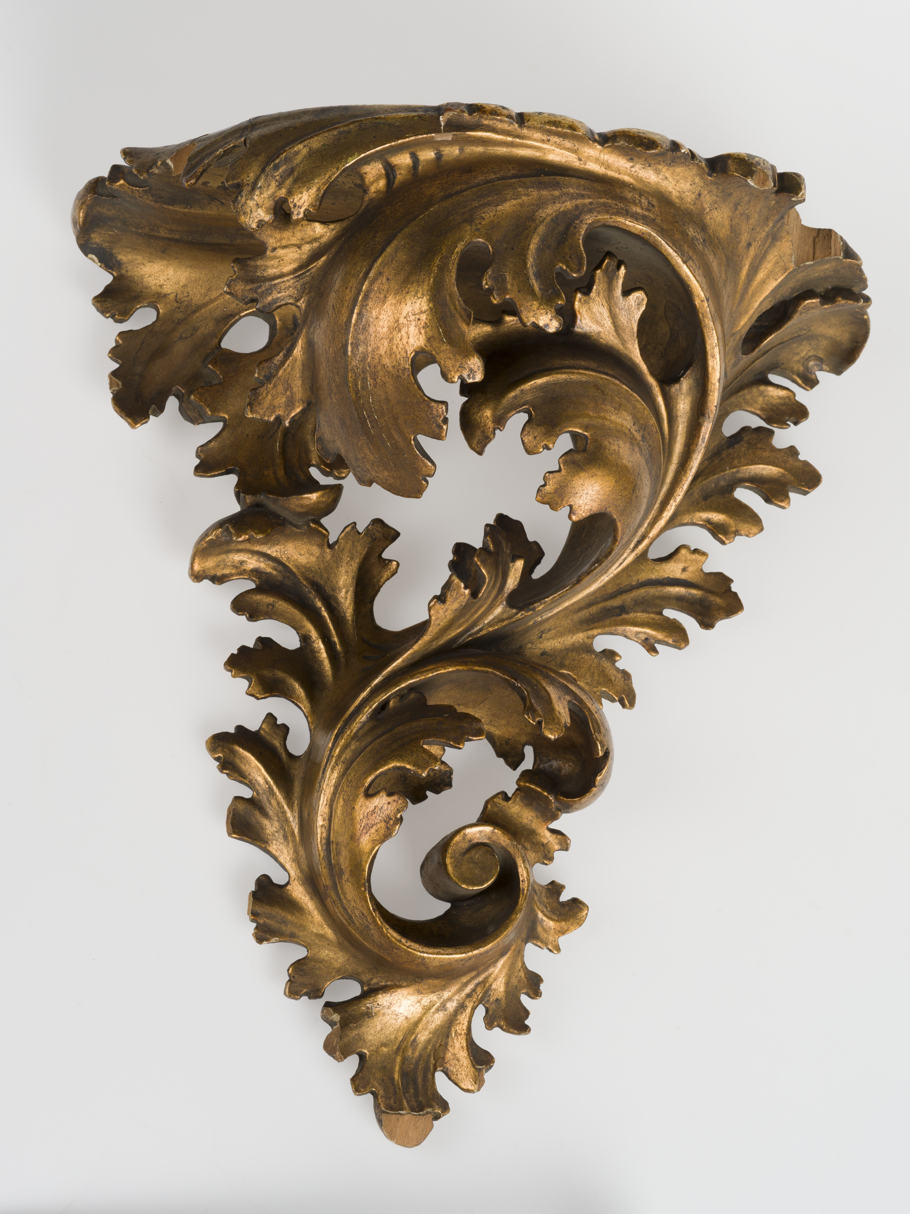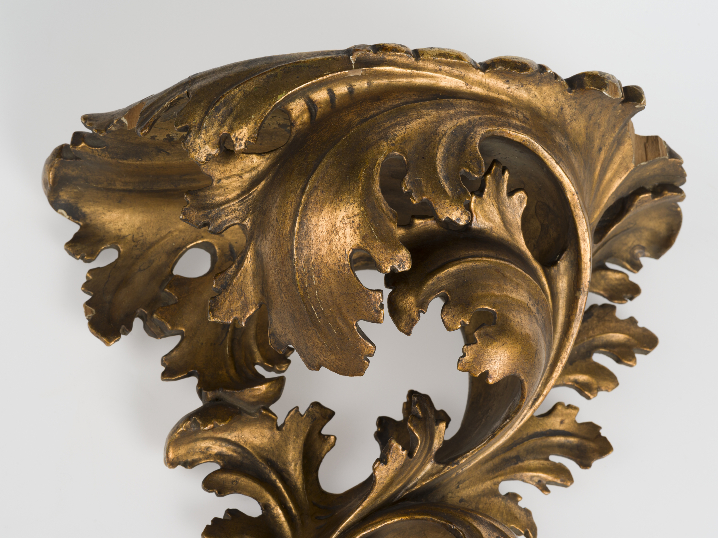 Niewielka konsolka ścienna, w formie rozbudowanego liścia akantu ułożonego w kształt litery S. Górny łuk o większym promieniu podtrzymuje drugi spłaszczony, owalny w zarysie liść tworzący blacik o nieregularnie postrzępionych krawędziach. Dolny łuk o wiele mniejszy tworzy dekoracyjną wolutę. Całość pełnoplastycznie rzeźbiona, ażurowa, złocona i polerowana do połysku.