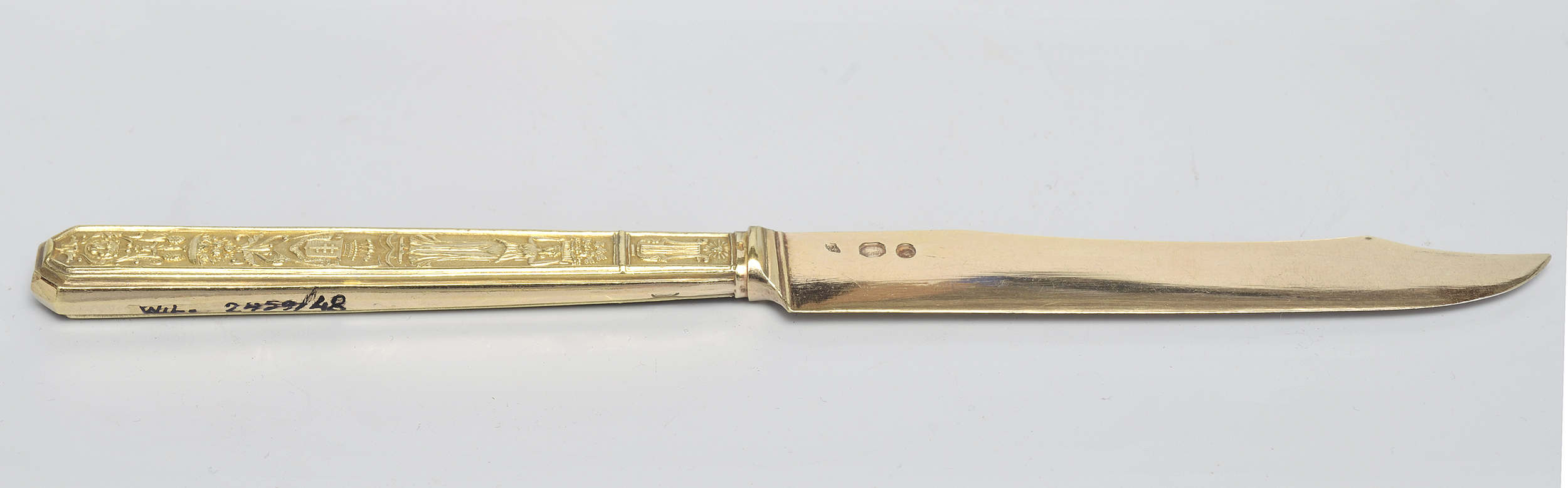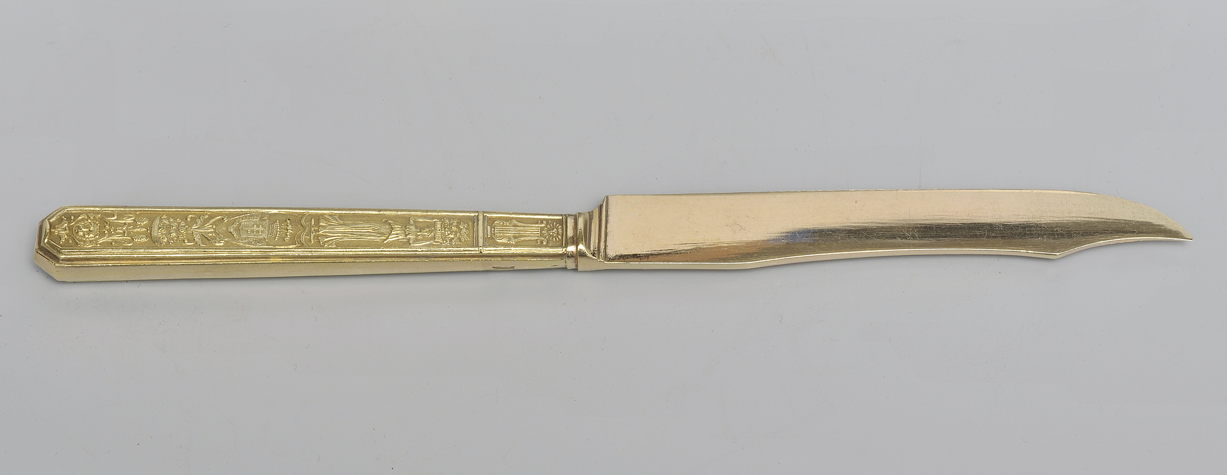 Prezentowany sztuciec jest jednym z siedemdziesięciu dwóch noży deserowych zachowanych w wilanowskiej kolekcji. Co ciekawe, cały komplet na 72 osób wykonany został przez dwóch złotników. Łyżki i widelce wykonał Dominique F. Naudin, a noże Martin G. Biennais.