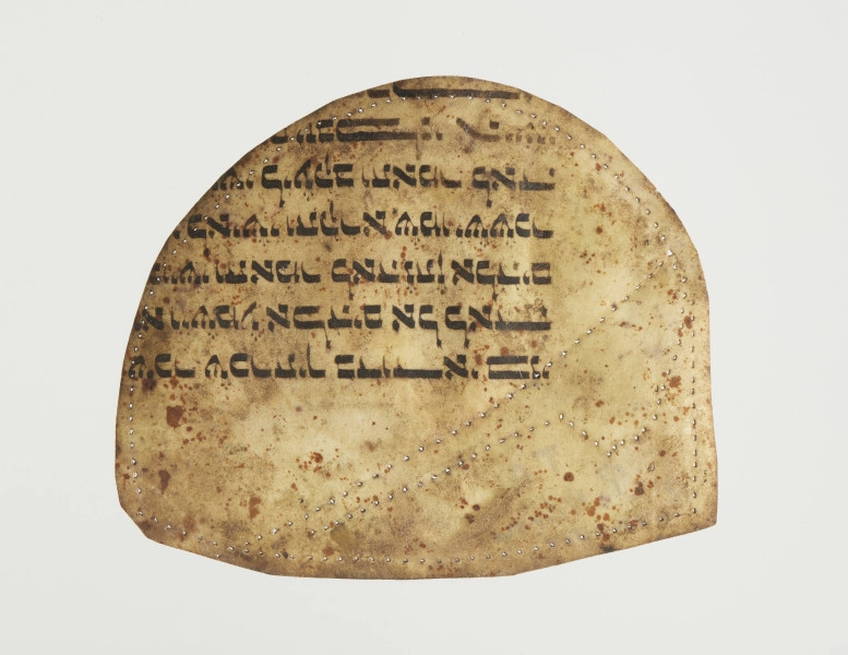 Wzornik szewski wykonany z fragmentu zwoju Tory. Kształt obiektu jest półokrągły z jednej strony (zbliżony do kształtu podkowy) i prosty z drugiej. Widoczne fragmenty tekstu w j. hebrajskim oraz liczne niewielkie otwory wzdłuż krawędzi oraz biegnące skośnie na 1/3 wysokości. Tekst skoncentrowany jest po jednej stronie (bliżej zaokrąglonej krawędzi). Na odwrocie zapisane długopisem ,,P. Górna’’ (?).