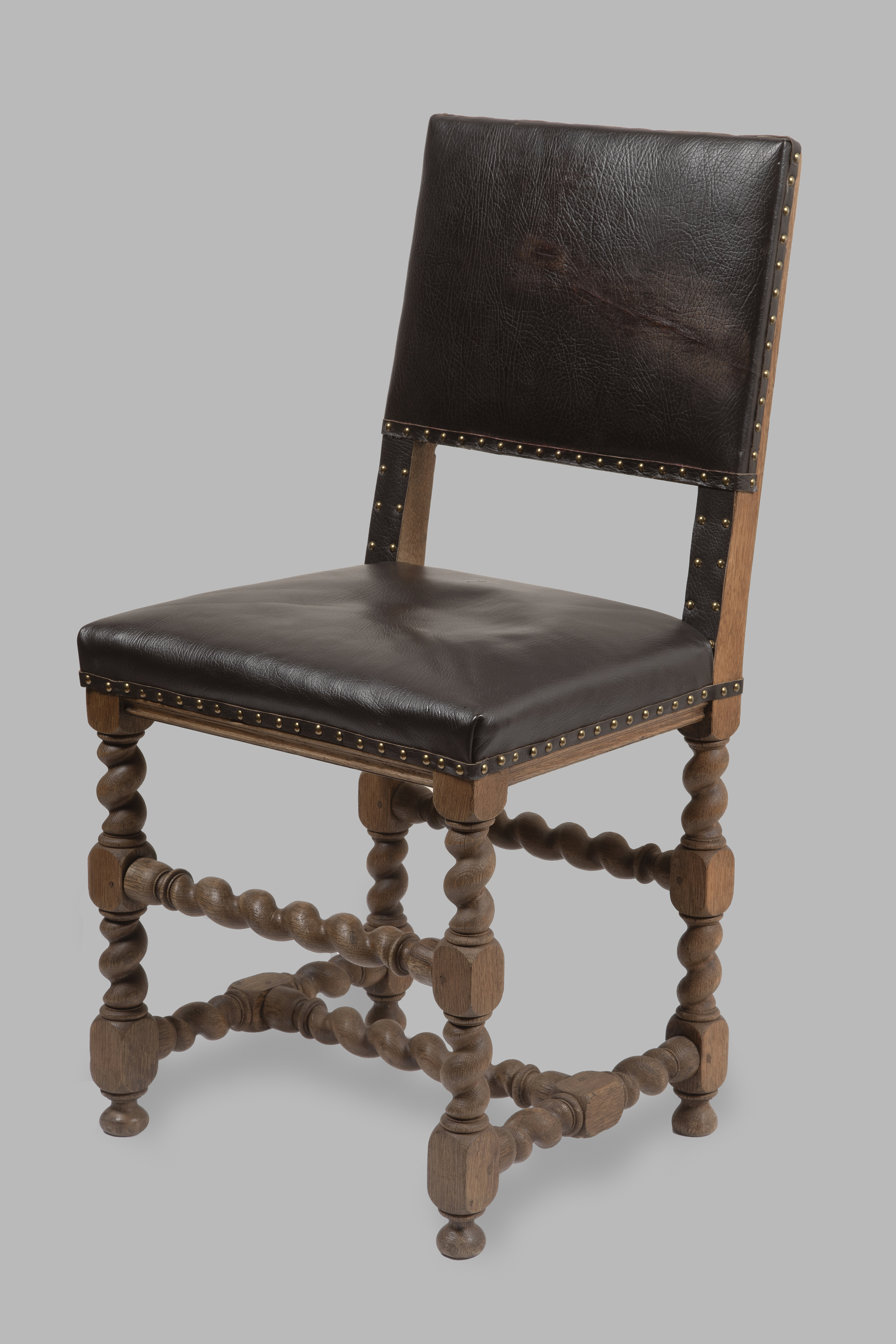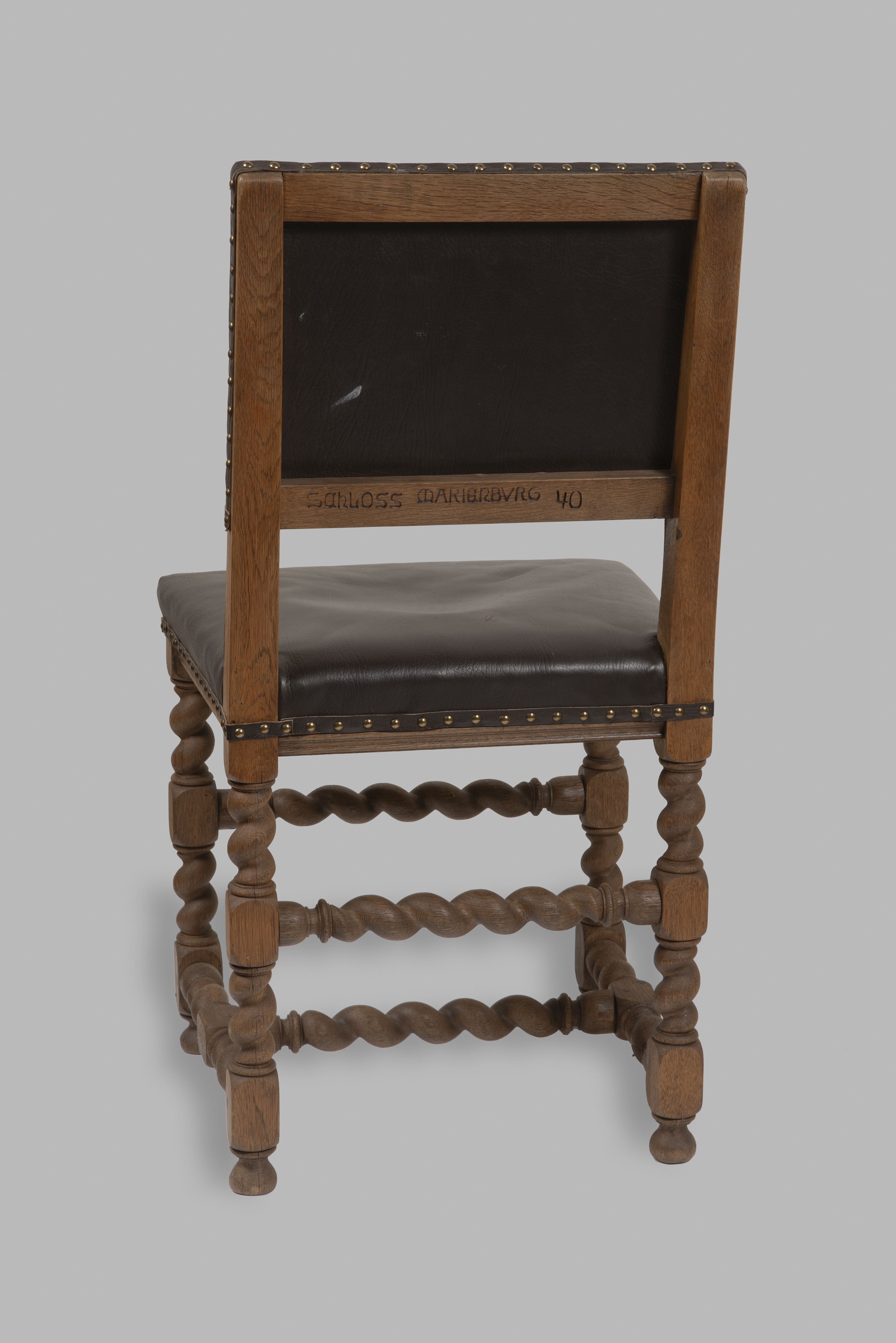 Mebel jest kopią krzesła z połowy XVII wieku. Pierwowzór pochodził ze zbiorów Muzeum Zamkowego w Berlinie (Schlossmuseum Berlin). Oryginał został powielony przynajmniej w kilkunastu egzemplarzach na zamówienie Zarządu Odbudowy Zamku w Malborku. Krzesło należało do jednego z wielu elementów „mobiliarza steinbrechtowskiego”, czyli ruchomego wyposażenia stworzonego specjalnie do wnętrz zamkowych, restaurowanych od lat 80. XIX wieku pod kierunkiem architekta Conrada Steinbrechta (1849-1923).