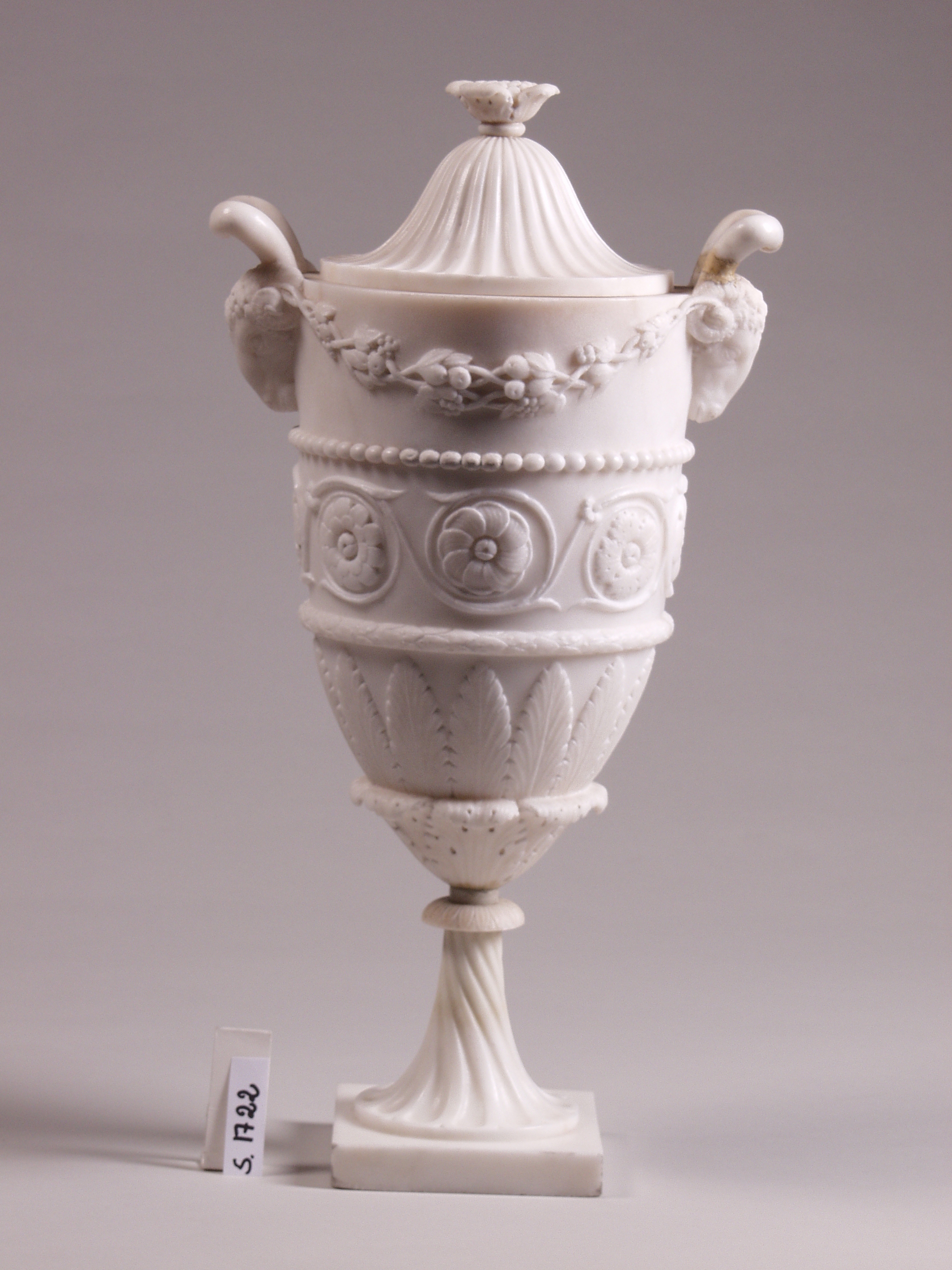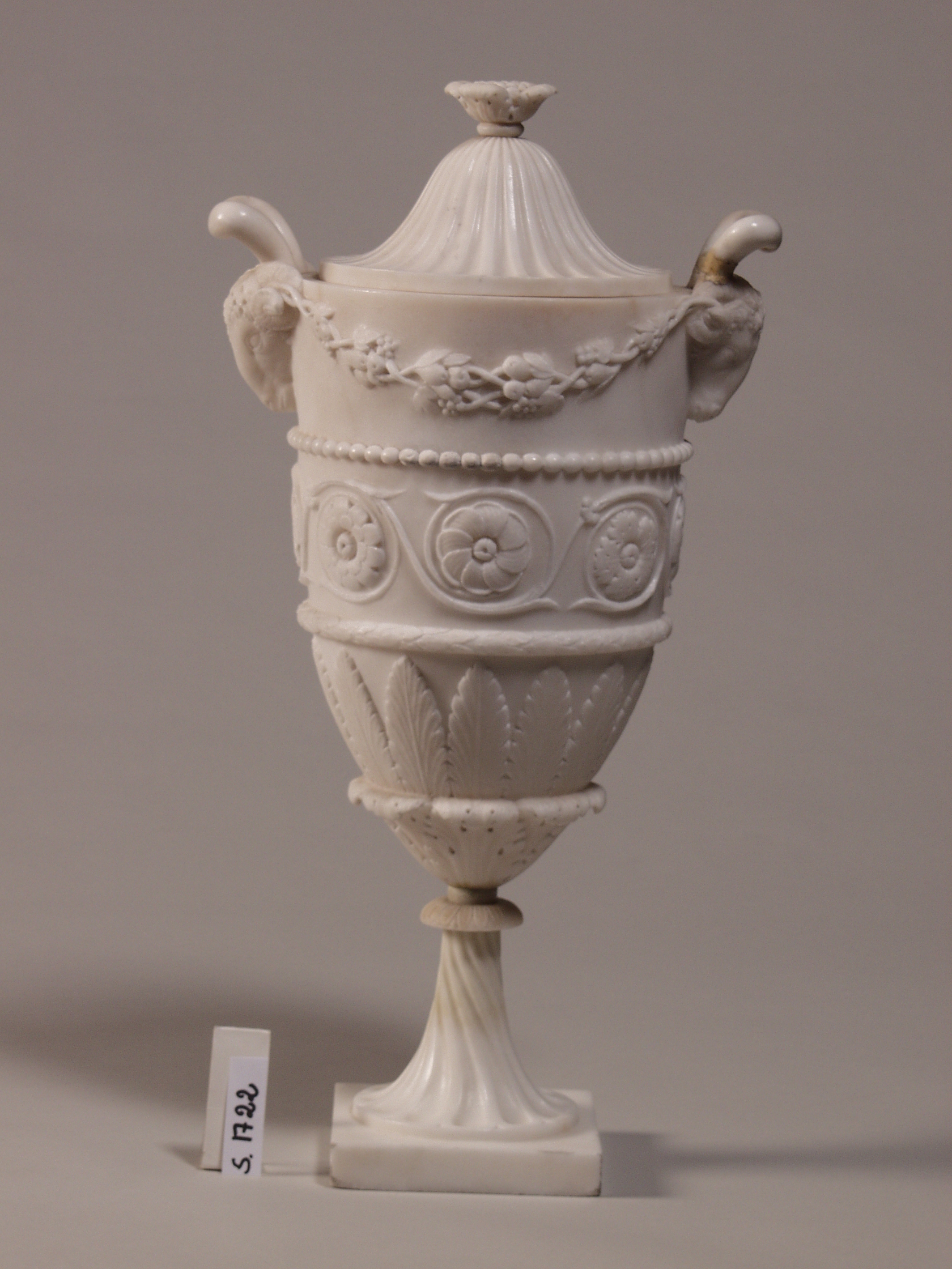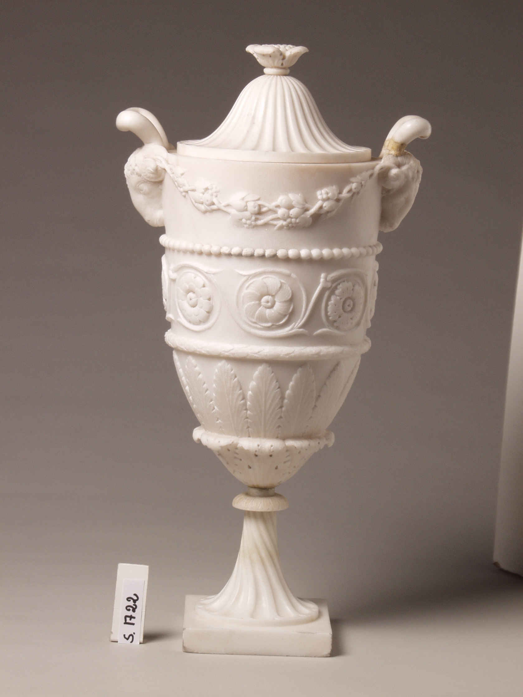 Wykonane z alabastru naczynie, na stopie z kwadratową podstawą, zostało bogato ozdobione. Pokrywka w kształcie dzwonka , z małym uchwytem w kształcie kwiatu, pokryta jest kanelowaniem. Na smukłej czarze, od góry widać girlandę z owoców i kwiatów zwisającą pomiędzy dekoracyjnymi głowami baranów powyżej których znajdują się uchwyty. Poniżej okala ją pas perełek pod którym wyrzeźbiona została wić roślinna z motywem kwiatowym. Półwałek z liści lauru oddziela wić od stylizowanych liści. Dołem czara osadzona jest w koszyczku z wywiniętych liści akantu, który łączy ją z ukośnie kanelowaną, okrągłą stopą.