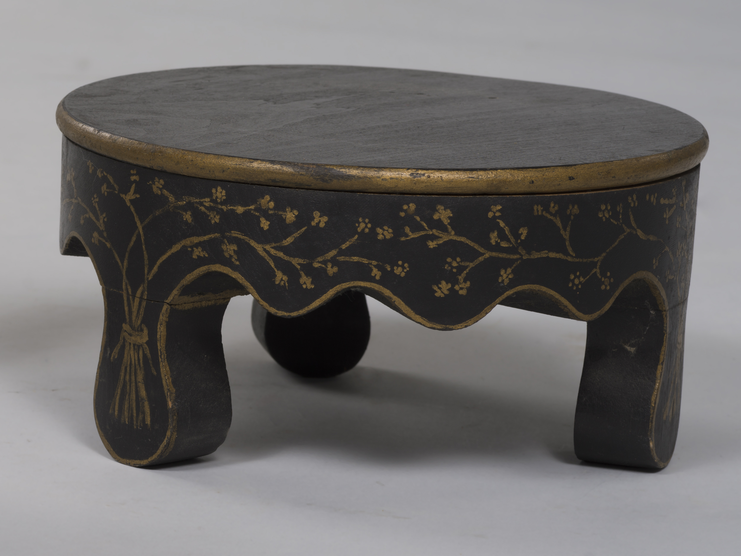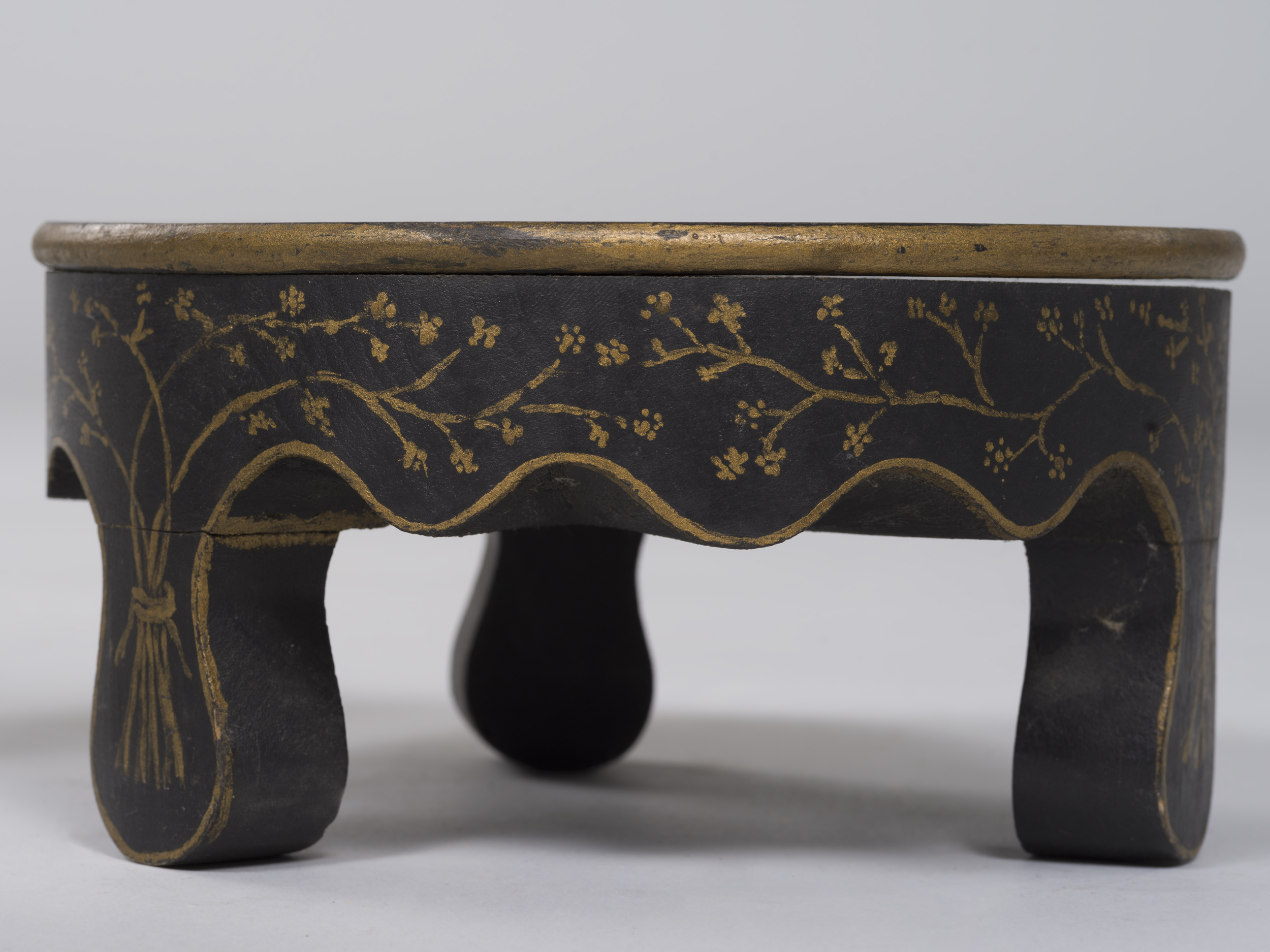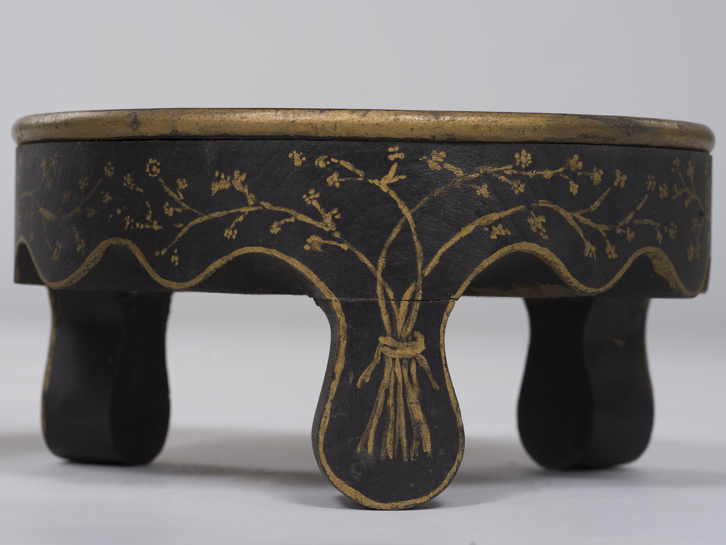 Niewielka okrągła podstawka o okrągłym blacie, trzech nóżkach w kształcie kropli płynnie przechodzących w faliście wykrojoną, lambrekinową cargę. Lakierowana na czarno i zdobiona dekoracją malarską w kolorze złotym, przedstawiającą przewiązane wstążką bukiety drobno ukwieconych gałęzi rozmieszczone na nóżkach i płasko rozchodzące się na dwie strony po powierzchni cargi. Obrys krawędzi nóżek oraz cargi podkreślono wąskim paskiem, a boczne krawędzie blatów pomalowano w całości na kolor złoty.