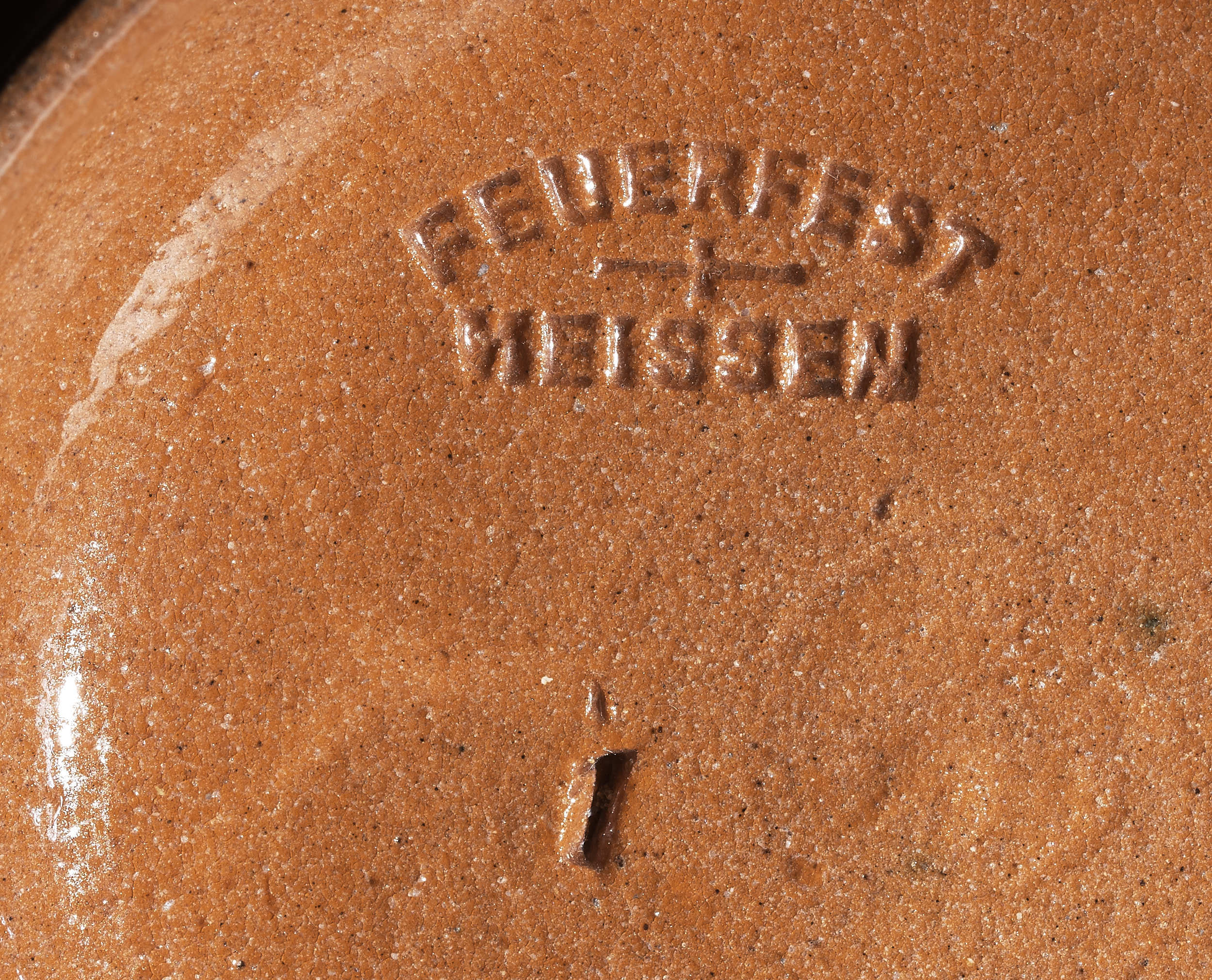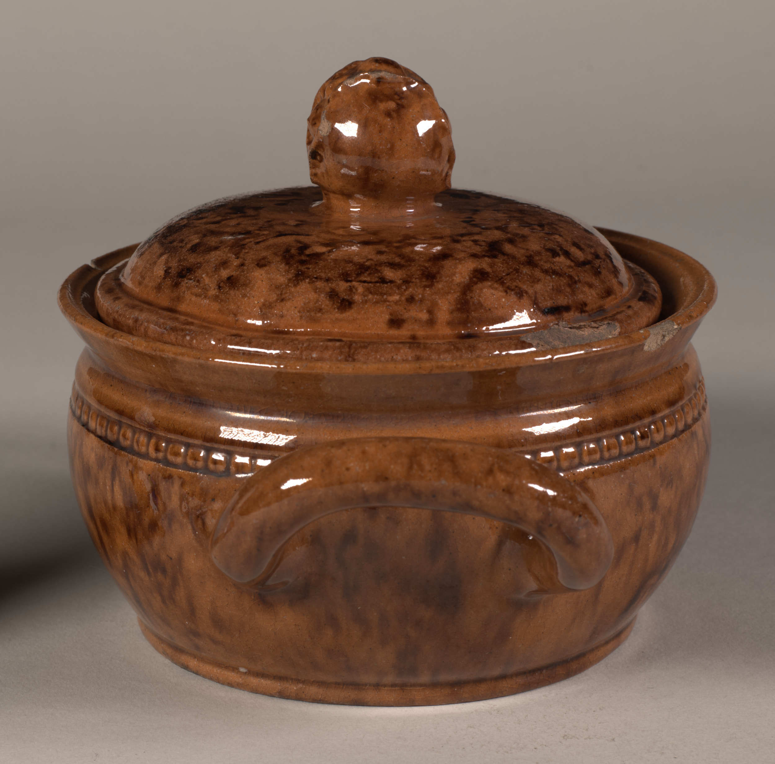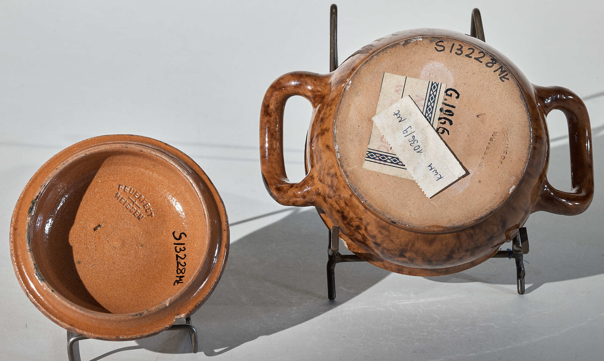 Okrągła miseczka z dwoma wystającymi uchwytami i pokrywką. Pokrywka naczynia zwieńczona uchwytem w kształcie pąka kwiatu. Całość w kolorze wypalonej brązowej glinki. Od spodu wytłoczony napis wskazujący na producenta Feuerfest Meissen. Założenie manufaktury zawdzięczamy elektorowi saskiemu, a później królowi Polski Augustowi II Mocnemu. Monarcha był miłośnikiem i kolekcjonerem porcelany wschodniej.