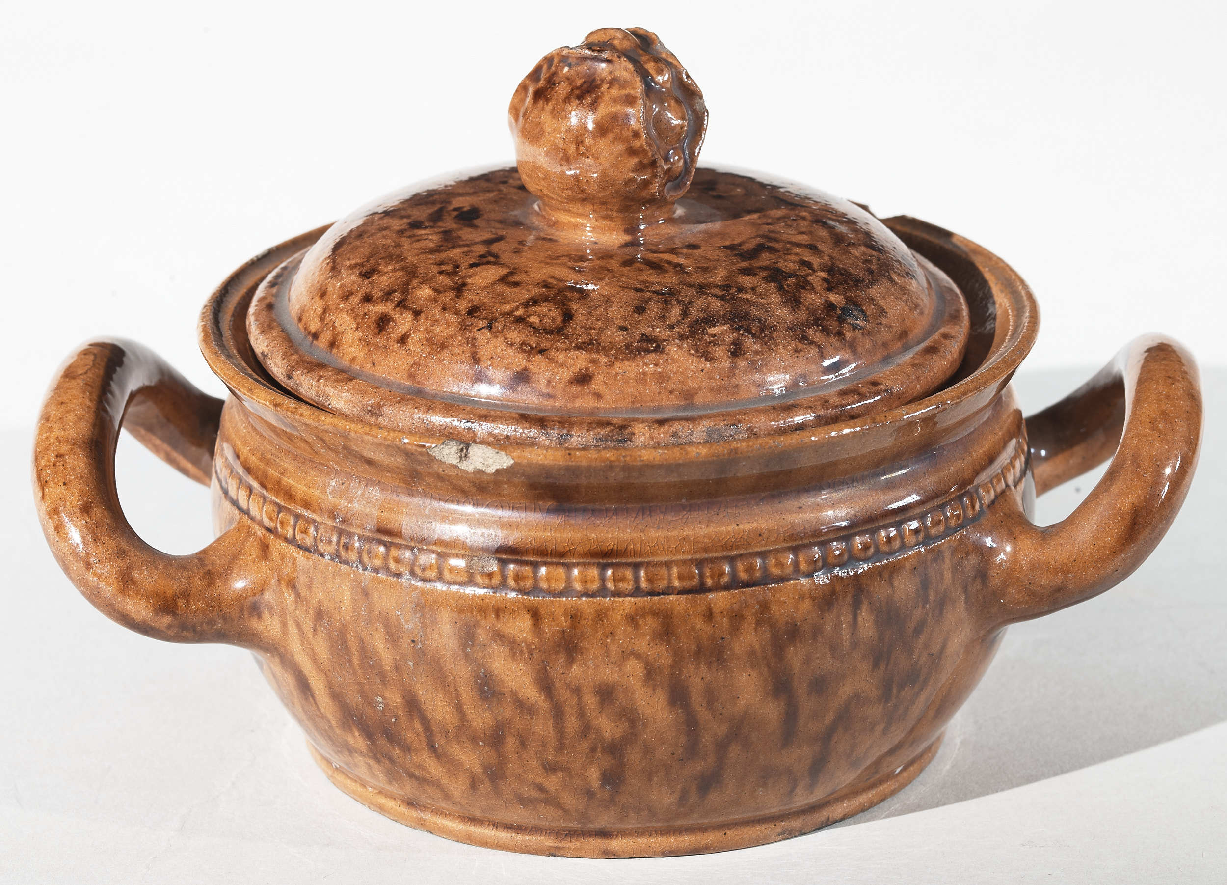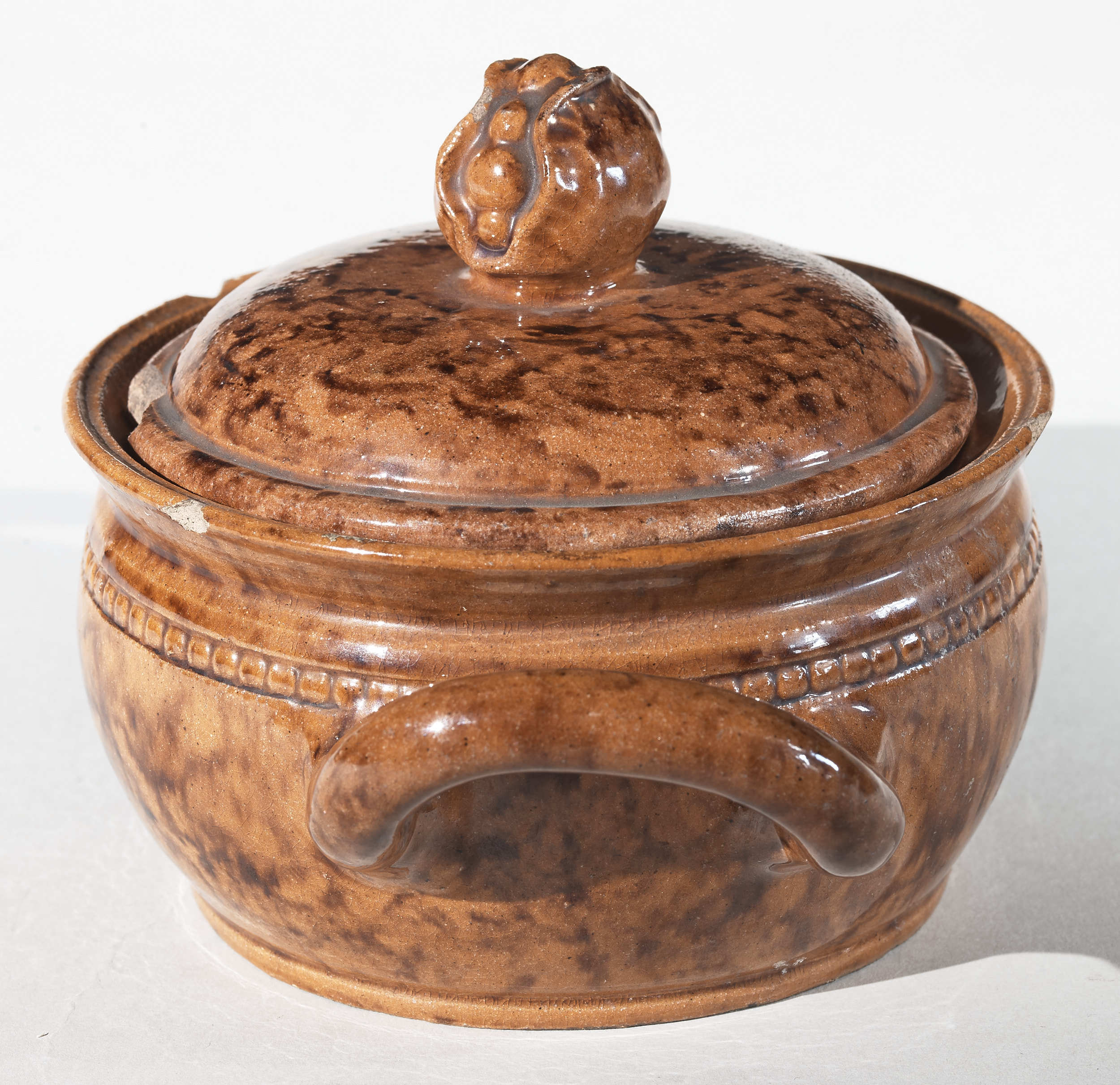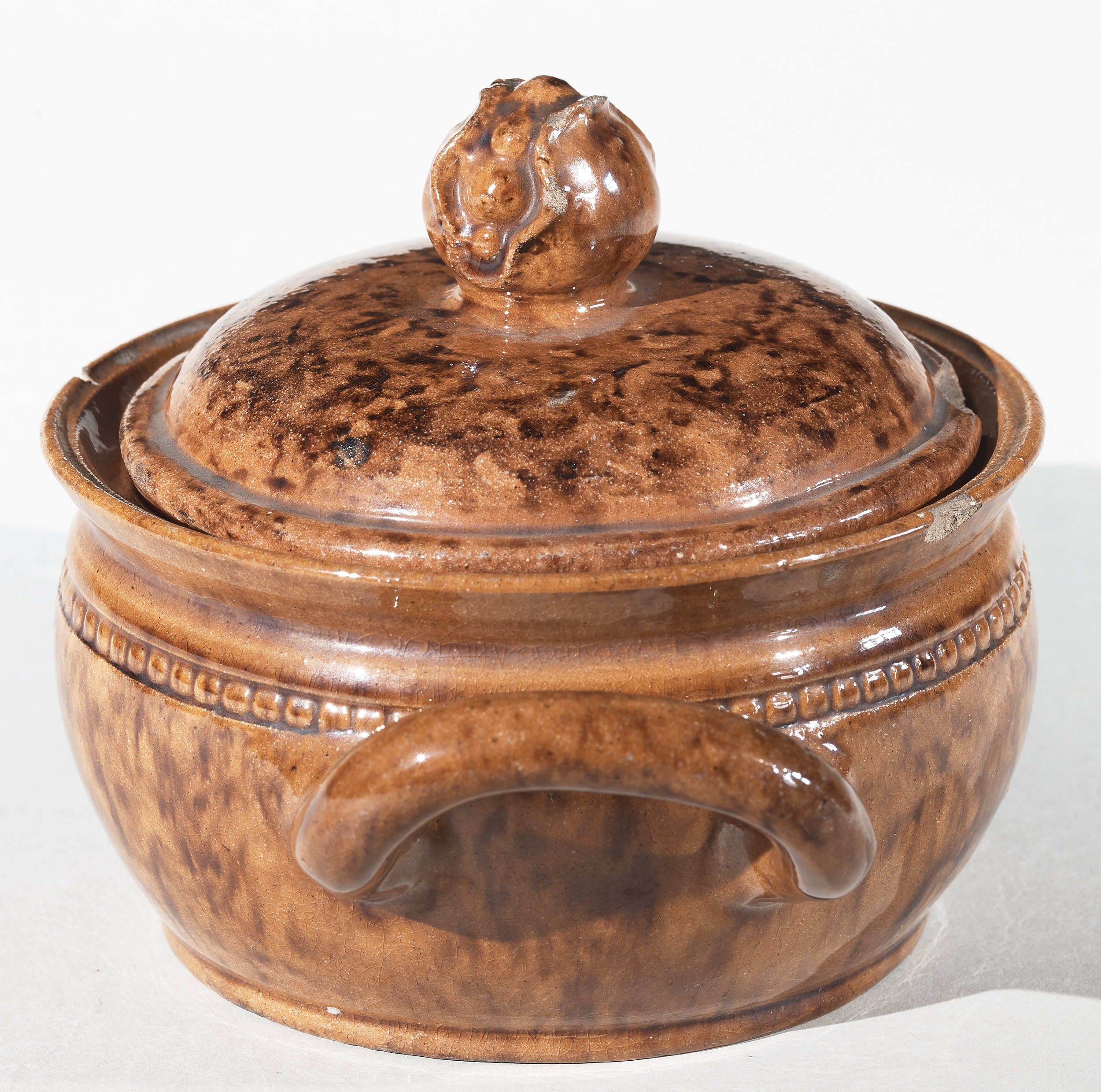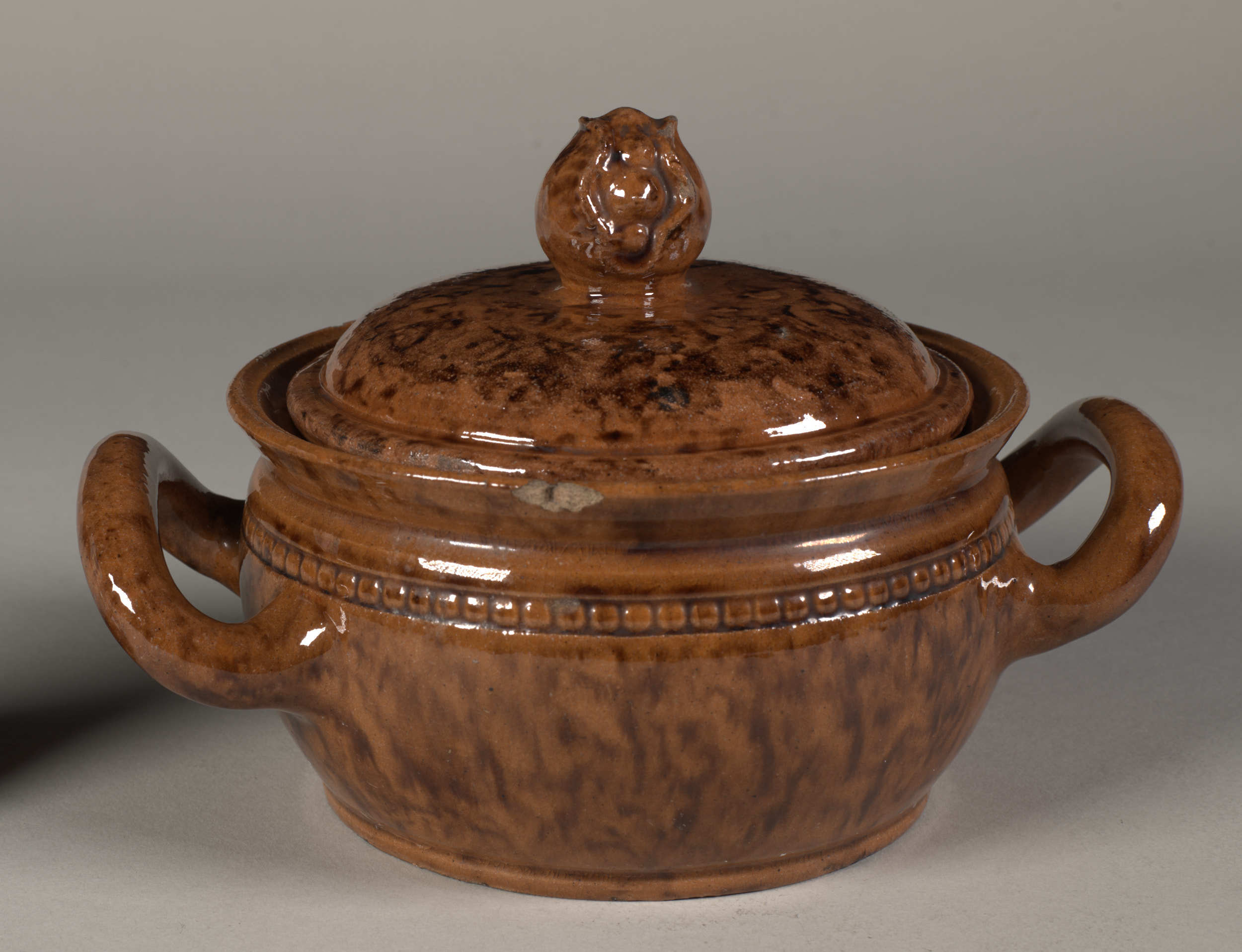 Okrągła miseczka z dwoma wystającymi uchwytami i pokrywką. Pokrywka naczynia zwieńczona uchwytem w kształcie pąka kwiatu. Całość w kolorze wypalonej brązowej glinki. Od spodu wytłoczony napis wskazujący na producenta Feuerfest Meissen. Założenie manufaktury zawdzięczamy elektorowi saskiemu, a później królowi Polski Augustowi II Mocnemu. Monarcha był miłośnikiem i kolekcjonerem porcelany wschodniej.