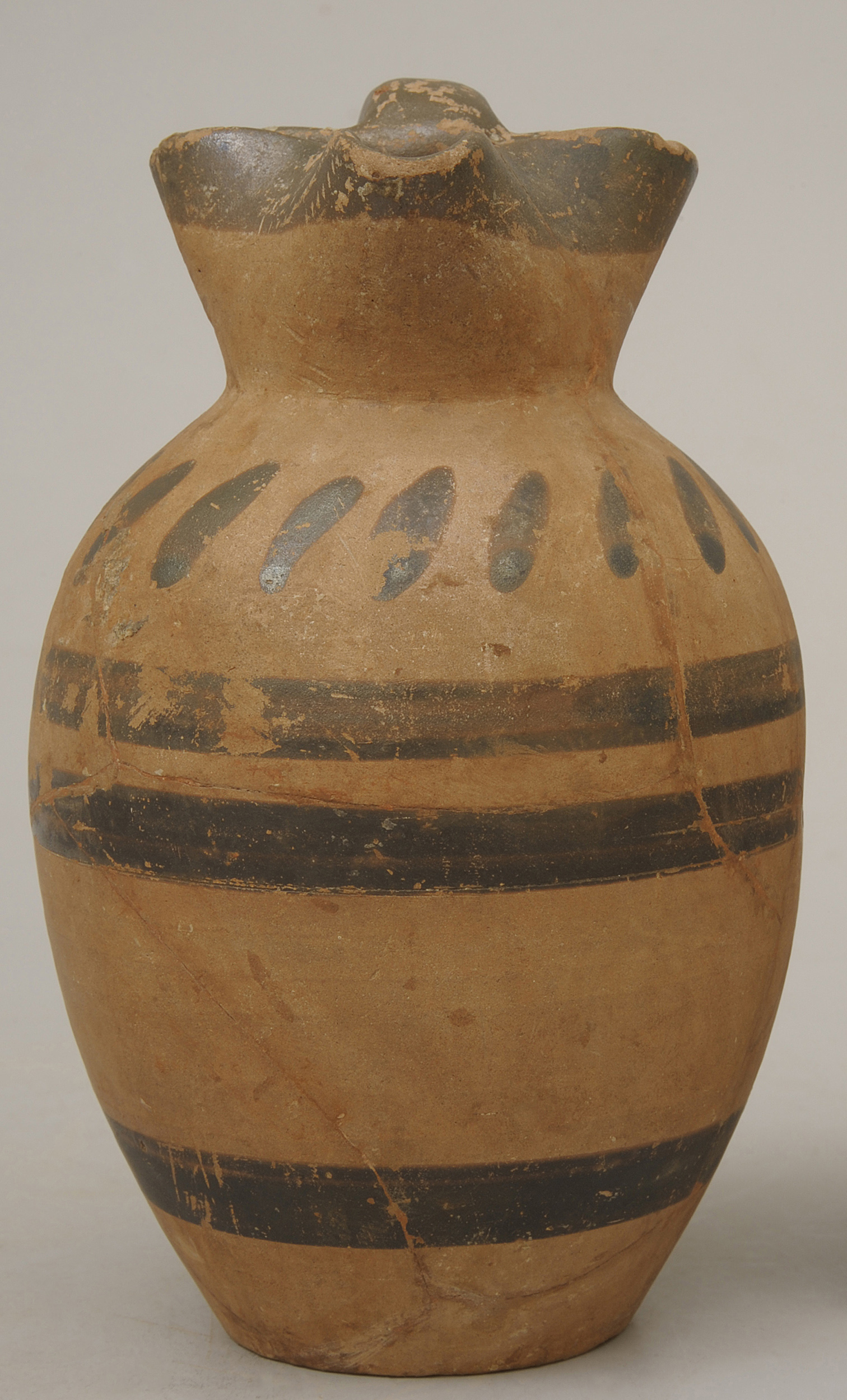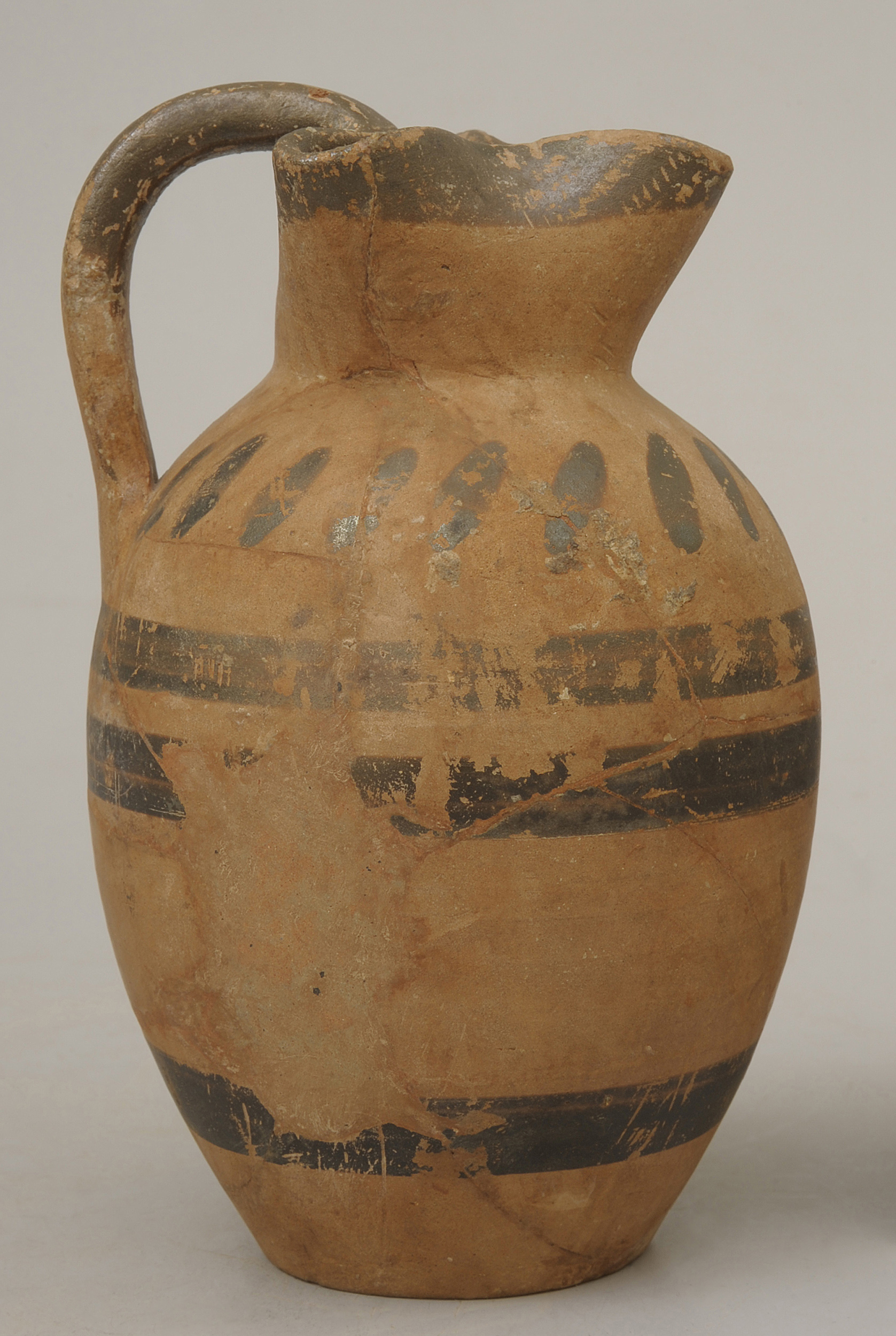 Dzban o trójlistnym wylewie wykonany z beżowopomarańczowej gliny. Ten typ naczynia pochodzącego ze Starożytnej Grecji nazywano „oinochoe” – służył do czerpania wina z krateru (większego naczynia przeznaczonego do mieszania wina z wodą), a także do nalewania napoju do czar biesiadników. Wilanowska oinochoe nie zachowała się do naszych czasów w całości, jednak podczas konserwacji została sklejona z części, a kilka ubytków uzupełniono. Naczynie zdobi geometryczna dekoracja malowana firnisem (pokostem) w kolorze ciemnego brązu. Składają się na nią trzy poziome pasy na brzuścu oraz pas przy wylewie i na części uchwytu, uzupełnione krótkimi, ukośnymi pociągnięciami pędzla. Dekoracja naczynia jest bardzo prosta, a także niezbyt finezyjnie wykonana, musiała ona wyjść spod ręki prostego rzemieślnika. Prostota naczynia sugeruje, że był to przedmiot głównie użytkowy, stanowiący przykład ceramiki inspirowanej produkcją grecką jaka powstawała w regionie Kampanii w Południowych Włoszech.