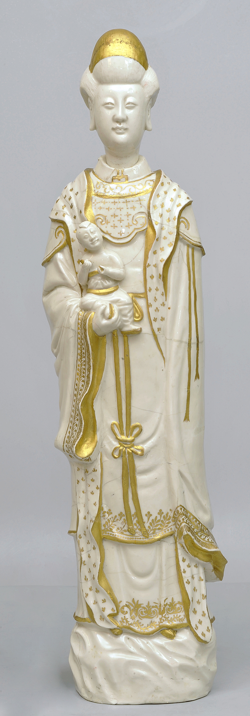 Figura przedstawiająca „songzi Guanyin”, czyli „przynoszącą dziecko”. Rzeźba wykonana jest z pięknej białej porcelany, później ozdobionej polichromią. Guanyin, przedstawiana jako kobieta, jest w buddyzmie chińskim odpowiednikiem buddyjskiej Awalokiteśwary – bodhisattwy uosabiającej współczucie. Postać ta była szczególnie popularna w Chinach i często przedstawiana w sztuce chińskiej.