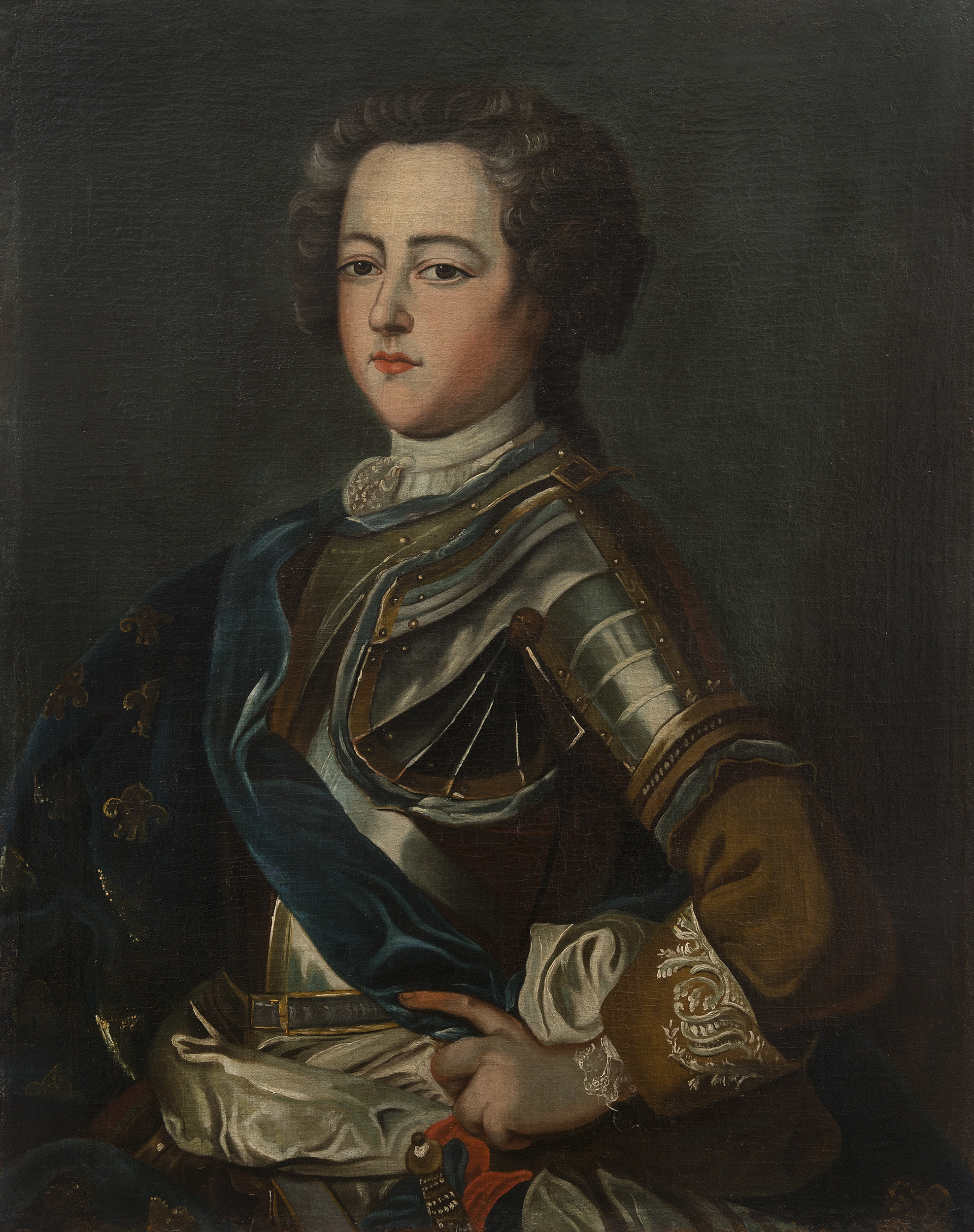 Obraz należy do serii portretów, których kompozycja wywodzi się z dużego portretu konnego Ludwika XV pędzla Jeana-Baptiste’a van Loo (1684-1745), namalowanego we współpracy z Charlesem Parrocelem (zamówiony w 1723 roku przez Surintendance dla Charlesa de Lorrain; Wersal, nr inw. MV3749). Ludwik jest przedstawiony w podobnej zbroi i podobnym upozowaniu. Powstało kilka całopostaciowych wersji (jedna jeszcze – z odmiennymi szczegółami tła – w Wersalu, kolejne np. w Nicei, Musée Chéret i Musée de Perpignan) oraz wiele powtórzeń w redukcji do popiersia prostokątnego lub owalnego. Raz po raz kolejne pojawiają się na rynku antykwarycznym (np. Sotheby’s, Londyn, 8 VII 2009, nr 43; Dorotheum, Wiedeń, 13 IV 2011, nr 540). Na portrecie wilanowskim nie uwidoczniono prawej ręki portretowanego (w oryginale wyciągniętej do przodu i wspartej na regimencie), spowijając ją szafirowym płaszczem z motywem złotych linii. Podobne zabiegi kompozycyjne stosowano i w innych wersjach (np. Royal Collection w pałacu Buckhingham, RCIN 402004;Christies, 14 XII 2000, nr 48).