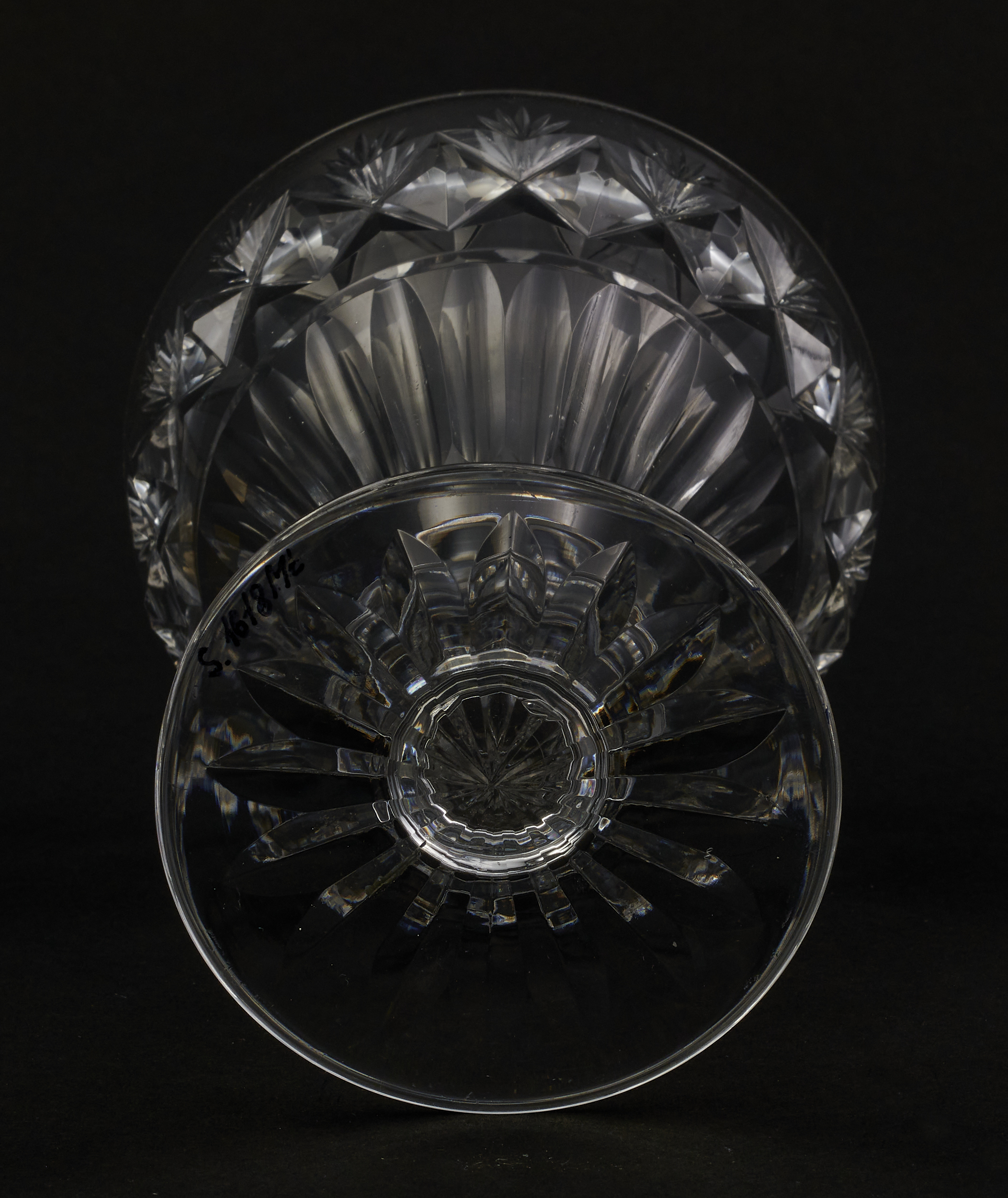Kieliszek okrągły, ozdobiono szlifowaną dekoracją rośliną. Stopa okrągła, nóżka krótka i szeroka, zakończona pierścieniem, na którym osadzona stożkowata czara. Spód stopy dekorowany płytkim szlifem o motywie wielopłatkowego kwiatka.