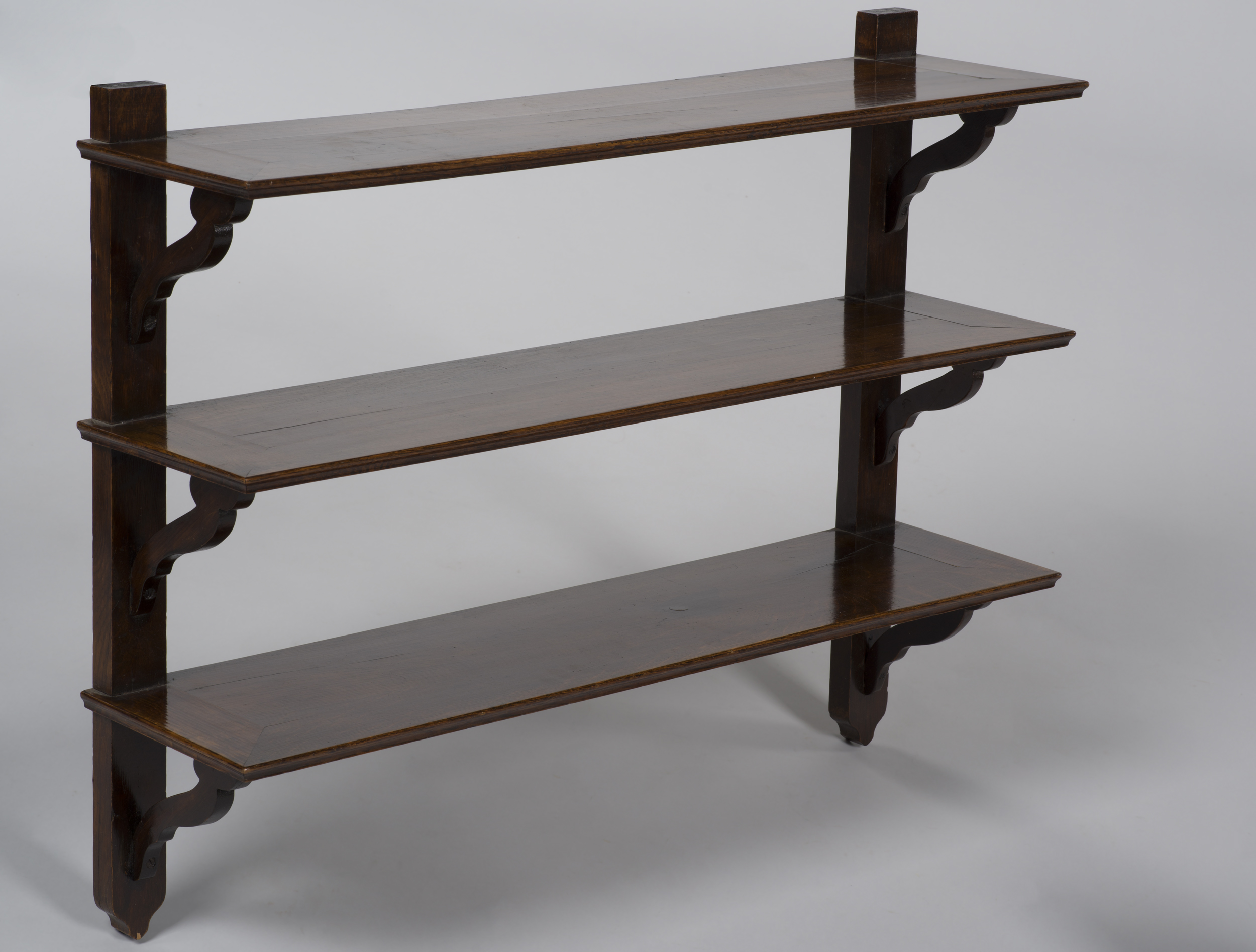Ciemno-brązowa półka wisząca zwana ścienną należy do jednych z najbardziej popularnych mebli pomocniczych we wnętrzach mieszkalnych. Trzy proste deski tej samej wielkości wsparte przez pary kroksztynów połączone na trzech poziomach przez dwie pionowe listewki z uchwytami do wieszania to prosty sprzęt użytkowy nie wyróżniający się szczególną dekoracyjnością. Jego ozdoby ograniczają się do urozmaiconego kształtu kroksztynów podpierających deski i delikatnego profilowania ich krawędzi. Półka nie ma tylnej ścianki, jej struktura tylko w niewielkim stopniu zakłóca dekoracje ściany. Powierzchnia tapety, pokrycia ścian, malowideł ściennych staje się tłem dla wiszącego mebla. Podobną półkę Anetka z Tyszkiewiczów Potocka umieściła na swym projekcie gabinetu męża Aleksandra Potockiego.