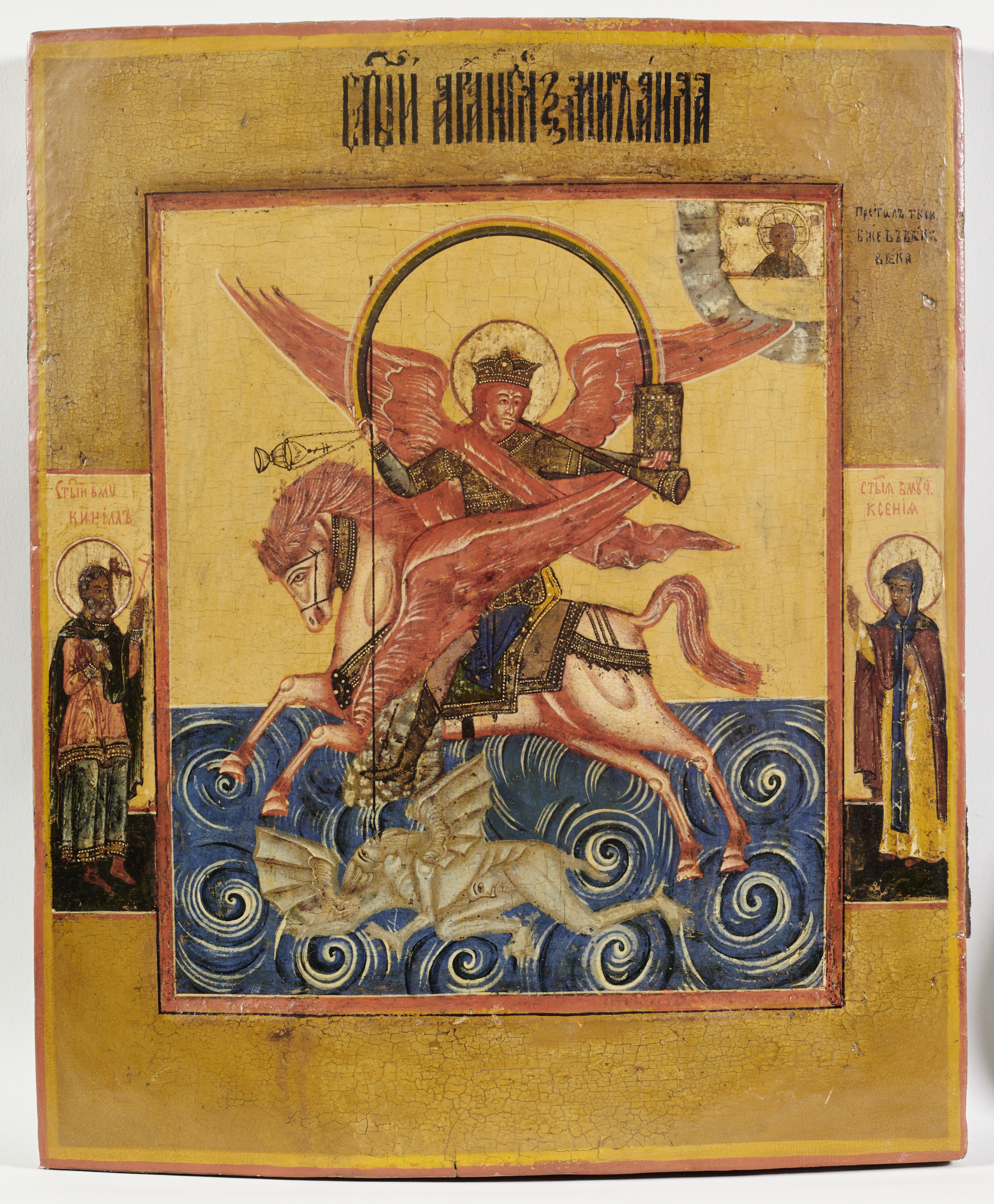 Szczególnym wizerunkiem w tradycji prawosławia moskiewskiego jest ikona św. Archanioła Michała Archistratega Niebiańskich Mocy. Obraz odwołuje się do Księgi Apokalipsy św. Jana, ale nie jest ilustracją jej treści. Na prezentowanej ikonie Archanioł Michał jako uskrzydlony zbrojny jeździec o czerwonym jak słońce obliczu, z obłokiem pod stopami, jest zwiastunem czasów ostatecznych (Ap. 10,1), galopuje na czerwonym skrzydlatym koniu nad otchłanią, z której wyłania się smok – strącony szatan (Ap. 20, 2-3). Przy ustach Archanioła pojawia się obwieszczająca Sąd trąba, w szeroko rozpostartych rękach – Ewangelia, kadzidło, krzyż i włócznia (Ap. 8,3), pomiędzy dłońmi rozpięty łuk tęczy (Ap. 10, 1-2 i 7-8). Popiersie młodzieńczego Chrystusa Emmanuela za stołem przywołuje tajemnicę Wcielenia i Ofiarę Zbawczą Chrystusa. Wzorem dla tego typu ikon były starsze bizantyjskie i ruskie przedstawienia Archanioła jako przewodnika na drodze ku zbawieniu. Wizerunek apokaliptycznego Archanioła Michała ukształtował się w kręgach państwowo-cerkiewnej władzy w Moskwie w XVI w. Niewykluczone, że temat został opracowany w otoczeniu metropolity Makarego za rządów Iwana IV Groźnego. Ikona zawierała przesłanie teologiczno-dydaktyczne. Po upadku Bizancjum państwo moskiewskie miało być kontynuatorem chrześcijańskiego Konstantynopola – Trzeciego Rzymu wybranego przez Boga na drodze do zbawienia i krzewienia wiary. Temat miał wyrażać między innymi ideę bożego wybraństwa państwa moskiewskiego, którego szczególnym opiekunem był Archanioł Michał Archistrateg – przewodnik carstwa rosyjskiego w czasach ostatecznych, jako ostoi prawowiernego chrześcijaństwa.
