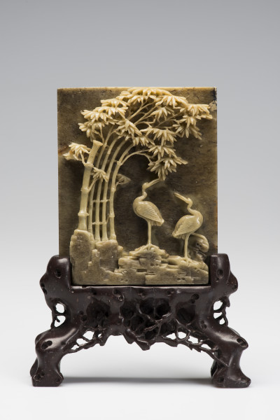 Parawanik do osłaniania palącej się świecy z przedstawieniem dwóch żurawi stojących pod elegancko nachylonymi nad ptakami ulistnionymi bambusami. Płytka osadzona w ciemniejszej podstawie w formie korzeni lub zerodowanej skały.