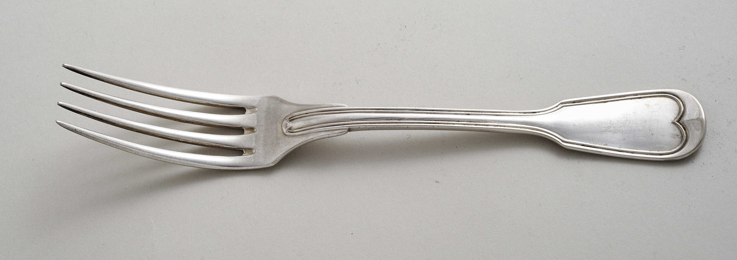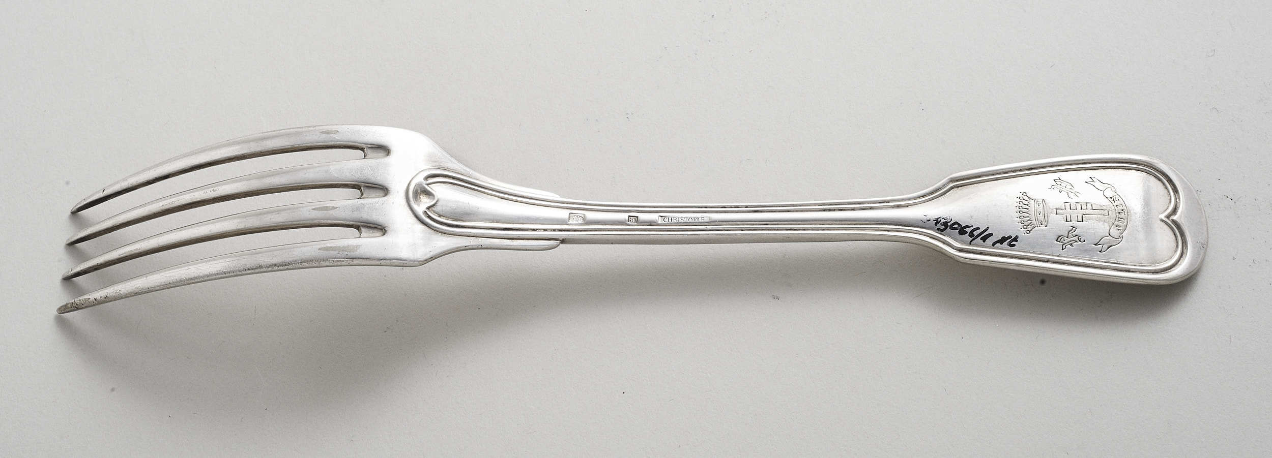 Czterozębny widelec stołowy posiada płaski trzonek z rozszerzonym zakończeniem ozdobiony podwójnym profilowaniem. Na rewersie w dolnej części trzonka widoczna jest korona hrabiowska a pod nią herb Potockich - Pilawa. Po bokach symetrycznie rozmieszczone litery R i P a pod herbem widoczna szarfa z napisem „Julin”. Ponadto na przewężeniu trzonka, od spodu wybito punce i stempel producenta „Christofle”.
