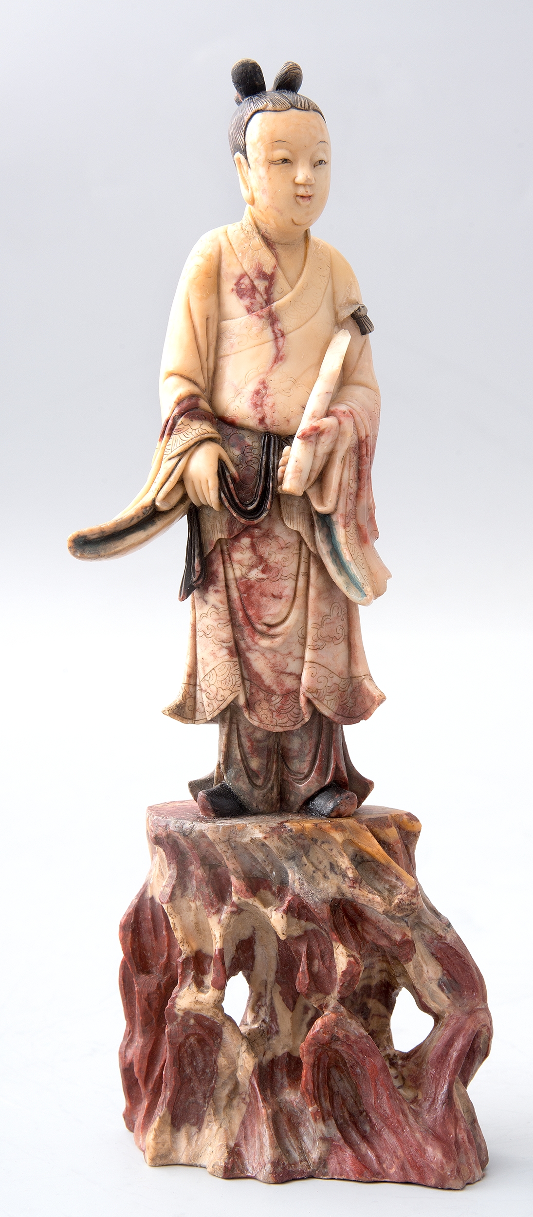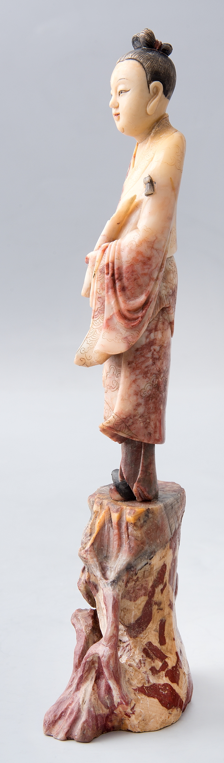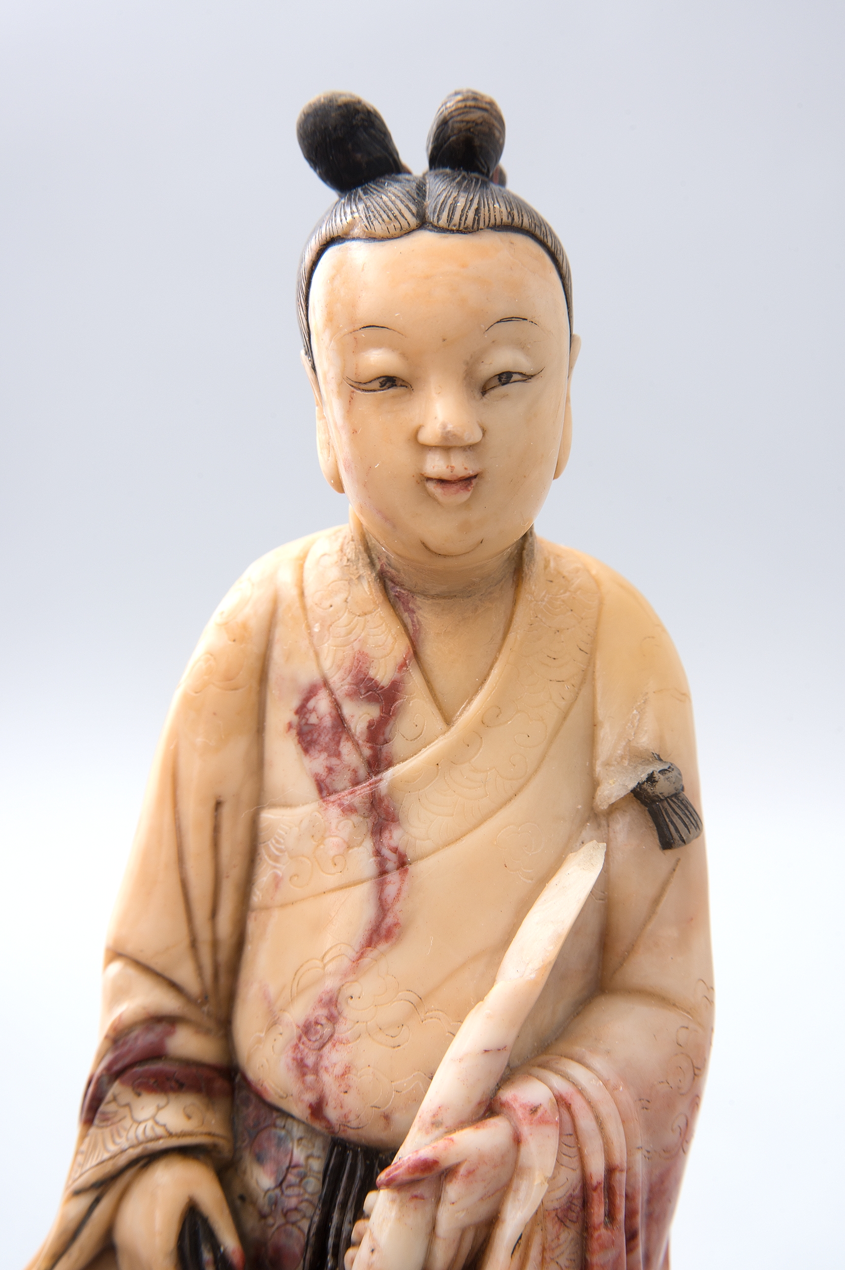 Steatyt, nazywany też słonińcem czy kamieniem mydlanym, jest jednym z bardziej popularnych surowców w chińskim rzemiośle artystycznym, i nie tylko. Dzięki wysokiej zawartości talku w składzie tej skały, wahającej się od 30 do 80 procent, steatytu używano do tworzenia różnorodnych przedmiotów, również codziennego użytku. Miękkość kamienia pozwalała na szybkie i niewymagające specjalnych narzędzi obrobienie tego materiału. Stosunkowo dobra dostępność do surowca wpływała na jego powszechność i powiązaną z tym cenę. Kolorystyka kamienia mydlanego jest bardzo szeroka. Skały przybierają barwy bieli, różu, szarości, czerni, czerwieni, brązu, fioletu i zieleni. Najwcześniejsze chińskie wyroby z kamienia mydlanego datuje się na 3000 lat temu. Jedne z piękniejszych, tzw. Qingtian, powstały w latach 420-581.