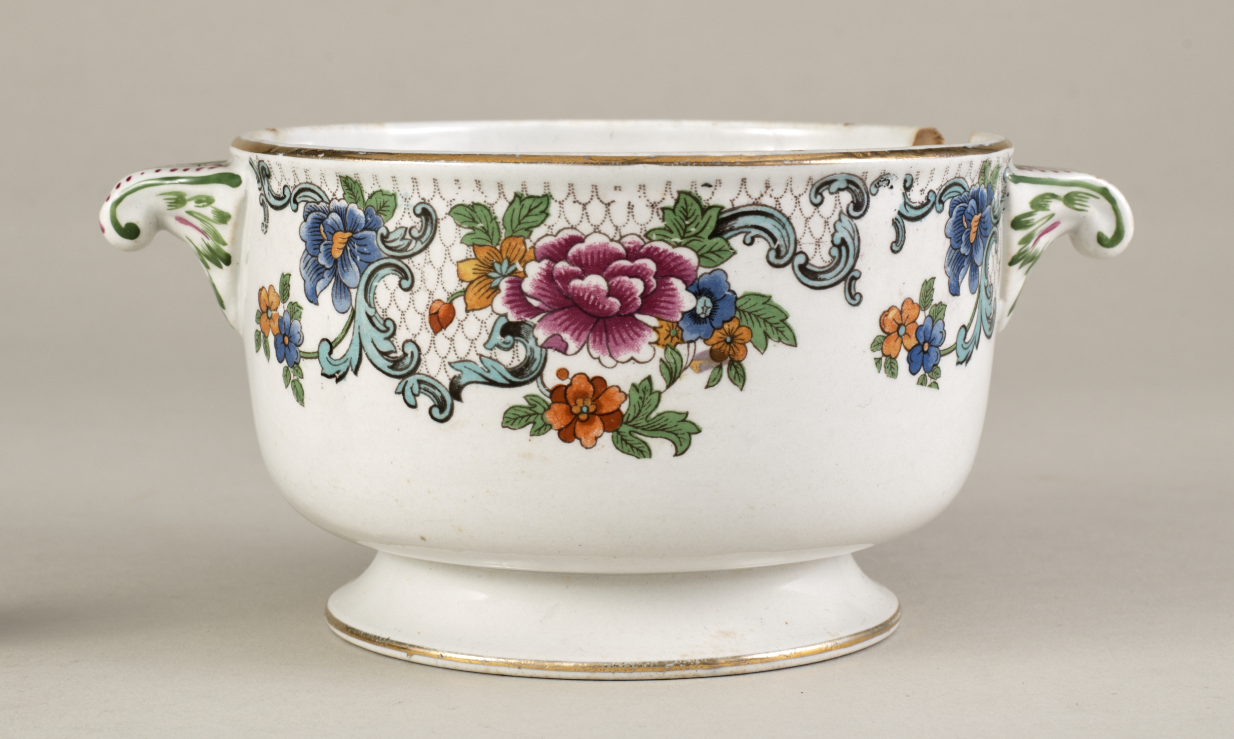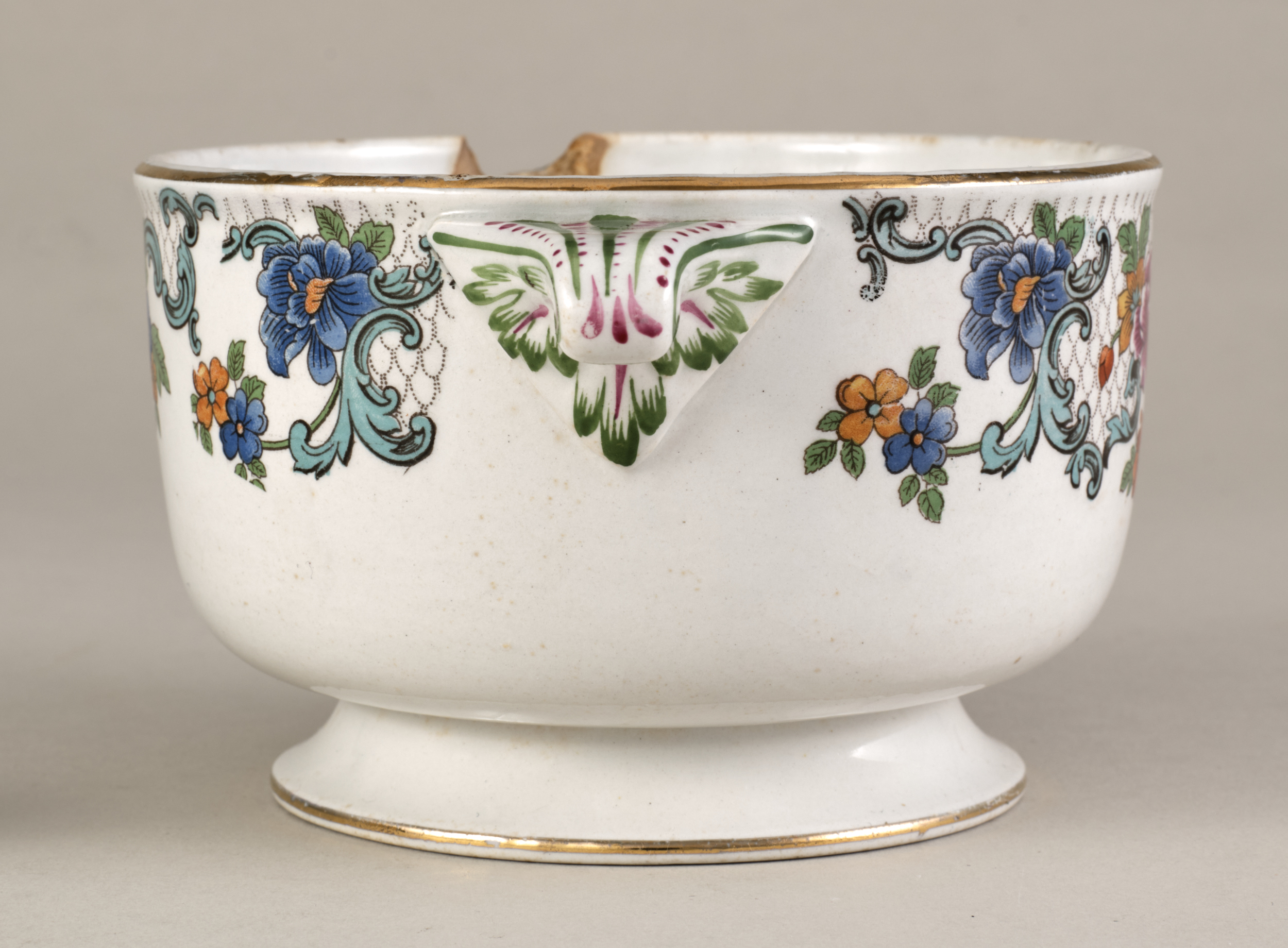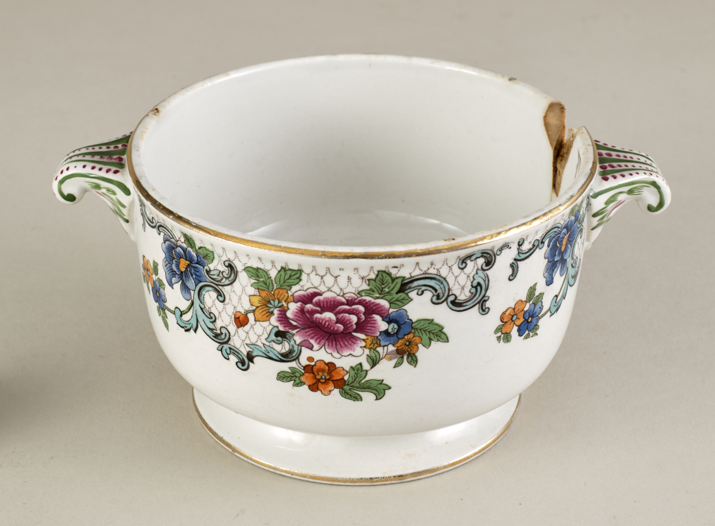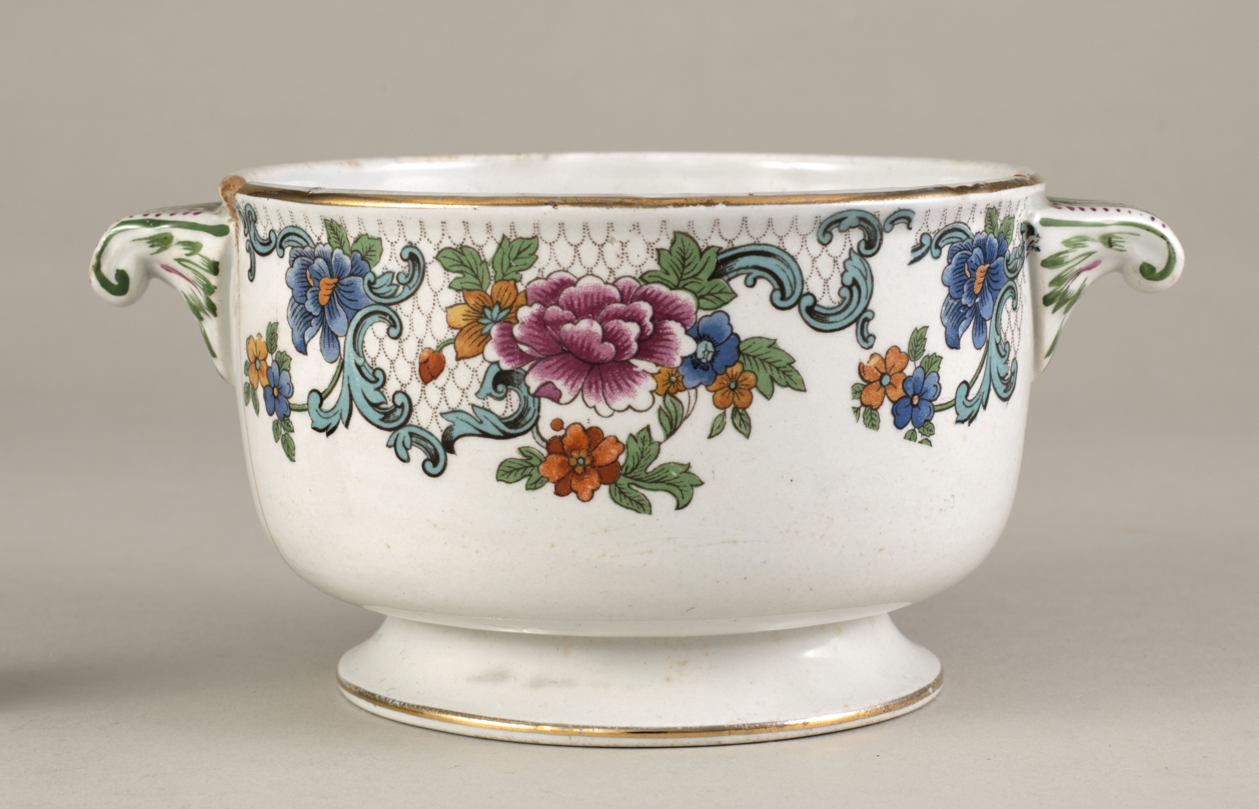 Sosjerka – naczynie wykonane z dość grubego białokremowego fajansu, w kształcie cylindrycznej czarki. Uchwyty wykonano w formie dwóch konsol, trójkątnych elementów zakończonych wolutą. Dekorację malarską sosjerki tworzy sześciobarwna kalkomania złożona z asymetrycznych roślinnych kompozycji, wzorowanych na sztuce rokoko. Z dwóch stron naczynia występują asymetryczne i wydłużone kompozycje stylizowanych esownic w kolorze morskiej zieleni, przeplatających się z dwoma dużymi kwiatami w kolorze bordowym i niebieskim oraz czterema drobnymi gałązkami z kwiatami. Cała kompozycja tworzy jakby fantazyjne girlandy podwieszone u brzegu wazy, a powstałe między nimi, nieregularne pole wypełnia wzór delikatnej siatki z wydłużonymi oczkami, zaznaczony drobnymi brązowymi punktami. Brzeg wazy, stopka oraz brzeg pokrywki laminowane złotym prążkiem.