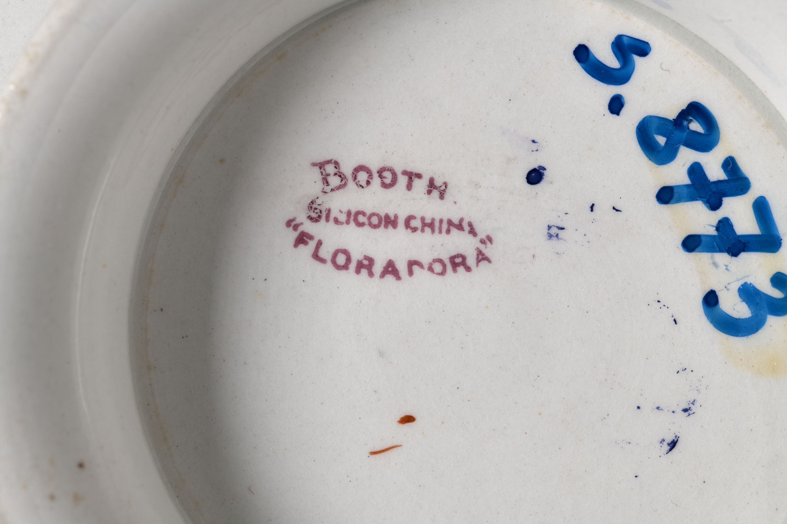 Na odwrocie sosjerki znajduje się sygnatura producenta, stemplowana brązowym kolorem „BOOTHS”, BOOTHS/SILICON CHINA/”FLORADORA”. Szkliwo cienkie i przejrzyste.