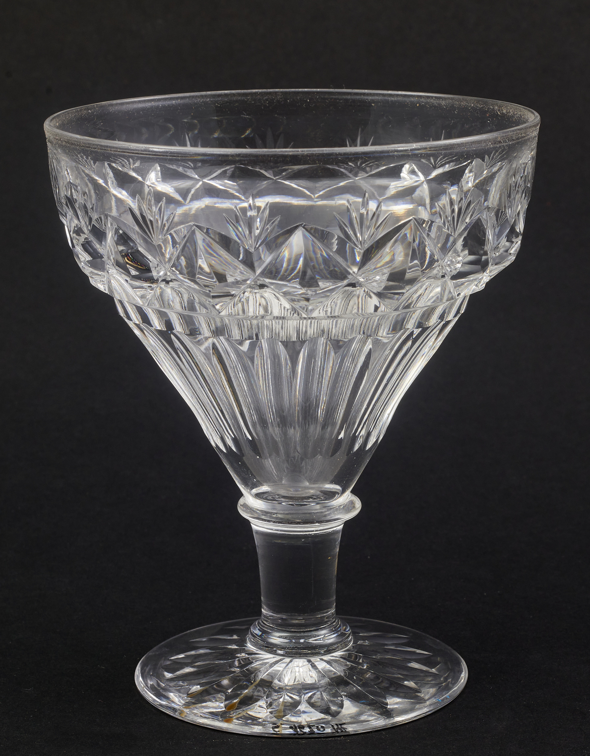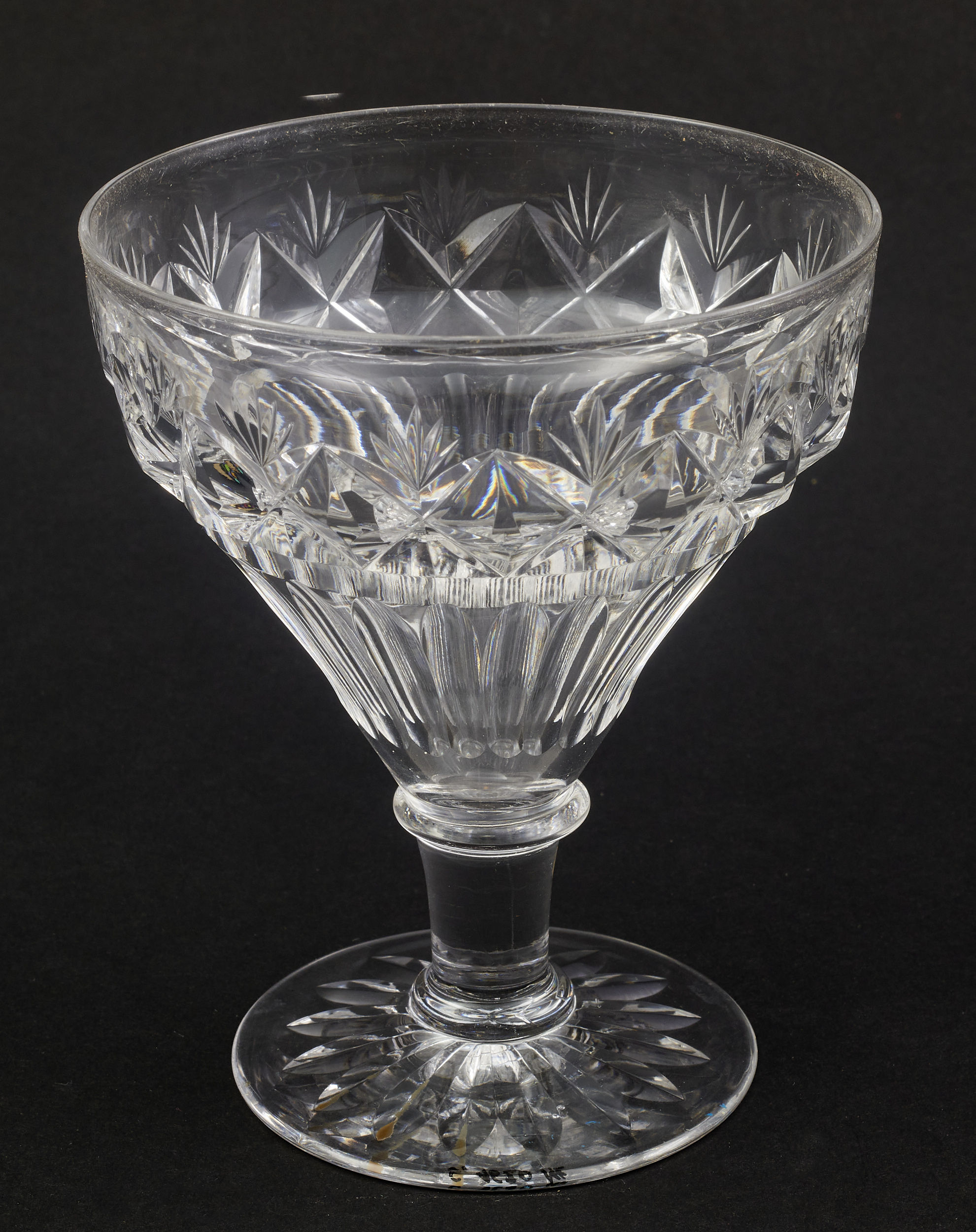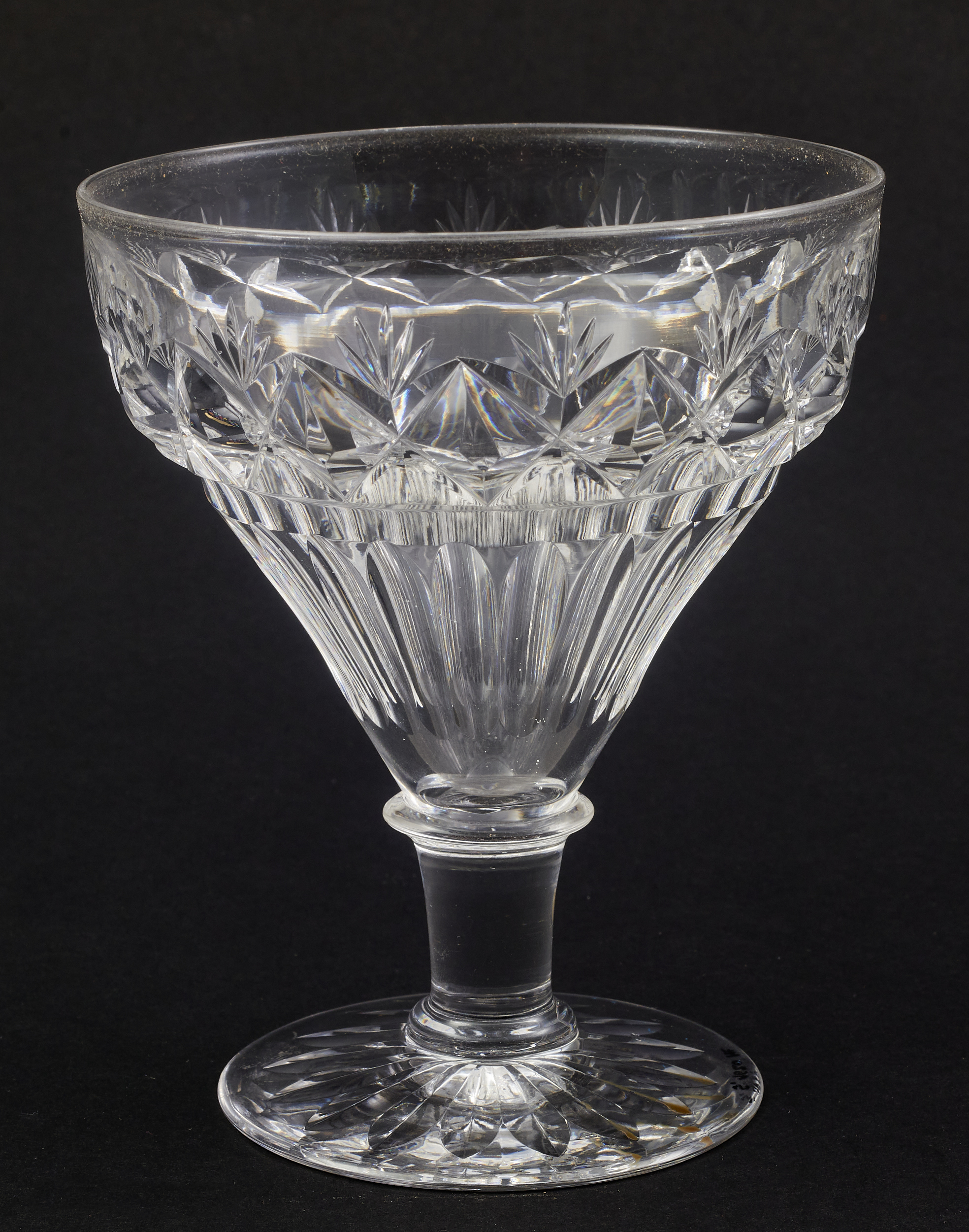 Kieliszek duży, wykonano ze szkła kryształowego. W zbiorach łańcuckich znajduje się także jeszcze pięć takich kieliszków. Zostały wykonane na przełomie XIX-XX wieku w Anglii, w stylu secesyjnym.