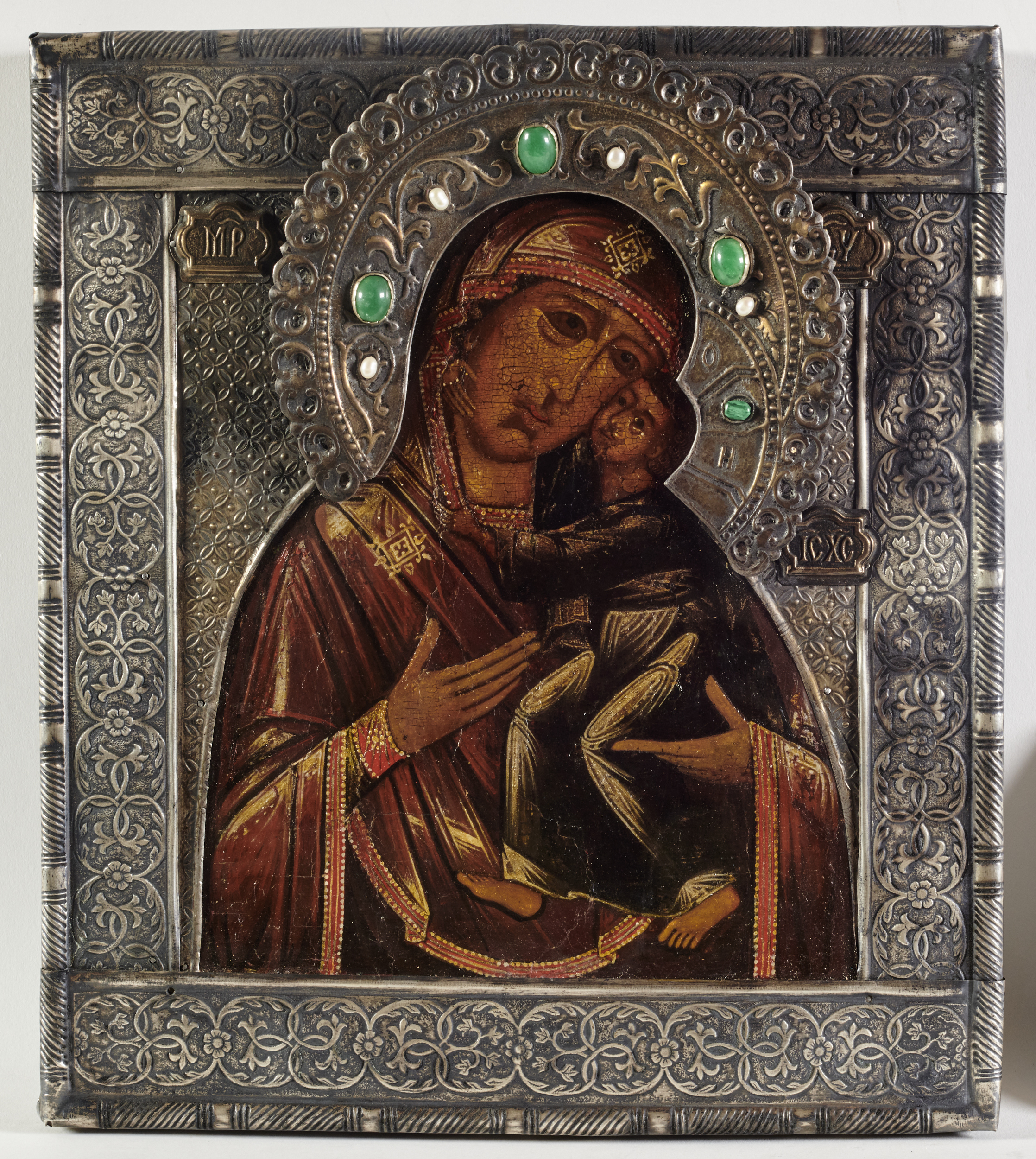 Pierwowzorem prezentowanej ikony jest znany na Rusi od 1314 r. wizerunek Bogurodzicy Eleusy Tołgskiej nazwany objawionym. Należy on do jednego z trzech wariantów przedstawienia. Tradycja łączy powstanie pierwowzoru z Prochorem – biskupem Jarosławia położonego w górnym biegu Wołgi. W drodze powrotnej z terenów Górnego Zawołża biskupowi objawiła się nocą ikona, która zawisła na smudze nieziemskiego światła u ujścia rzeki Tołgi (dopływ Wołgi). W miejscu objawienia zbudowano męski monastyr, a umieszczony w nim obraz zasłynął cudami. Jednym z głośniejszych było uzdrowienie chorującego na nogi cara Iwana IV Groźnego. Z tej okazji władca ufundował murowaną świątynię dla cudownego wizerunku. Tołgski monastyr funkcjonował do 1926 r. Po jego likwidacji ikonę przeniesiono do muzeum. W murach klasztoru aż do 1987 r. istniała kolonia karna dla młodocianych przestępców. Dopiero na początku XXI w. obraz powrócił do odnowionej świątyni. Wizerunek Bogurodzicy Tołgskiej jest niemal zwierciadlanym odbiciem Fiodorowskiej Eleusy z pobliskiej nadwołżańskiej Kostromy. W obrazach Tołgskiej Eleuzy charakterystycznym wyróżnikiem są „kroczące” nogi siedzącego Chrystusa i jego ciemnozielone długie szaty.
