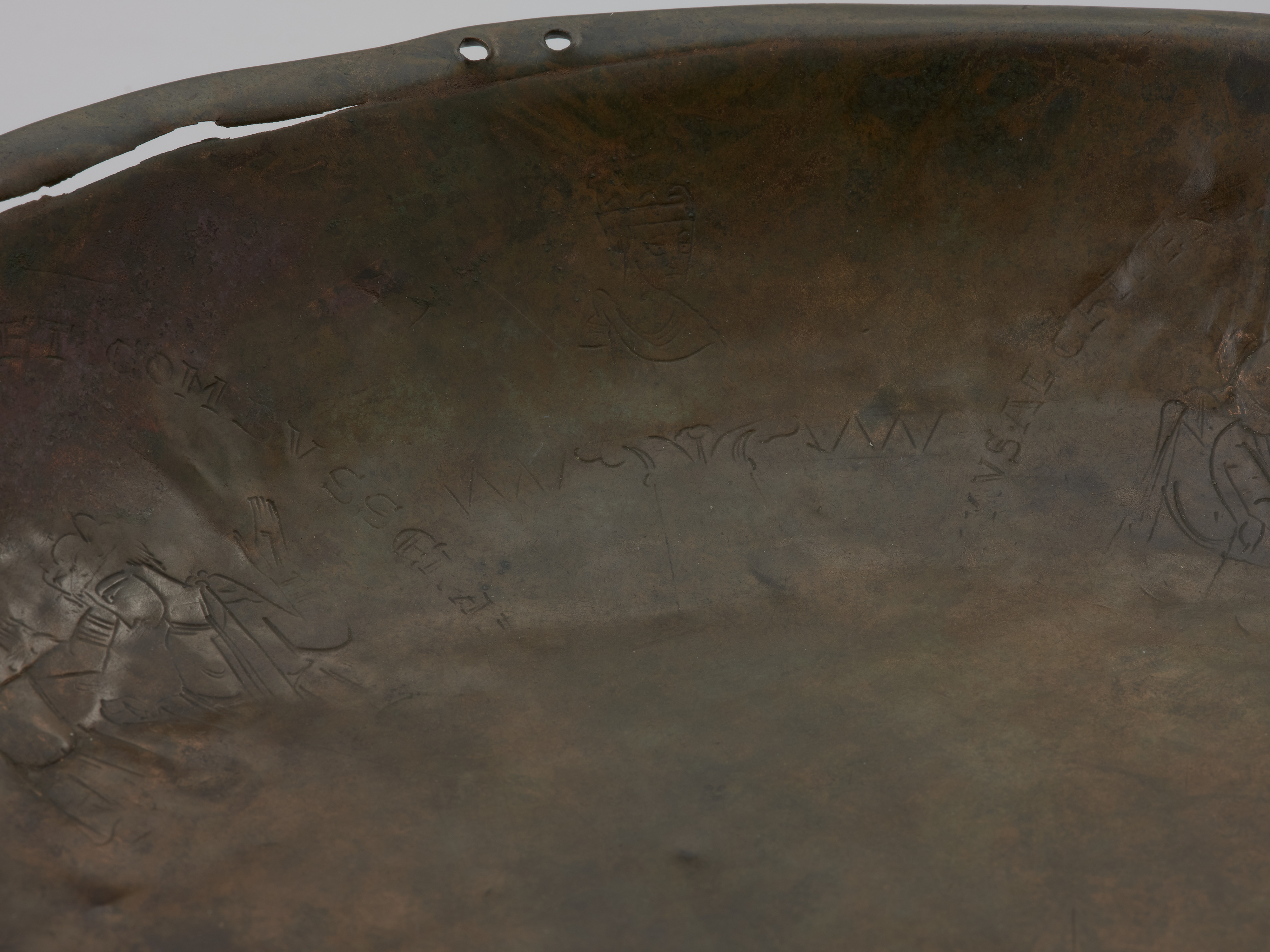 Na wewnętrznej powierzchni widoczne są cztery, rozmieszczone symetrycznie, owalne medaliony otoczone napisami w języku łacińskim majuskułą romańską. Wewnątrz każdego medalionu znajdują się przedstawienia figuralne. Dolne części inskrypcji są już dzisiaj nieczytelne ze względu na sposób użytkowania misy. Uszkodzona jest także jedna ze scen. Pomiędzy medalionami widoczne są męskie koronowane popiersia.