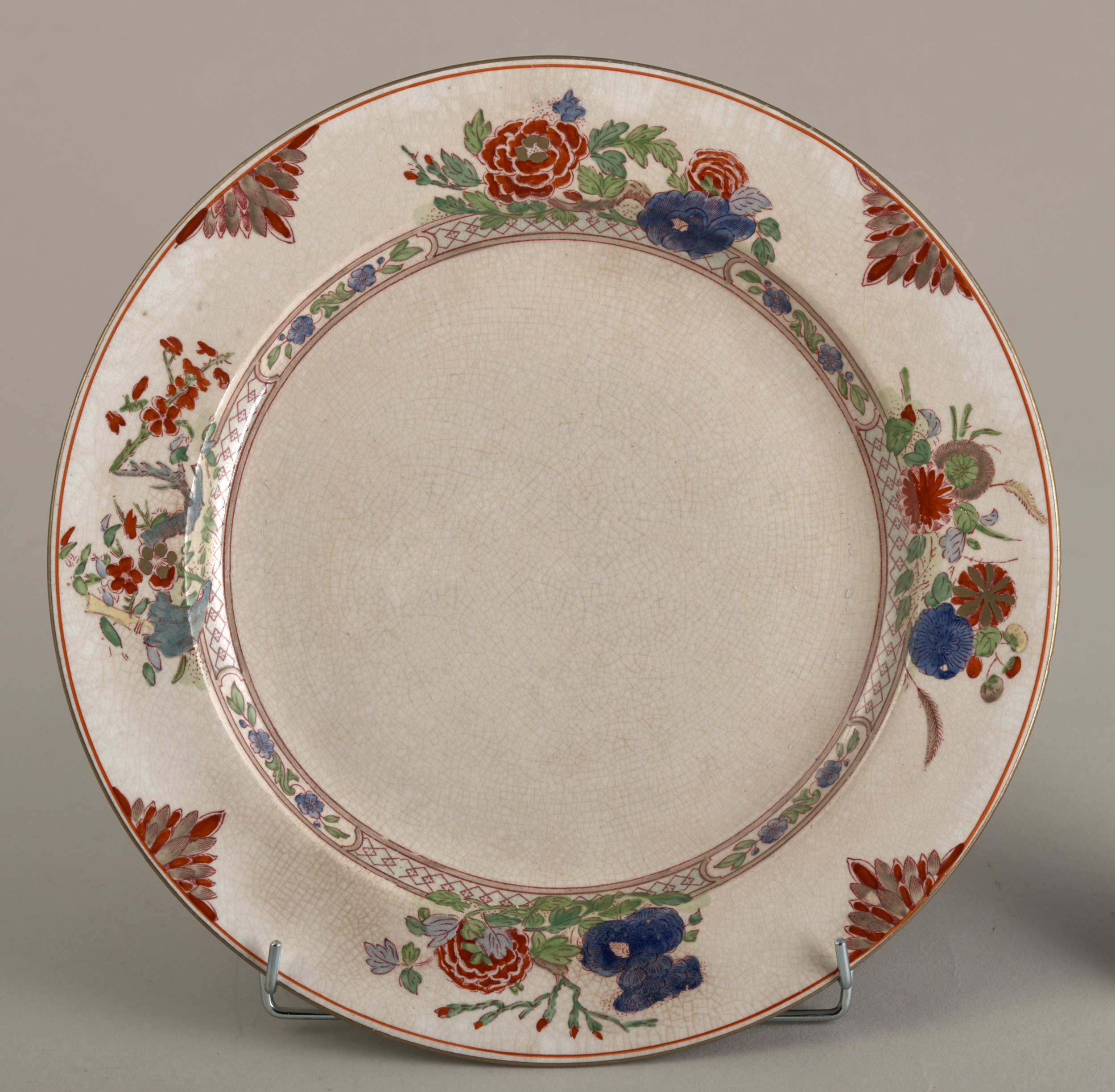 Talerz płytki z dekoracją chinizującą Talerz płytki, fajansowy o lekko kremowym odcieniu, pokryty siatką ozdobnych spękań szkliwa, zdobiony dekoracją malarską w typie dalekowschodnim o motywach roślinno – geometrycznych, a skoncentrowaną w partii kołnierza. Szczegółowy rysunek wzoru dekoracji naniesiony drukiem w kolorze purpurowym, następnie już na szkliwie- ręcznie podmalowany farbami w kilku kolorach: rdzawa czerwień, ciemnoniebieski, zielony, piaskowo-beżowy. Natomiast w mniejszości użyto farb w kolorach: jasnoniebieskim, stalowozielonym, seledynowym i żółtym. Na dekorację tę składa się pas ornamentu geometrycznego z motywem rombów, biegnący tuż pod krawędzią wrębu, następnie cztery duże kompozycje kwiatowo-roślinne, a jedno z nich z motywem połamanego krzewu, rozmieszczone na kołnierzu, blisko pasa ornamentu. Kompozycje te rozdzielone są liściastymi półrozetami. Złoto znajduje się jedynie w pasku lamującym brzeg kołnierza i drobnych elementach trzech kwiatów w dużych kompozycjach. Odwrocie talerza pokryte jest pod szkliwem szarymi plamkami. Widoczne oznakowania: w centralnym punkcie litera „B”, sygnatura fabryki „BOOTHS” – obydwa znaki stemplowane w masie i duża pieczęć drukowana podszkliwnie w kolorze bordowym: „MANUFACTURED FOR:/A.LA.PAIX,/34.AVENUE DE L’OPERA, /PARIS./IMPORTE D’ANGLETERRE”. Pod nią napis z aktualnym nr inwen. Anglia, Hanley, XIX w.