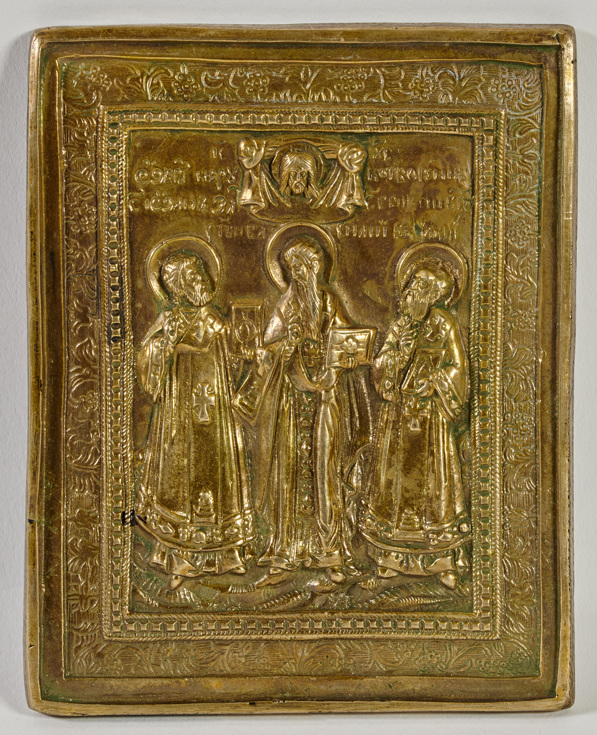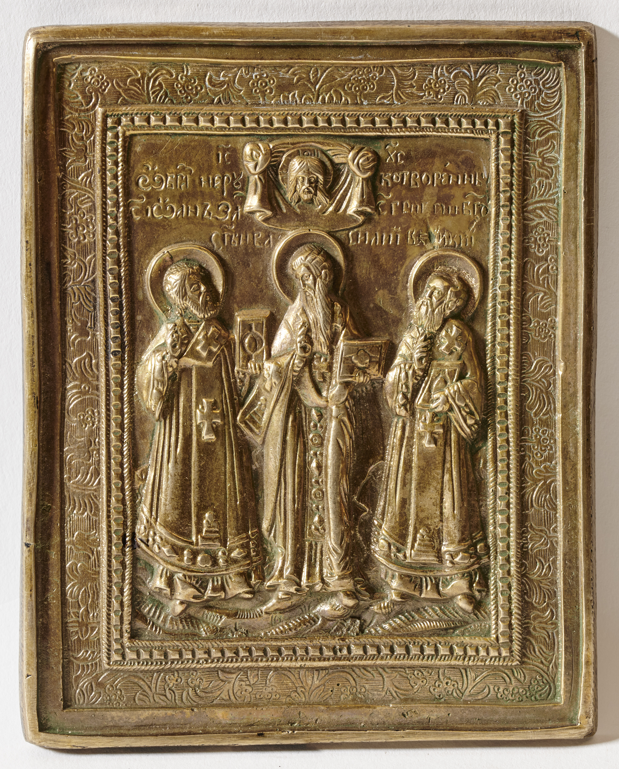 Powstanie wspólnego wizerunku trzech Ojców Kościoła w ikonografii wschodniego chrześcijaństwa wiąże się z cudownym objawieniem, którego doznał w 1084 r. metropolita Jan z Euchaity w Azji Mniejszej (Pontos, obecnie Turcja) w czasach cesarza bizantyjskiego Aleksego I Komnena. Pochodzący z Kapadocji Bazyli Wielki (329-379) i Grzegorz Teolog (ok. 326-390) oraz pochodzący z Antiochii Jan Chryzostom (350-407) nakazali oddawanie im czci w równym stopniu bez gradacji ważności. Gorące spory na tym tyle toczyły się w Konstantynopolu pomiędzy zwolennikami prymatu, a więc zwierzchniej pozycji w kulcie poszczególnych Ojców – bazylianami, gregorianami i joannitami. Uznając Ojców Kościoła za równych wobec Boga w rezultacie cudownego widzenia metropolity Jana z Euchaity ustanowiono obchody ich wspólnego święta 30 stycznia wg kalendarza juliańskiego (12 lutego wg kalendarza gregoriańskiego). Ojców Kościoła obrazuje się w pełnej postaci w szatach biskupich. Zazwyczaj centralne miejsce zajmuje Jan Chryzostom, ale nie jest to regułą, jak widać na prezentowanej ikonie.