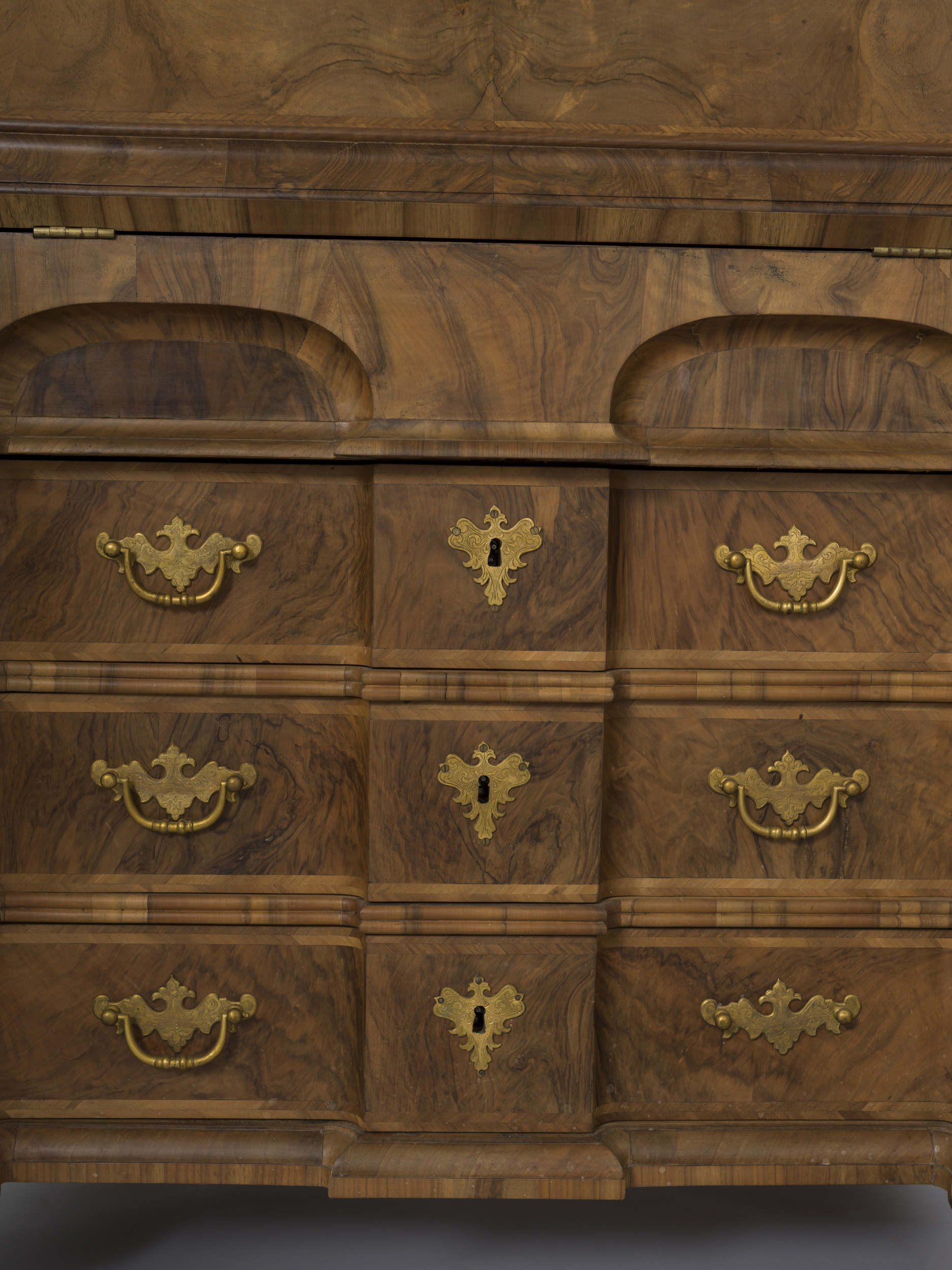 Typ angielskiej sekretery w stylu Williama i Mary zaliczany jest do jednego z większych osiągnięć meblarstwa angielskiego początku XVIII w. pod względem technicznym i artystycznym, który stał się kanonem naśladowanym przez europejskie warsztaty przez kolejne dziesięciolecia; do nich należy wilanowska sekretera wykonana z orzecha włoskiego. Jest meblem dwuczęściowym zwieńczonym wysokim przerywanym łukiem gzymsu ze złoconymi sterczynami. Drzwiczki części górnej z lustrami, zamykają wnętrze szafki z zestawem szufladek, skrytek i pionowych podziałek na korespondencję, dokumenty a także na tajemnice. Poniżej ukośna klapa należąca do dolnej części mebla, tworząca po otwarciu pulpit do pisania, odkrywa wnętrze wyposażone w komory, szufladki i półeczki podobnie jak w górnej części mebla. Pod nimi, znajdują się trzy duże szuflady. Najbardziej intrygującą częścią konstrukcji mebla są liczne tajemne, zamaskowane schowki umieszczone w najbardziej nieoczekiwanych miejscach, zabezpieczone sprężynami zatrzaskowymi, które zwolnić może tylko znający ich tajemnicę. Dekorację mebla stanowi ozdobny układ fornirów orzechowych o specyficznych symetrycznych układach słoi, tworzących niepowtarzalny ornament, wyważone, profilowane gzymsy i okucia z brązu złoconego. Meble tego typu pojawiły się we wnętrzach pałaców hetmanowej Elżbiety Sieniawskiej w początku XVIII w. Sekretera jest jedną z trzech sekreter zachowanych w zbiorach wilanowskich w tym parą do analogicznej (Wil. 2883) i jednej bardzo podobnej (Wil.3078)