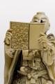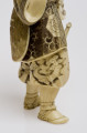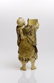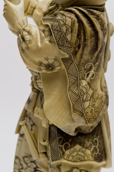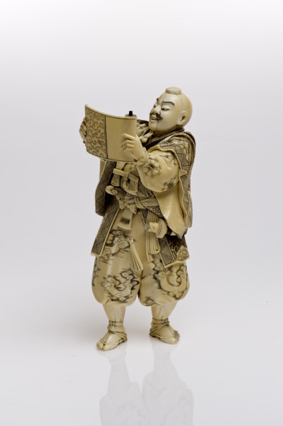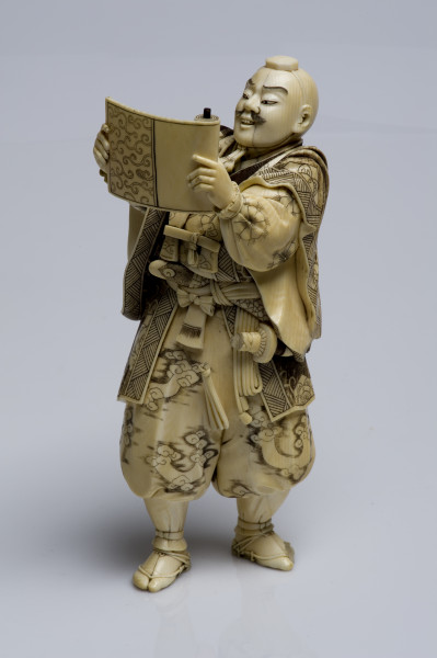 Miniaturowe rzeźby w drewnie lub kości, obecne są w kulturze japońskiej od ponad trzystu lat i należą do jednej z tych dziedzin sztuki japońskiej, która w Europie od drugiej połowy XIX wieku kojarzy się nieodmiennie z oryginalnością i niezwykłością twórczości japońskich artystów. Jest także uważana za zwierciadło japońskich obyczajów, wierzeń, historii, widzenia świata, stosunku do przyrody. Figurka przedstawiająca samuraja ze zwojem jest przykładem dekoracyjnej rzeźby, wykonywanej od 2 połowy XIX w. z kości słoniowej. Rzeźby te nazywane okimono (co po japońsku oznacza ozdobę, ornament), utrzymane były w realistycznej konwencji. Są one jednocześnie popisem wirtuozerii, przejawiającej się w dbałości o najdrobniejsze detale i niezwykle precyzyjnym ich oddaniu, tak by całość była nie tylko starannie opracowana, ale i dekoracyjna. Okimono przedstawiały różne bóstwa, postacie z dalekowschodniej mitologii i literatury, wojowników, postacie z ludu (tragarzy, handlarzy, ogrodników), gejsze itp. Te niewielkie, wolnostojące figury, rzeźbione w kości słoniowej, powstawały przede wszystkim dla kolekcjonerów z Zachodu, wśród których cieszyły się i nadal cieszą wielkim uznaniem. Tworzyli je mistrzowie netsuke, którzy zaczęli wykonywać większe okimono, bowiem zapotrzebowanie na tradycyjne elementy japońskiego stroju malało wraz z coraz powszechniejszym korzystaniem z europejskich ubiorów. Netsuke były to kunsztowne, miniaturowe rzeźby, wykonane z głównie z drewna lub kości słoniowej używane w Japonii od ok. XV w. Służyły jako breloki do zbalansowania przewieszonych przez pas obi sakiewek, tabakierek, przyborów do palenia, puzderek na leki (inrō) itp. Figurka przedstawia mnicha – wojownika Benkeia. Saito Musashibo Benkei (1155–1189) jako postać historyczna był bohaterem wielu legend i sztuk teatralnych, jako wzór lojalności i bohaterstwa. Figurka ze zbiorów toruńskiego muzeum jest ilustracją sceny ze sztuki „Kanjincho” („Lista subskrypcyjna”). Benkei odczytuje z pustego zwoju rzekomy list polecający ze świątyni, pełniący rolę glejtu. Ta brawurowa akcja uratowała życie Minamoto-no Yoshitsune. Benkei był postacią historyczną, ale później obrosła ona na wpół legendarnymi wydarzeniami, które zostały zobrazowane w sztukach teatralnych.