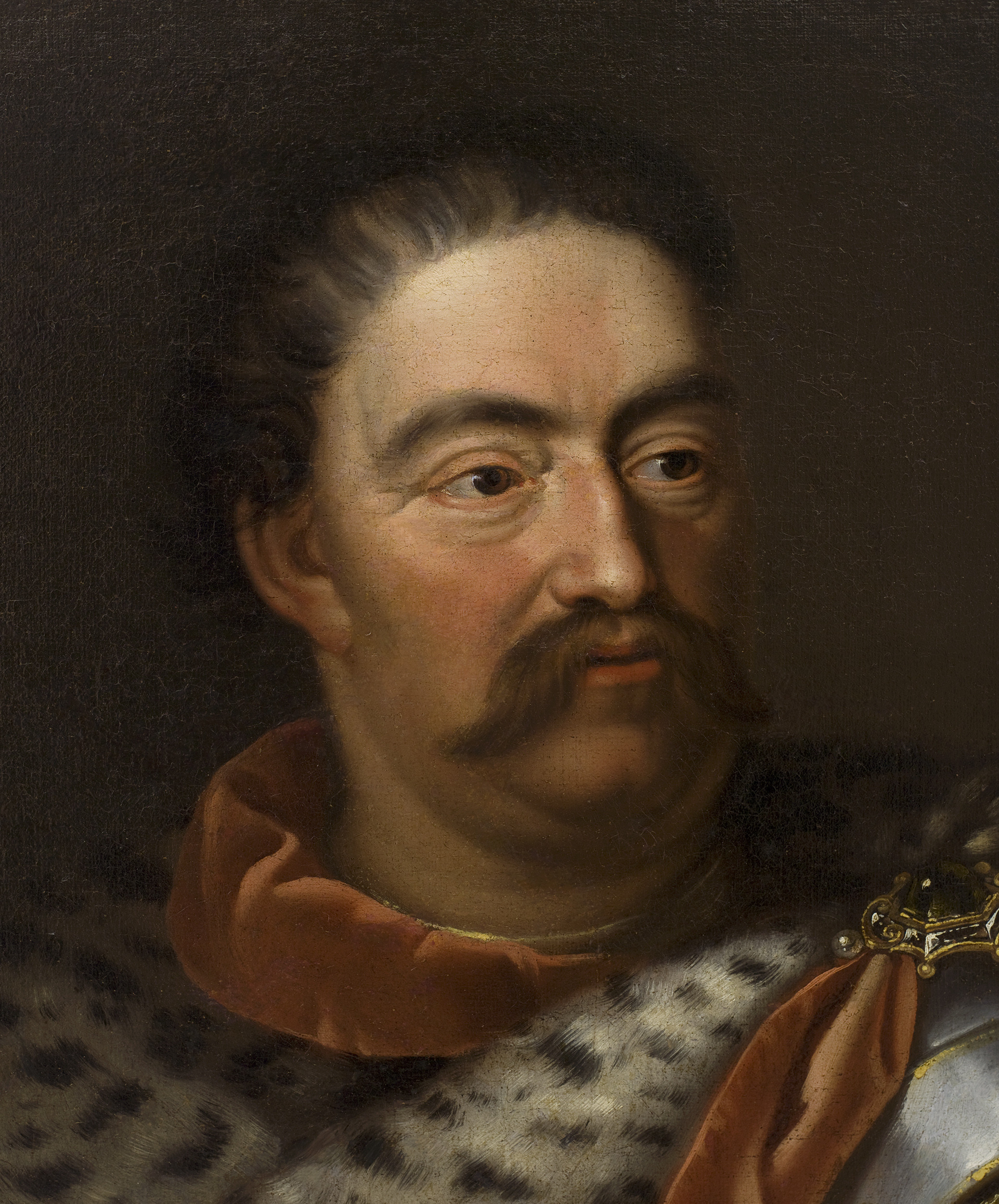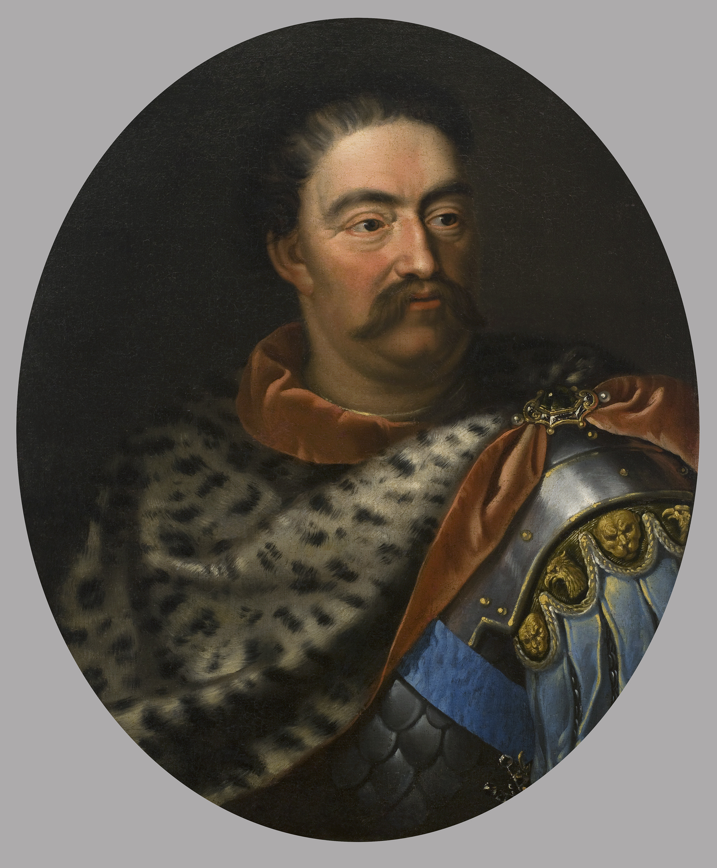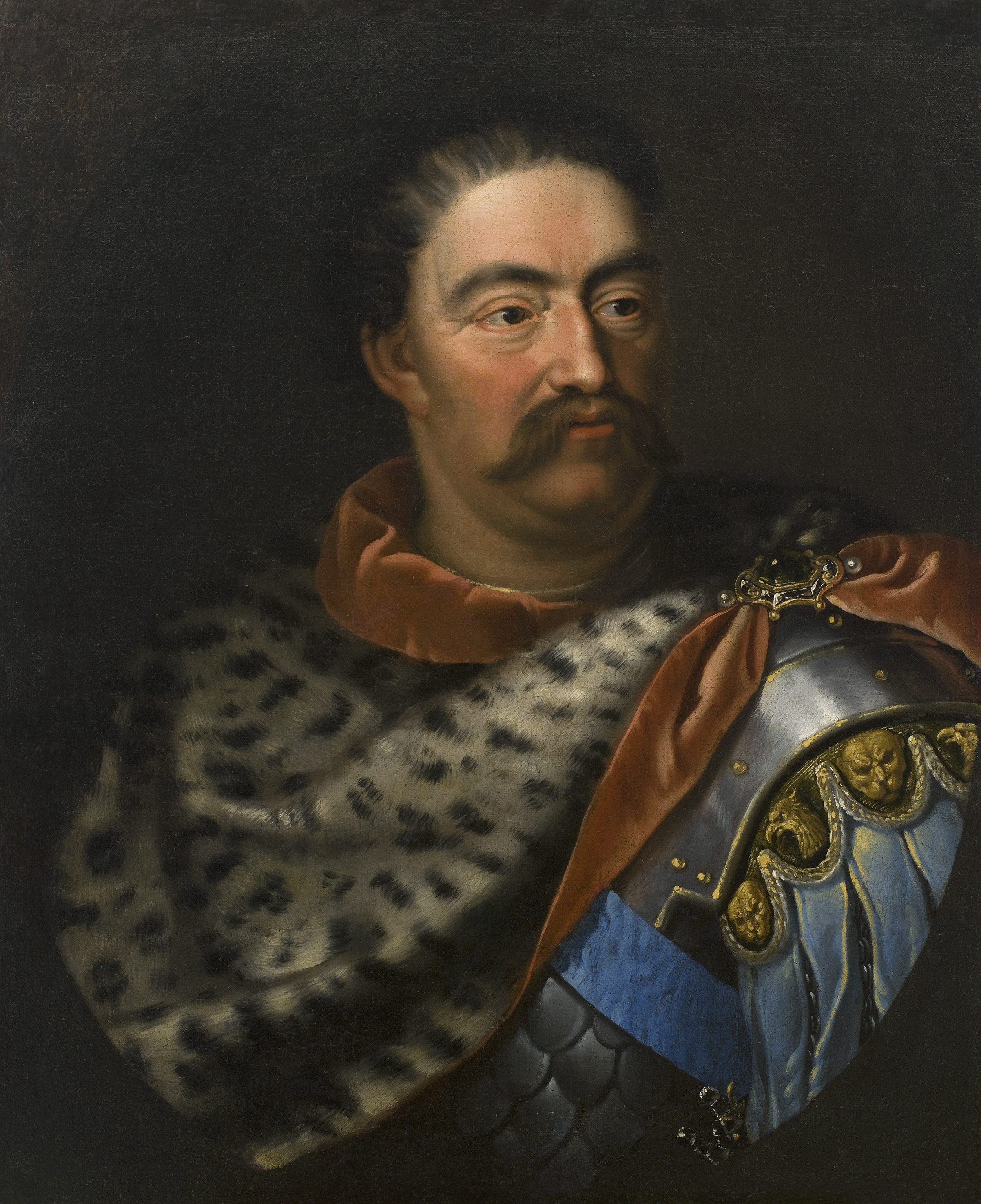 Jan Sobieski (1629-1696), król Polski Jan III (od 1674); skóra lamparcia; opończa; zbroja karacenowa; karacena; pteryges; Order Świętego Ducha; Order Świętego Michała; Jan Tricius (?-1692).