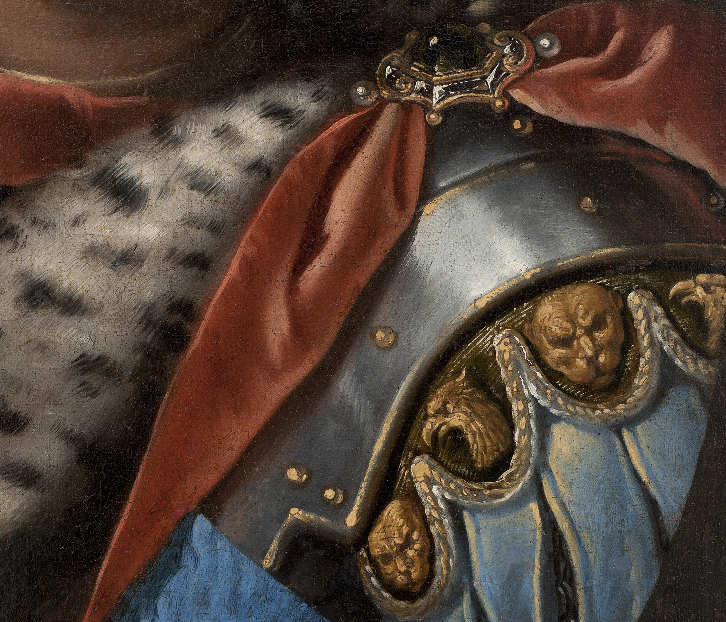Do karaceny zostały przytroczone skórzane paski, tak zwane pteryges, zdobione naprzemiennie lwimi maskami i głowami polskich orłów heraldycznych. Pierś króla przecina diagonalnie błękitna wstęga, która przypomina o wysokich odznaczeniach portretowanego, nadanych mu w 1676 r.: Orderze Świętego Ducha i Orderze Świętego Michała, od 1661 r. uznawanych za połączone ze sobą. Autorstwo portretu, łączone dawniej - nie bez wątpliwości - z Janem Triciusem (?-1692), obecnie jest przypisywane nieznanemu malarzowi z kręgu dworu królewskiego. Więcej na temat portretu zob. artykuły udostępnione online: D. Walawender-Musz, Portret króla Jana III w lamparciej skórze, https://www.wilanow-palac.pl/portret_krola_jana_iii_w_lamparciej_skorze_1.html (dostęp: 12.08.2020); K. Sarnowska-Jackowska, Nieznany portret króla Jana III Sobieskiego. Przyczynek do ikonografii królewskiej, https://www.wilanow-palac.pl/nieznany_portret_krola_jana_iii_sobieskiego_przyczynek_do_ikonografii_krolewskiej.html (dostęp: 12.08.2020). Obraz znajduje się w zbiorach Muzeum Pałacu Króla Jana III w Wilanowie od 2010 r. (zakup).