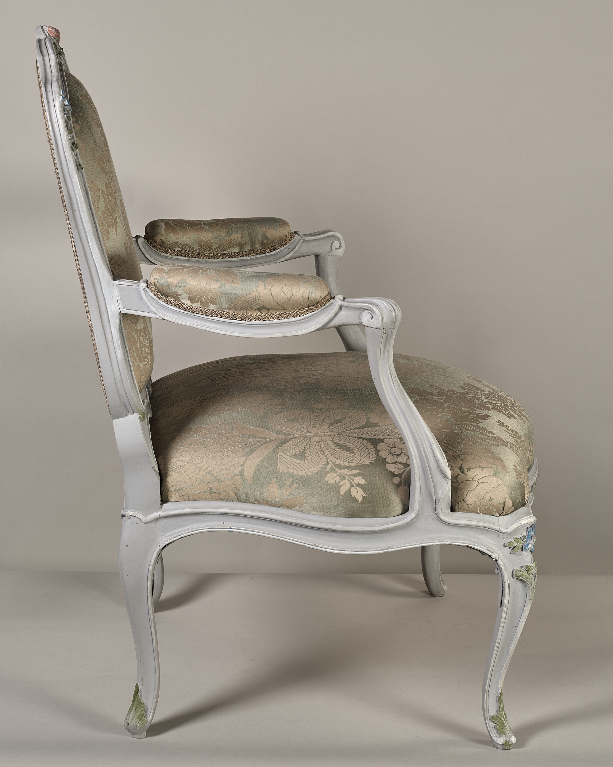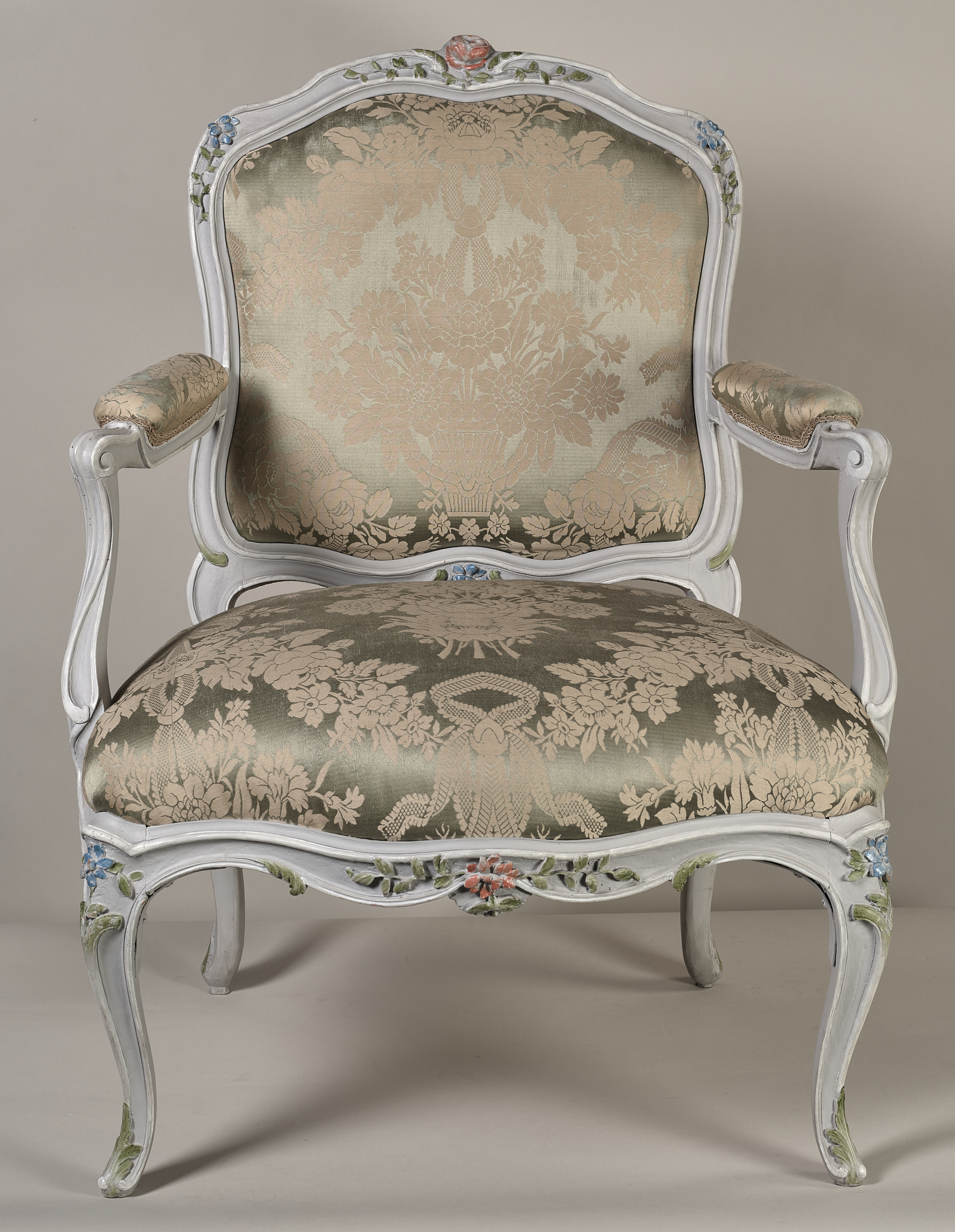 Prezentowany fotel należy do kompletu mebli znajdujących się na wyposażeniu neorokokowego Salonu Narożnego (Rogowego) w reprezentacyjnym zachodnim skrzydle łańcuckiej rezydencji. Fotel jest jednym z czterech (S.1383MŁ; S.1384MŁ; S.1393MŁ; S.4070MŁ) sygnowanych, wykonanych w warsztacie Etienne Saint-Georges (+1737), który pracował pod szyldem „Grand Saint - Georges” przy zamieszkałej przez stolarzy meblowych paryskiej rue de Cléry. Mistrz oznaczał swoje wyroby odciśniętą na drewnie sygnaturą „STGEORGE”, z kółkiem pod mniejszą od pozostałych literą T. Znaku tego używano przez dziesięć lat po śmierci Etienne, gdy warsztatem kierowała jego żona Jeanne-Catherine Gareau, mająca na utrzymaniu czwórkę dzieci. Syn stolarza, Jean Etienne Saint-Georges (1723-1790), ożeniwszy się w 1746 r. i uzyskawszy w 1747 r. uprawnienia mistrzowskie, przejął warsztat i zaczął używać własnej sygnatury JSTGEORGES. Pozwala to określić przedział czasowy wykonania prezentowanego mebla na lata 1725-1747, gdy płynne kształty siedzisk, oparć i nóg oraz kwiatowa dekoracja snycerska wyznaczały modę francuskiego rokoka, zwanego od imienia króla stylem Ludwika XV. Do Łańcuta takie sprzęty kupowała w XVIII w. Izabela z Czartoryskich, żona marszałka wielkiego koronnego Stanisława Lubomirskiego. Pod koniec XIX w., w czasie przebudowy zamku podjętej przez Romana i Elżbietę Potockich, projektowanej przez Armanda Beauque i Alberta Pio, wiele dawnych mebli odnowiono, zmieniając tapicerkę na nową . Elżbieta z Radziwiłłów Potocka w swoich wspomnieniach napisała: „Tapicerzy przyjeżdżali z Wiednia Tepser i z Paryża Bucour. Wyciągało się stare meble z pod strychu i z różnych służbowych pokoi – całe urządzenie w salonie Boucher i w salonie rogowym, konsola drewniana w galerii, stały porozrzucane i zamalowane brunatną farbą po garderobach i na nich lampy i buty czyścili.”
