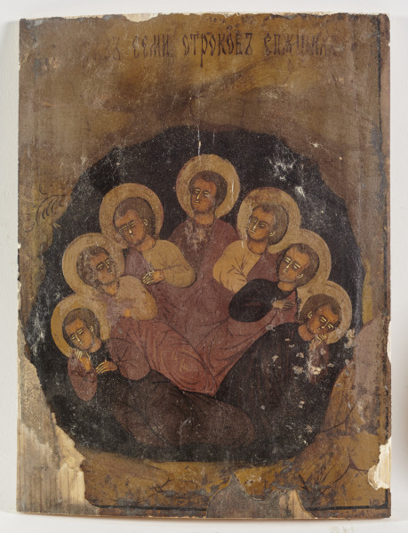 Legenda o siedmiu śpiących świętych z Efezu zrodziła się jako reakcja na herezję negującą wskrzeszenie ciał w czasie Paruzji czyli ponownego przyjścia Chrystusa. W IV -V w. na wschodzie chrześcijaństwa wątpiono by ciało, z którego po śmierci nic nie zostanie, mogło ponownie ożyć, czy wobec tego wskrzeszone będą tylko nienaruszone szczątki? Przeciwdziałając herezji posłużono się opowiadaniem o siedmiu Młodzieńcach, którzy w III w. ponieśli śmierć za panowania Decjusza Trajana. Młodzi arystokraci pełnili służbę wojskową i byli chrześcijanami. Odmówili oni złożenia ofiary bóstwom pogańskim na żądanie przybyłego do Efezu cesarza, ukryli się w jaskini i trwali na modlitwie. Cesarz kazał zamurować wejście do jaskini skazując ich na pewną śmierć. Zgodnie z legendą Młodzieńcy nie umarli a zasnęli i zostali obudzeni po blisko dwustu latach, gdy przypadkowo odsłonięto wejście do jaskini podczas prac budowlanych. Nie zdając sprawy z upływu czasu posłali jednego spośród siebie po chleb, a gdy ten chciał zapłacić monetami z podobizną Trajana, został podejrzany o ukrywanie skarbu i doprowadzony do zarządcy. Tłumacząc swoją niewinność zaprowadził mieszkańców Efezu do jaskini. Miejscowy biskup zrozumiał, że przebudzeniem Świętych po tak długim czasie Bóg wskazał na tajemnicę Zmartwychwstania Chrystusa by w ten sposób umocnić wiarę w zmartwychwstanie ciała. Opowieść o siedmiu świętych z Efezu dotarła na Ruś w XII w. za pośrednictwem ihumena Daniła, który opisując pielgrzymkę do Ziemi Świętej przytoczył apokryf o śpiących młodzieńcach. W rosyjskiej cerkwi prawosławnej wspominani są oni 17 sierpnia i 4 listopada (4 sierpnia i 22 października zgodnie z kalendarzem juliańskim). W tradycji wschodniego chrześcijaństwa Śpiący Młodzieńcy z Efezu są czczeni jako orędownicy w bezsenności, a ich wizerunki pojawiają się najczęściej w małej i drobnej plastyce, jak prezentowana ikona.