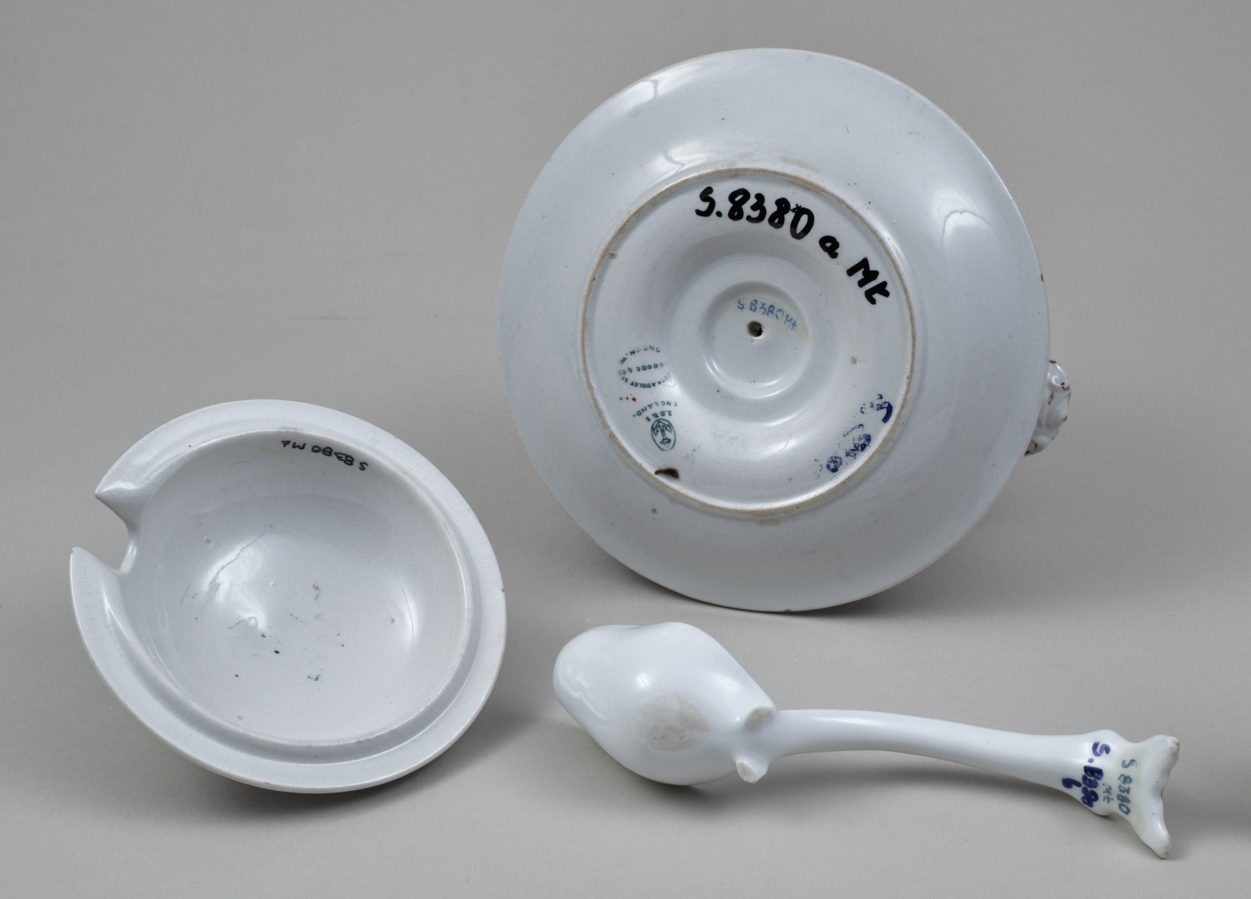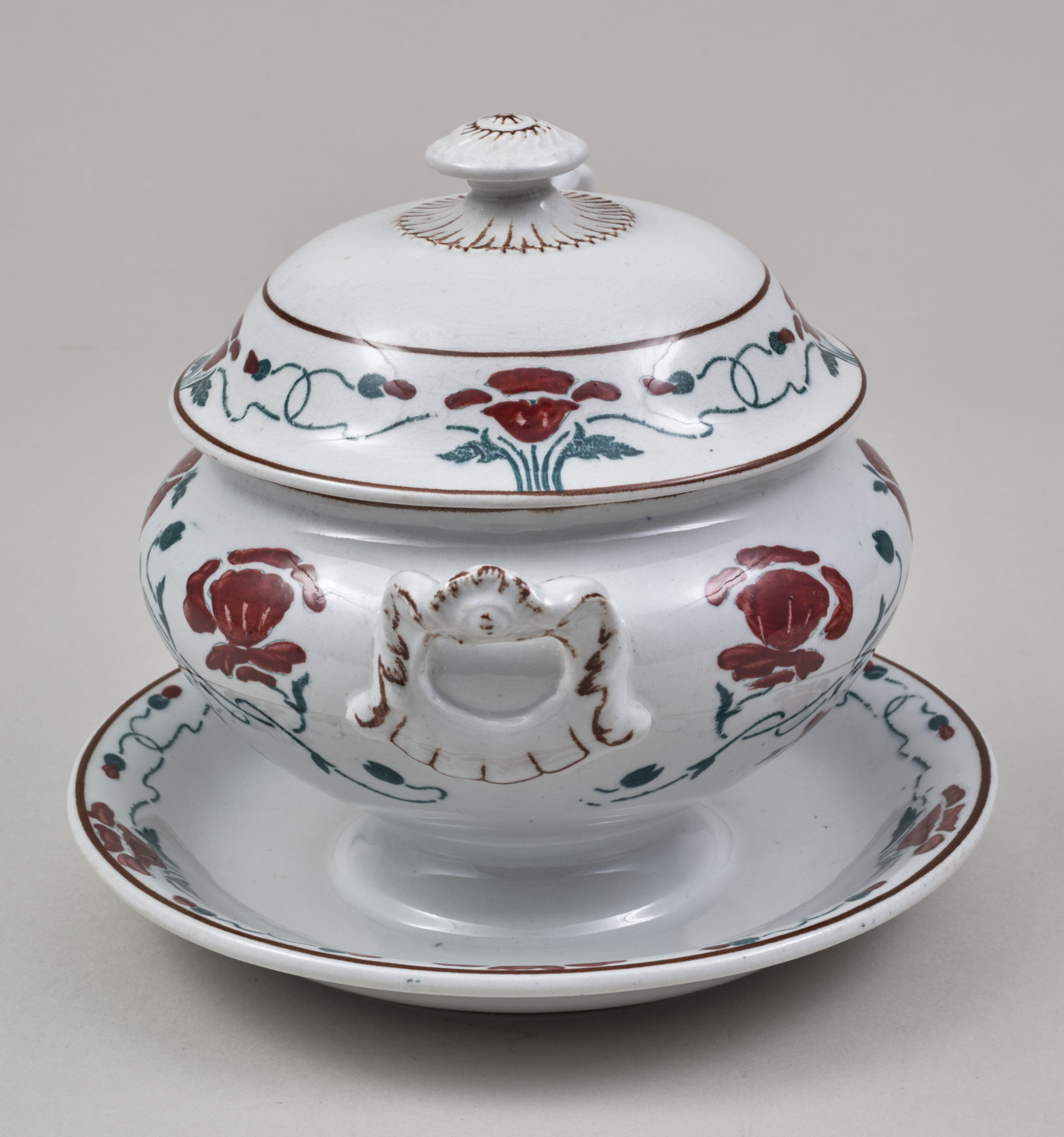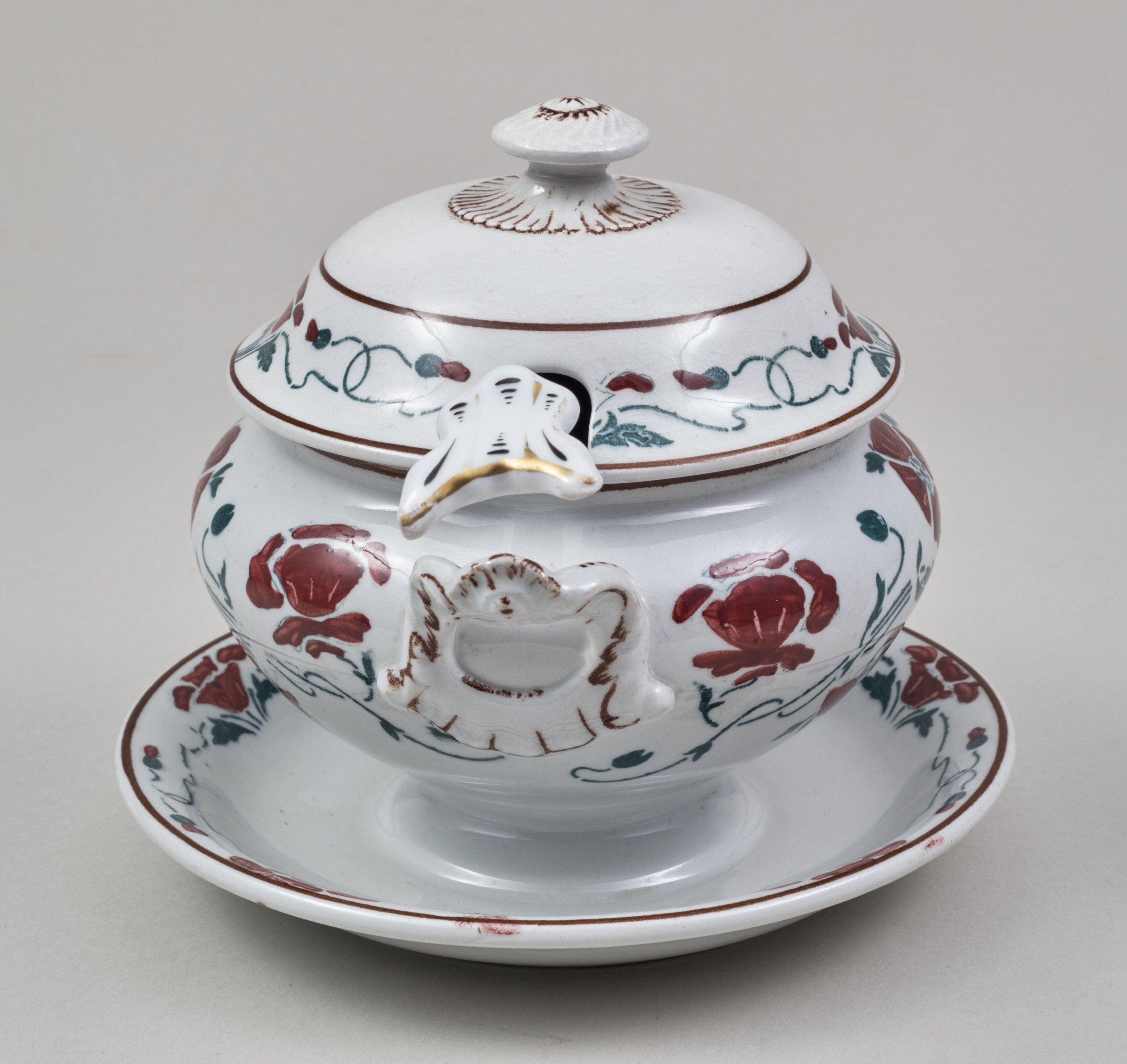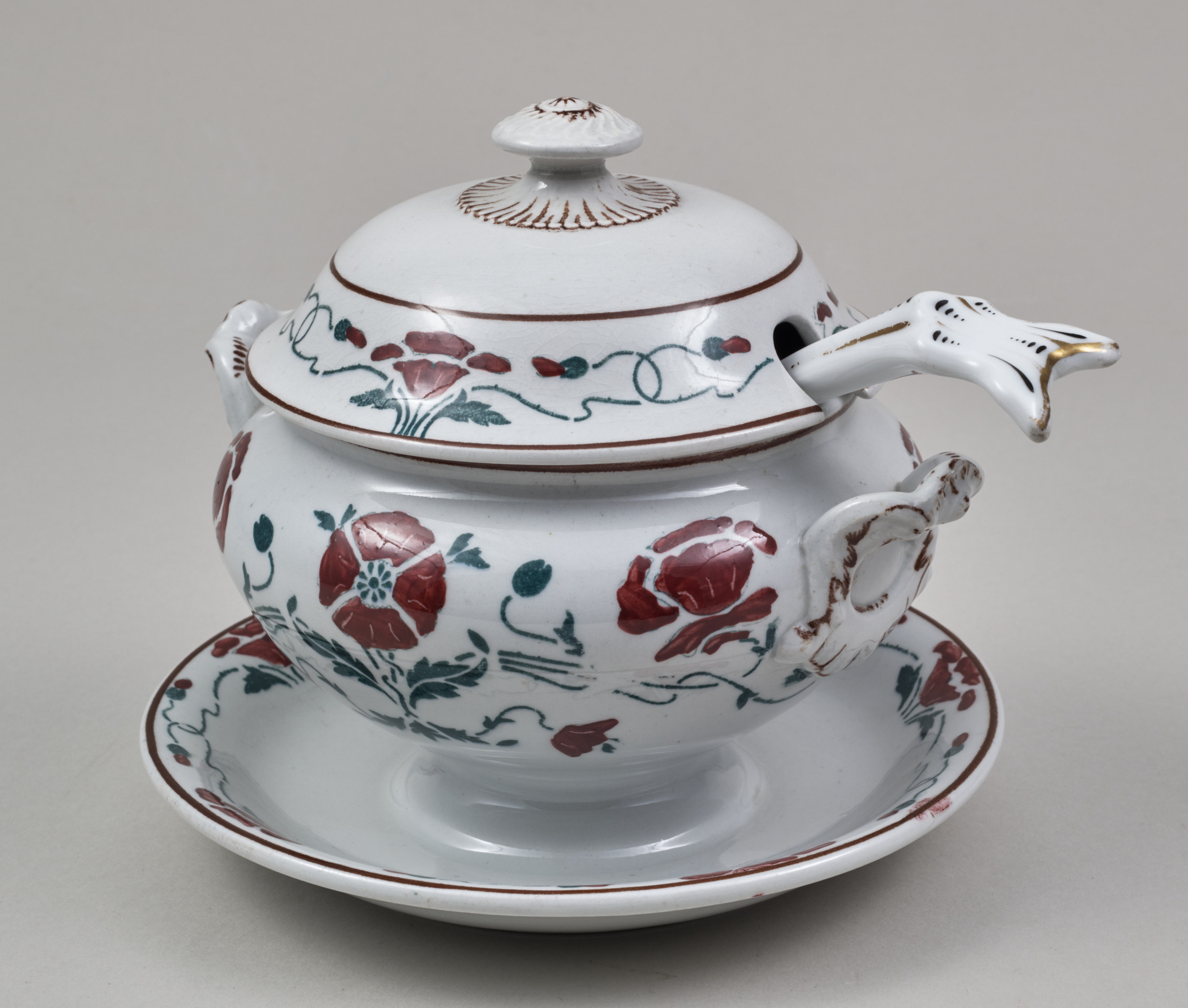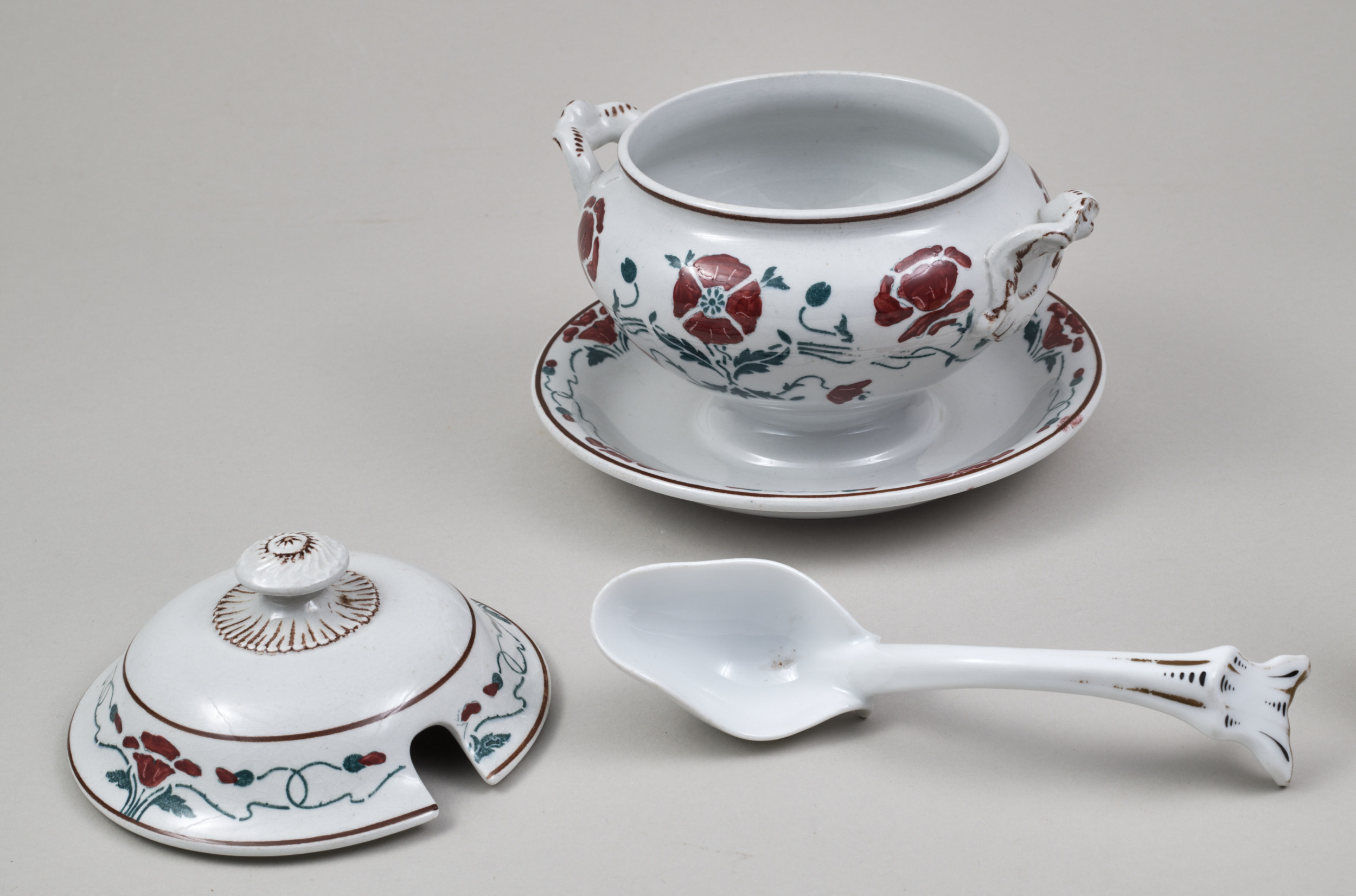 Sosjerka – niewielkie, fajansowe naczynie do sosów, założone na planie koła, składające się z pękatej wazki, jednorodnie połączone z miseczkowatą podstawką w rodzaju spodka i kopulastej pokrywki mającej wcięcie na łyżkę. Kształt wazki daje się porównać do odwróconego stożka. Otwór naczynia dość szeroki, a stopka tak mała, że w wypadku gdyby wazka była wolnostojąca, to nie zapewniłoby jej statyczności. Do szczytu wybrzuszenia wazki przylegają częściowo dwa poziome uchwyty, których kształt kojarzy się z ozdobny kartuszem (dwa esowate ramiona górą spięte guzem, a dołem wachlarzowatym grzebieniem). Uchwyty zdobi plastyczny motyw liści i kwiatu, częściowo podrysowanych brązem. Pokrywka uwypukla się na bliskiej odległości od brzegu i kończy guzowatym uchwytem, mającym za podstawę dużą drobnolistną rozetę, rozłożoną na spłaszczony szczyt wypukłości. Czoło uchwytu pokrywa reliefowana wirująca rozetka, częściowo podrysowana brązem. Brzeg pokrywki (wysunięty ku przodowi, poza obręb otworu wazki) przerywa w jednym miejscu dość głębokie wcięcie, mieszczące swobodnie wystający trzonek łyżki. Naczynie zdobi dekoracja malarska złożona z dwubarwnego wzoru maków, stylizowanych w duchu umiarkowanej secesji. Wzór kwiatowy naniesiony mechanicznie, przez szablon. Obydwie strony brzuśca wazki wypełnia umowny bukiet złożony z pięciu kwiatów, z których jeden stanowi oś kompozycji. Wokół brzegu miseczkowatego spodka i brzegu pokrywki biegnie podobny wzór przyjmujący układ pasowy. Na ogniwo tego składa się kwiat altermowany dwoma paskami. Dekorację malarska naczynia uzupełniają jeszcze 4 prążki, z których pierwsze dwa obrzeżają krawędź spodka i otworu wazki, a pozostałe dwa ujmują wzór zdobiący pokrywkę. Sygnatura warsztatu - kotwica w owalnym polu, pod nią napis: S.B. & S / ENGLAND oraz sygnatura magazynu londyńskiego SOUTH AUDLEY S/ T. GOODE & Co / LONDON. W. Pomiędzy nimi trzy małe, bordowe kropki. W dużej odległości od opisanych znaków występuje cyfra „4”, stemplowana w kolorze czarnym. Duża łyżka porcelanowa, biała odznaczająca się oryginalnym kształtem, dotyczącym szczególnie czerpaka i końcówki trzonka. Czerpak duży, głęboki, przypominający połówkę gruszki, węższym końcem skierowany ku przodowi, gdzie występuje załamanie w dół, powstałe jakby poprzez skośne ścięcie grubego prętu, którego przekrój kojarzy się z rybim ogonem. Dwom trójkątnym rożkom końcówki trzonka odpowiadają podobne dwa rożki sterczące od spodu czerpaka - w miejscu wyjścia trzonka. Te cztery różki umożliwiają poziome położenie łyżki. Łyżkę ozdabia minimalne złocenie, znajdujące się tylko na końcówce trzonka, gdzie występuje w postaci konturu i drobnych kresek podkreślających jego formę. Obiektowi temu brak znaku warsztatu, jest on najprawdopodobniej wyrobem czeskim z 1. poł. XIX w.